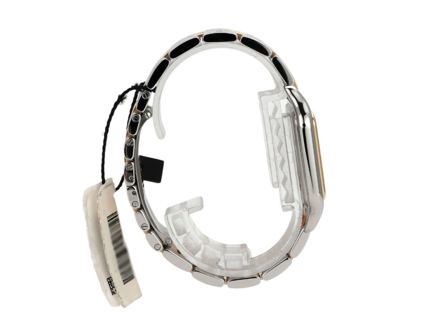 Caixa em aço inoxidável / ouro amarelo polido, diâmetro da caixa 31 x 42 mm, luneta em ouro amarelo polido, bracelete em aço inoxidável / ouro amarelo com fecho desdobrável, mostrador prateado com ponteiros em aço azulado, algarismos romanos, movimento de quartzo, vidro de safira, verso em aço inoxidável aparafusado, resistente à água até 3 bar.