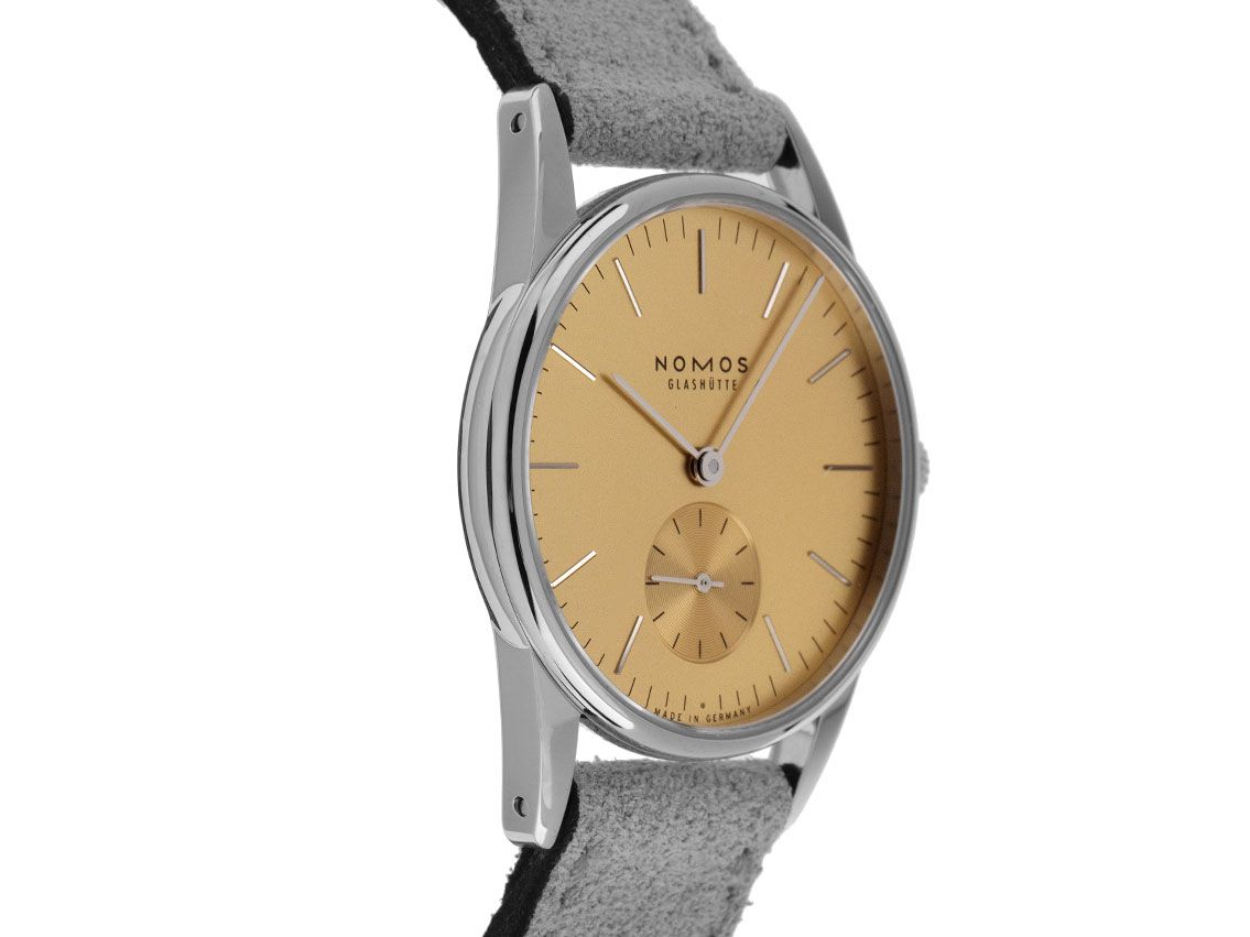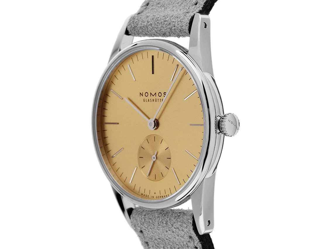 Nomos Glashütte Orion 33 Gold Stahl Handaufzug Armband LederGehäuse Edelstahl dreiteilig, poliert, Gehäusedurchmesser ohne Krone 32mm, Gehäusehöhe 8,5mm. Nomos Armband Veloursleder grau mit Ziernaht, Anstoßbreite 17mm, Stiftschließe Edelstahl mit Hersteller-Logo. Zifferblatt goldfarben galvanisiert, mit Edelstahl Indexen und Edelstahl Zeigern. Uhrwerk Handaufzug, Manufakturkaliber Alpha mit 17 Edelsteinen, Glashütter 3/4 Platine, Gangreserve ca. 43 Stunden. Anzeige von Stunde und Minute über Zeiger aus der Mitte, kleine Sekunde mit Sekundenstopp zur sekundengenauen Einstellung der Uhrzeit bei 6 Uhr. Saphirglas kratzfest, gewölbt. Krone mit Hersteller-Logo. Boden Edelstahl graviert mit Saphirglas Sichtfenster. Gewicht der Uhr inklusive Armband 35g, Wasserdicht bis 3 ATM, Referenznummer: 359, ID: ST116025960525H-1980, Artikelnummer: 10000080204. Original Nomos Box und Garantie Papiere von April 2025, Full Set. Neu. Lieferzeit sofort.