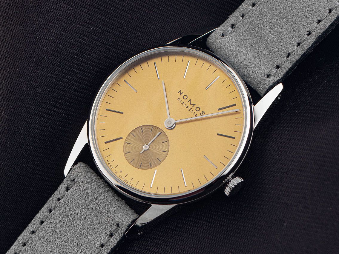 Nomos Glashütte Orion 33 Gold Stahl Handaufzug Armband Leder