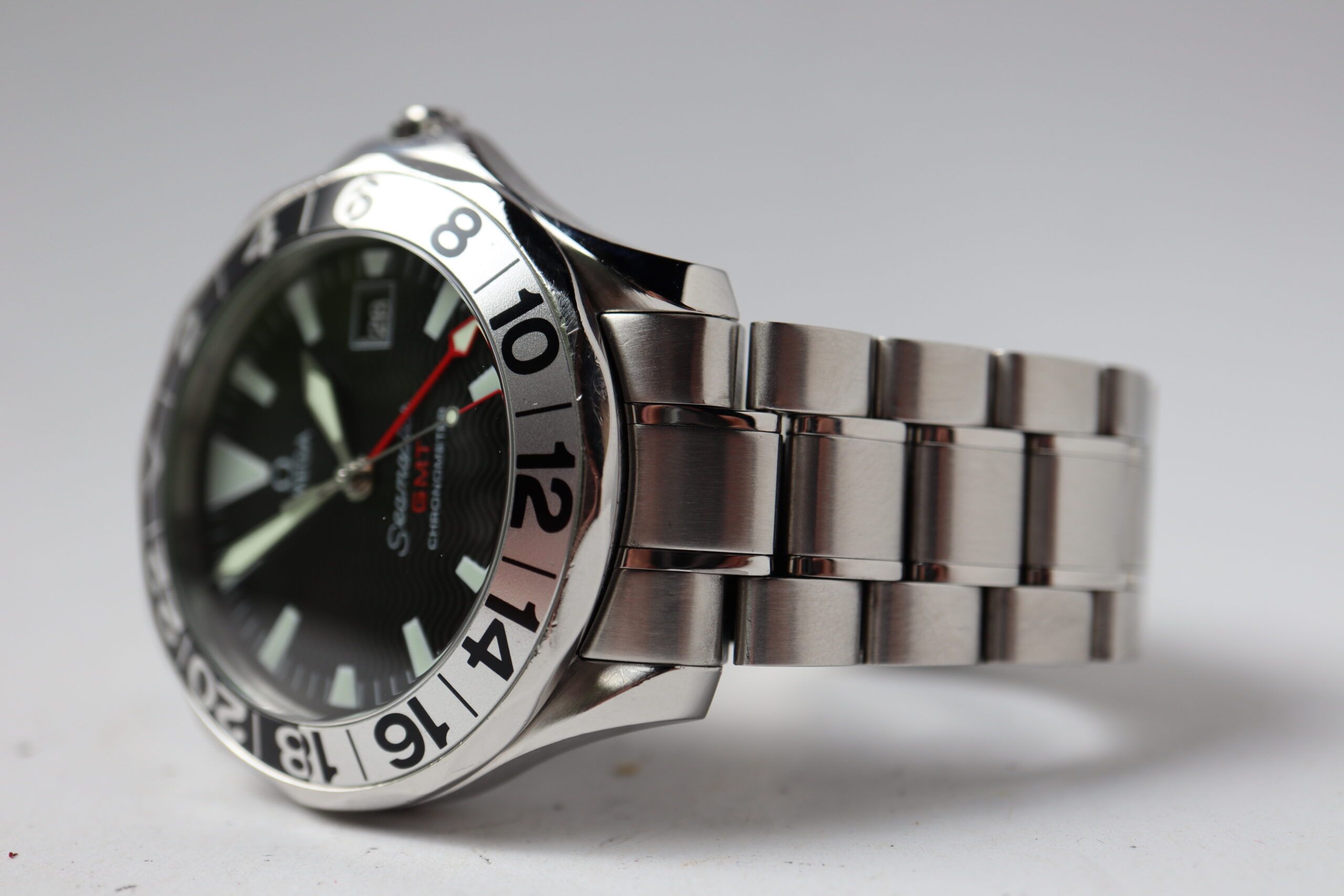 Assinado Omega, Seamaster GMT Cronômetro, Seamaster GMT "50º Aniversário", ref. ST 168.1613, Cal. 1128 movimento de alavanca com acabamento em níquel, 23 joias, tampa de ferro antimagnetica, mostrador preto texturizado, numerais luminosos em bastão e adaga, ponteiros luminosos, ponteiro central luminoso vermelho para o segundo fuso horário, janela para a data, caixa em forma tonneau resistente à água, bezel preto e prateado de 24 horas com separação para horas diurnas e noturnas, garras estriadas, fundo rosqueado com a gravação Seamaster 50 Anos.