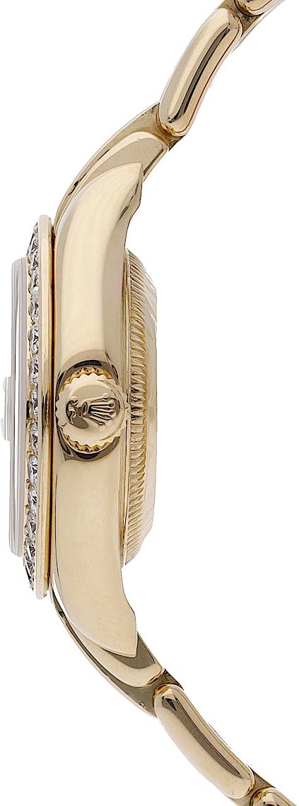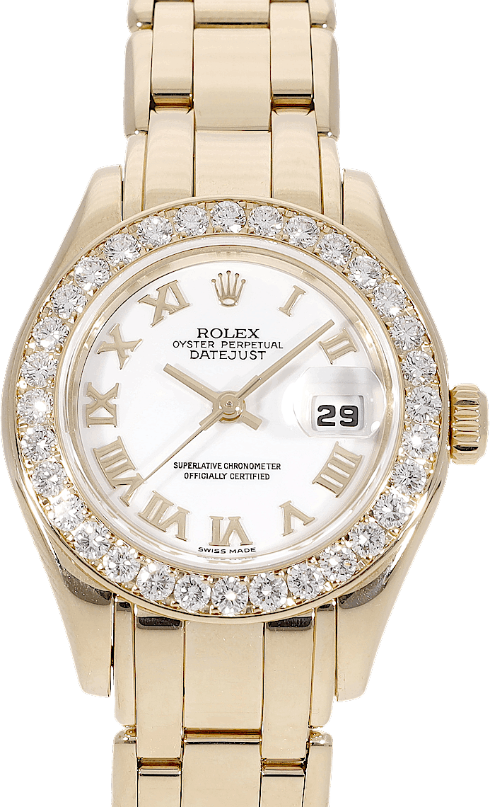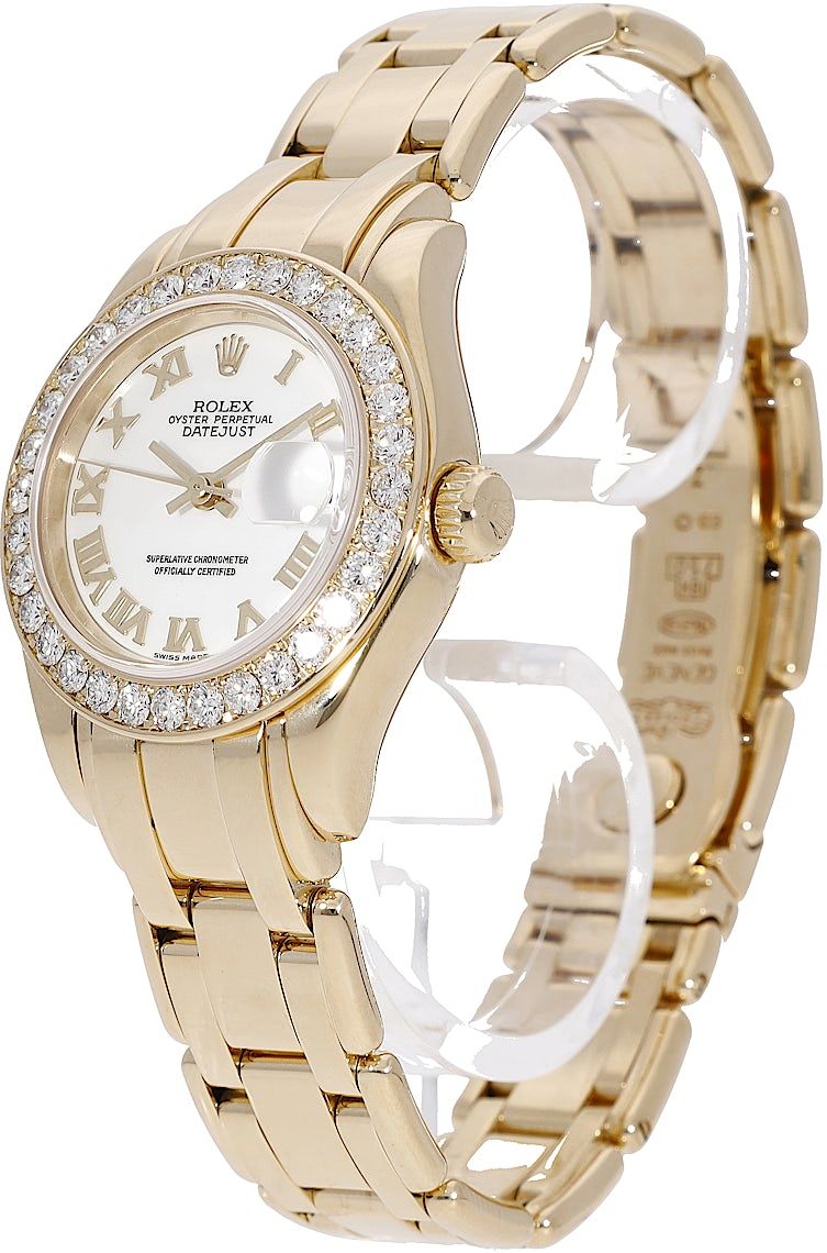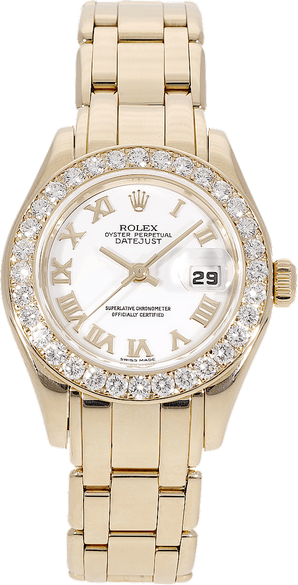 Rolex Pearlmaster, Reference: 69289, Gender: Female, Size: 29mm, Dial color: White, Strap material: Yellow Gold, Movement: Automatic, Condition: Previously worn with some signs of usage. The movement is flawless and the case has been cleaned. watch tested to ensure full functionality. An inspection by our certified watchmakers guarantees its authenticity., Documents: Chronext Certificate
