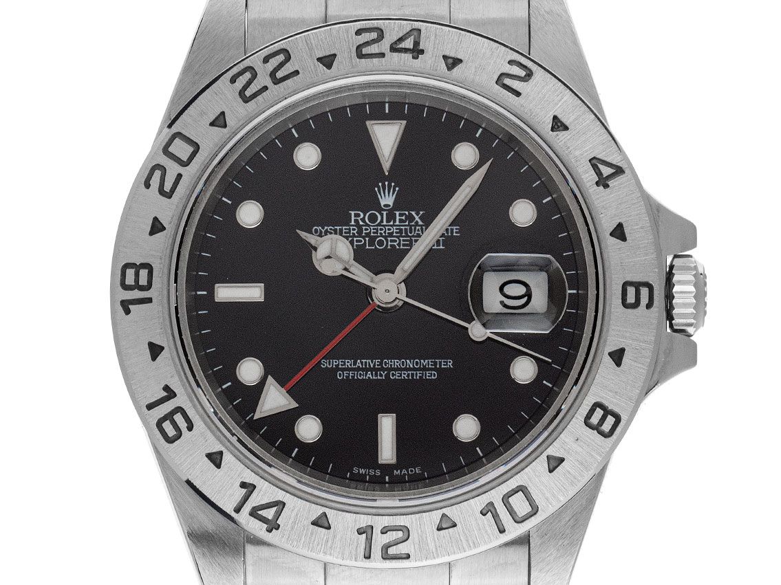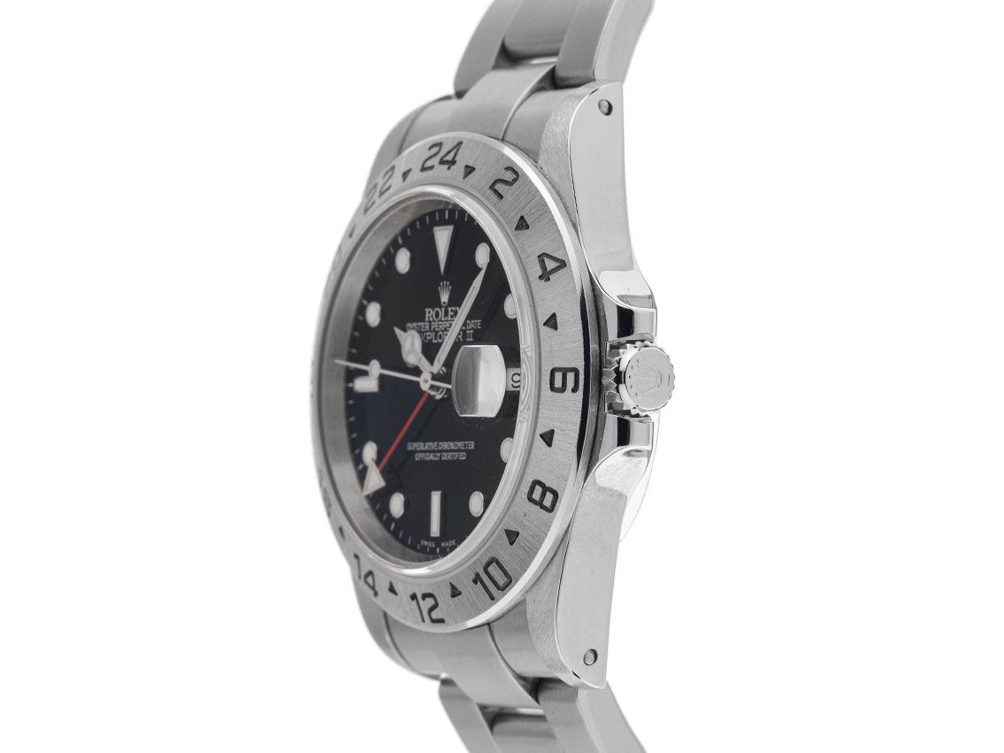 Rolex Explorer II Stahl Automatik Armband OysterGehäuse Edelstahl poliert und satiniert, Gehäusedurchmesser ohne Krone 40mm, Gehäusehöhe 12,3mm. Lünette Edelstahl satiniert mit 24-Stunden-Skala. Armband Oyster Edelstahl satiniert und poliert, Sicherheitsfaltschließe Edelstahl mit Hersteller-Logo. Zifferblatt schwarz mit aufgesetzten weißgoldenen Indexen und weißgoldenen Zeigern. Uhrwerk Automatik, Chronometer, Rolex Manufakturkaliber 3185 mit 31 Edelsteinen. Anzeige von Stunde, Minute und Sekunde über Zeiger aus der Mitte mit Sekundenstopp zur sekundengenauen Einstellung der Uhrzeit, Datumsanzeige mit Schnellverstellung unter Glaslupe bei 3 Uhr, zweite Zeitzone (GMT) ablesbar über Lünette, einstellbar über roten Zeiger aus der Mitte. Saphirglas kratzfest. Krone verschraubbar mit Flankenschutz und Hersteller-Logo. Boden Edelstahl verschraubt. Gewicht der Uhr inklusive Armband 122g, Länge des Armbandes inklusive Gehäuse 185mm. Referenznummer: 16570, Gehäusenummer: K269XXX, Baujahr: 2001, ID: KA1444142360425RE-10200, Artikelnummer: 10000079962. Mit Gangkontrolle und kompletter äußerlicher Aufarbeitung von April 2025. Original Rolex Box mit Umkarton und Beschreibung sowie Ledermäppchen, Übersetzungsheft, Rolex Chronometer-Siegel und Watchregister Auszug von April 2025, The Watch Register Zertifikat / ohne Eintrag (Internationale Datenbank für verlorene oder gestohlene Uhren). Superschnäppchen, Kapitalanlage mit Wertsteigerungspotential, fast nicht getragen. Wie Neu. Lieferzeit sofort.
