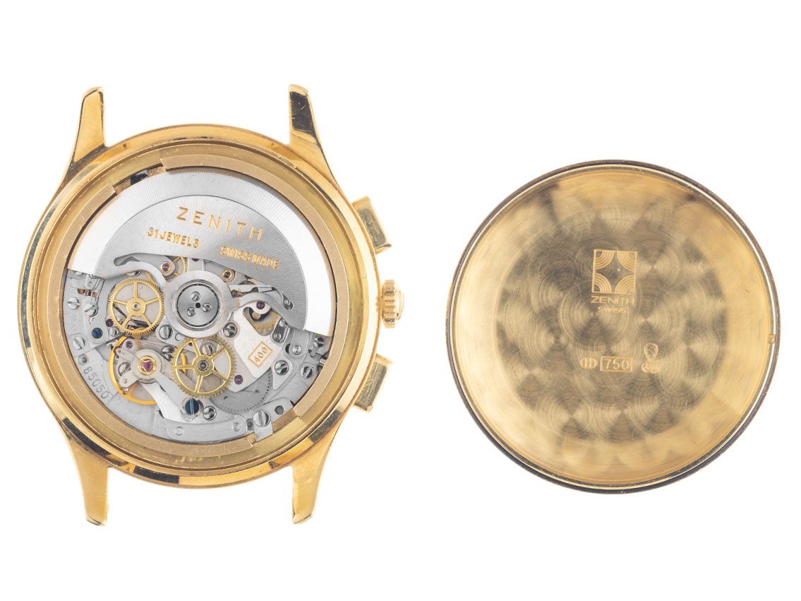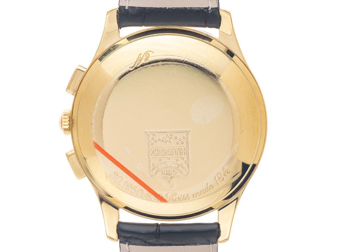 Caixa em ouro amarelo 18kt polido, diâmetro da caixa sem coroa 40mm, altura da caixa 11,7mm. Bezel em ouro amarelo 18kt liso e polido. Pulseira em couro de crocodilo preto com costura decorativa, largura da asa 20mm, fecho de pino em ouro amarelo 18kt. Mostrador branco com números árabes em ouro amarelo aplicados no 12, índices em forma de cunha em ouro amarelo e ponteiros em ouro amarelo. Movimento automático cronógrafo, cronômetro com certificado, calibre El Primero 400 da manufatura Zenith com 31 pedras preciosas. Exibição de horas e minutos através de ponteiros centrais, pequeno segundo às 9 horas, exibição de data com ajuste rápido entre 4 e 5 horas. Vidro de safira resistente a riscos e curvado. Coroa com logotipo do fabricante. Fundo em ouro amarelo 18kt rosqueado e gravado. Peso do relógio incluindo a pulseira 88g. Número de referência: 30.1250.400, ID: KW1510160000525H-13600, número do artigo: 10000080475. Com revisão do movimento e completa restauração externa em junho de 2025. Caixa original da Zenith com embalagem externa e documentos de garantia sem data, além de descrição, fatura de compra original e extrato do Watch Register de maio de 2025, Certificado do Watch Register / sem registro (Banco de dados internacional para relógios perdidos ou roubados), Full Set. Super oportunidade, investimento com potencial de valorização, peça de colecionador muito rara. Muito bom estado. Limitado a 500 exemplares. Prazo de entrega imediato.