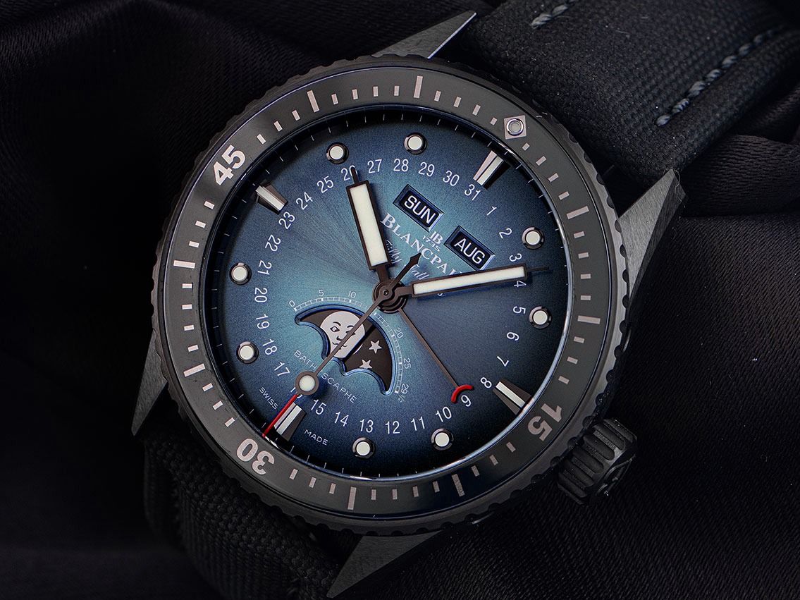 Blancpain Fifty Fathom Bathyscaphe Quantième Complet Phases de Lune Keramik Automatik Armband Segeltuch