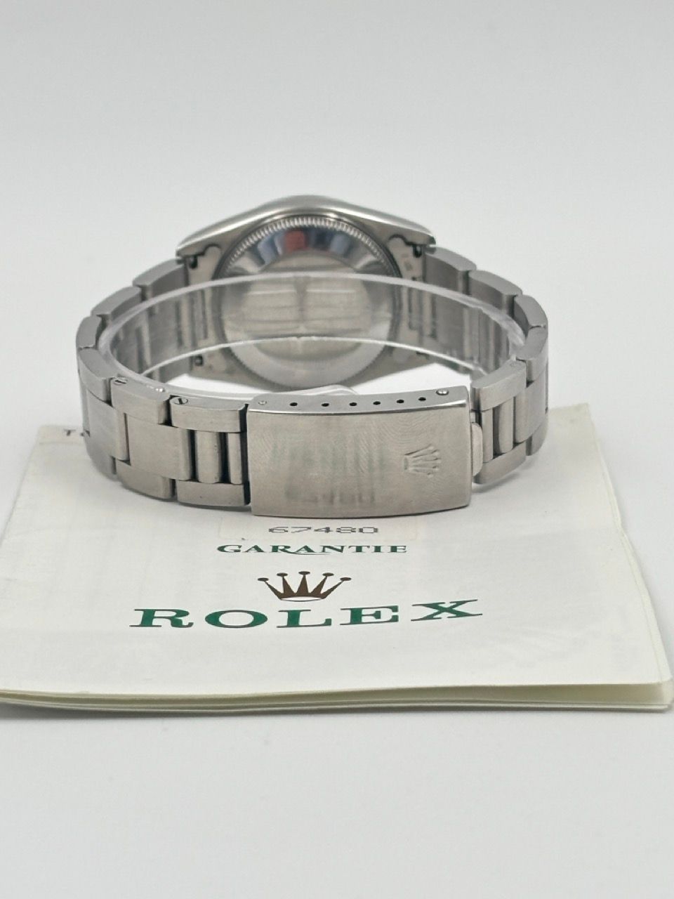 This Rolex Oyster Perpetual 31, reference 67480, is in good overall condition. The watch shows minor signs of wear, including a few small scratches on the crystal and case consistent with regular use.It comes complete with the original warranty papers and was last serviced in September 2007.