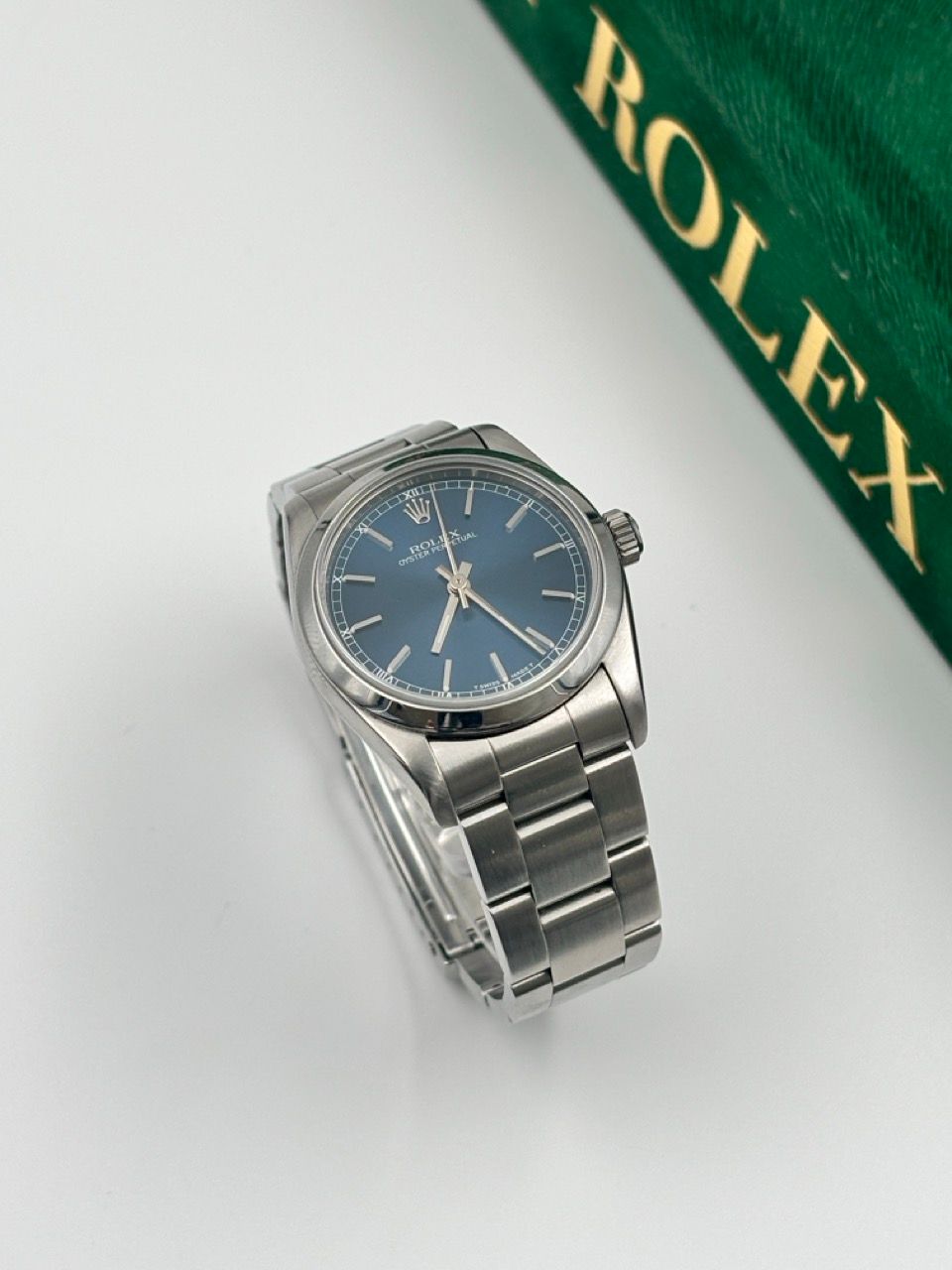 Este Rolex Oyster Perpetual 31, referência 67480, está em bom estado geral. O relógio apresenta pequenos sinais de desgaste, incluindo alguns pequenos riscos no vidro e na caixa, consistentes com o uso regular.
