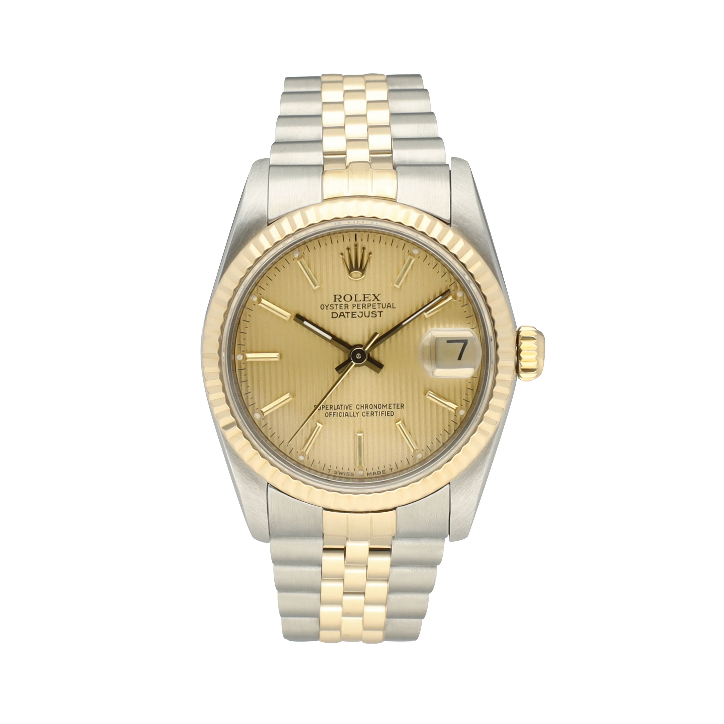 The Rolex Datejust 31 with reference 68273 from 1987 comes including the original box, papers and hang tag. This charming configuration features a beautiful champagne tapestry dial, giving the watch a warm and distinctive vintage look that pairs perfectly with its classic two-tone design.This piece has received a full service, ensuring that both the movement and external condition are in excellent shape. The 31 mm case is crafted from Oystersteel and 18-carat yellow gold, topped with a yellow gold fluted bezel, and paired with the timeless two-tone Jubilee bracelet.