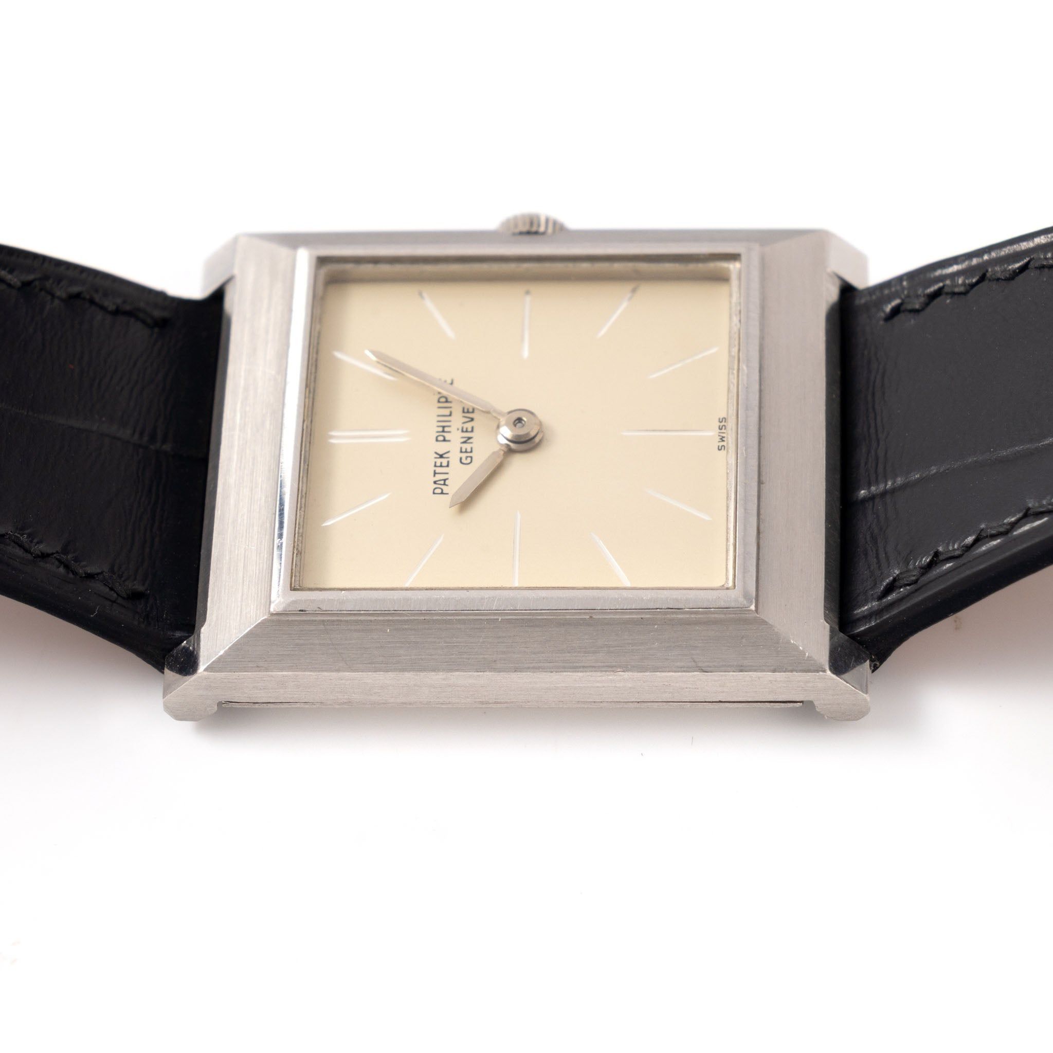This stunning Patek Philippe Ref. 3404 in "heavy metal" platinum is a true gem from the glamorous mid-1960s. Its sleek square case, measuring 27.5 x 33 mm, exudes understated elegance, perfect for special occasions or to elevate your everyday style with a touch of timeless class. Rare in platinum—only a handful have ever appeared on the market, this piece boasts a fascinating detail: the “crystal” is actually glass—flat on top and carved from the inside, which creates a mesmerizing visual over the silver dial, with the hour markers engraved directly into the metal for a subtle, luxurious touch. The square case was meticulously crafted by the esteemed case maker Markowsky, renowned for creating some of the most iconic and refined cases in Patek Philippe’s storied history. And those prominent 22 mm lugs? They demand a broader strap, amplifying the watch’s commanding presence on the wrist—more bold than mere elegance, a true statement piece. Fitted with a beautiful leather strap and original Patek Philippe 18k white gold pin buckle, this watch is as comfortable as it is captivating. Plus, it comes with a Patek Philippe Extract from the Archives, confirming its birth in 1965 and its sale later that year in October—adding a layer of history to its undeniable charm. Fully serviced by our expert watchmaker, this timepiece boasts the hand-wound Caliber 23-300, ready to adorn your wrist with its timeless allure. Rare, elegant, and undeniably captivating—this platinum Patek Philippe is destined to be the crown jewel of any collection. Reach out now and let this exquisite piece become yours. Specifications: Patek Philippe “Gondolo “ reference 3404P Rare Platinum case with 22 mm lugs , snapback 27.5 x 33 mm case size (measured without the lugs) No Lume Silver dial with hand engraved hour indexes Caliber 23-300 hand-wound movement Movement number no 798xxxx / case no 263xxxx dating to 1965 Coming on the photographed leather strap with 18k white gold Patek' pin buckle Patek Philippe Extract from the Archives, stating a date of manufacture in 1965 and a date of sale in October of the same year. Fully serviced by our watchmaker One-year mechanical warranty Free worldwide FedEx Priority shipping