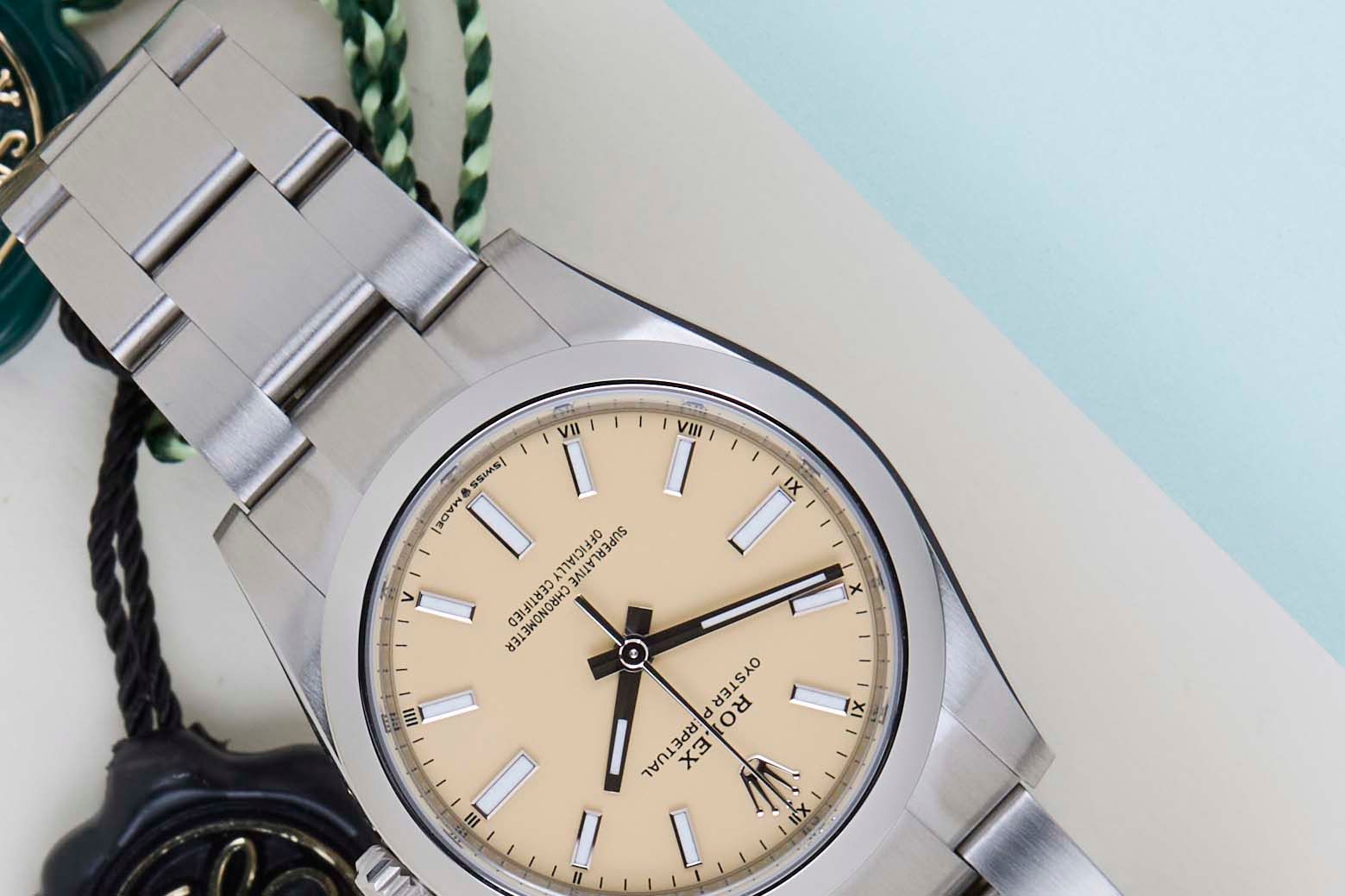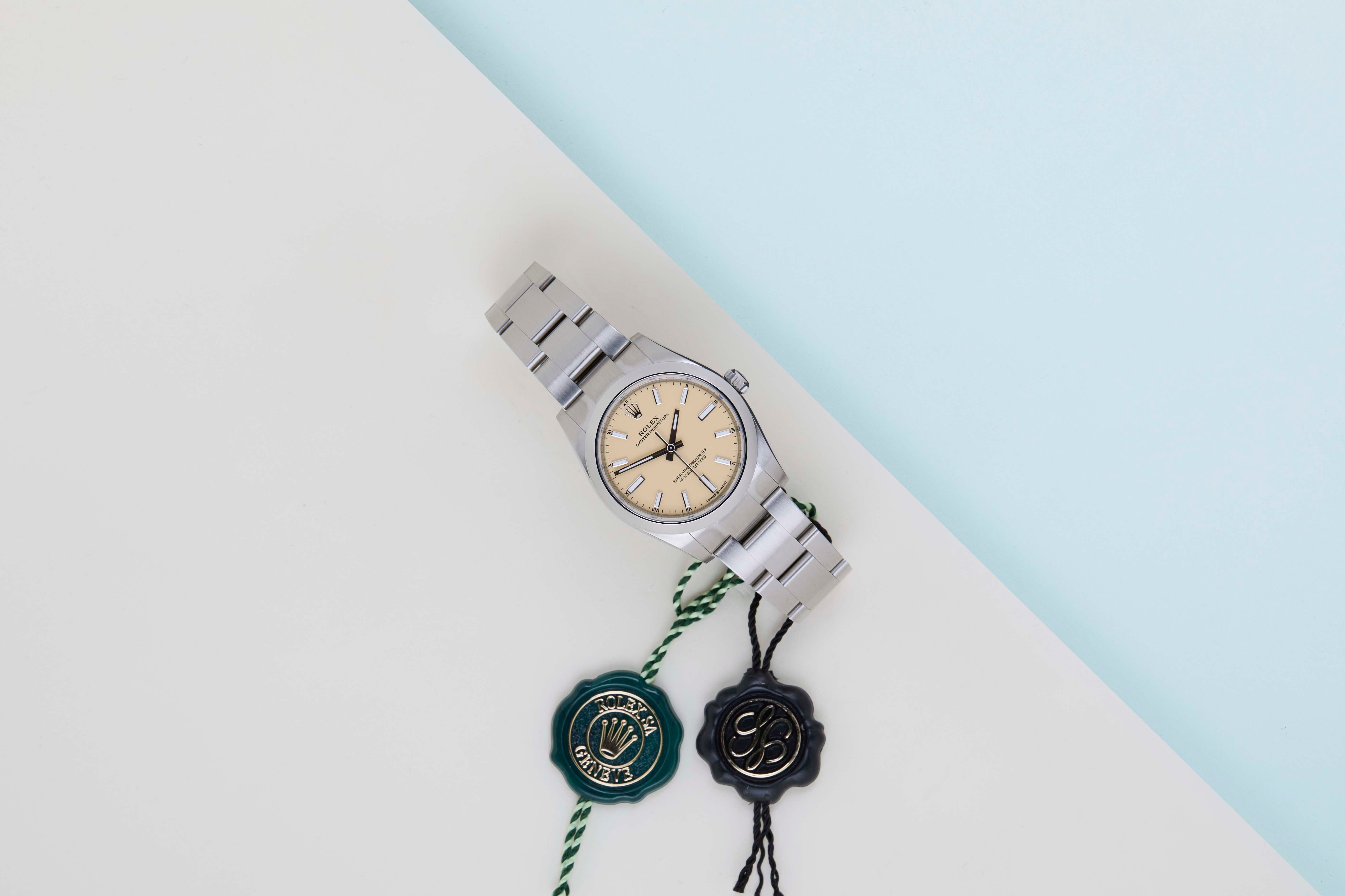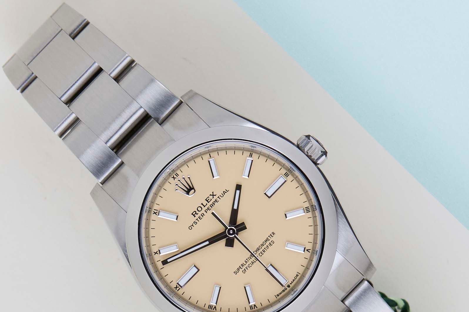 New & Unworn | Full Set | International Rolex Warranty until June 2030 The Rolex Oyster Perpetual was first introduced by Rolex in the 1930s. It is characterized by its water-resistant Oyster case and self-winding Perpetual movement. The Rolex Oyster Perpetual is a simple, yet elegant timepiece that is suitable for both casual and formal wear.This Rolex Oyster Perpetual 34 'Beige Dial' was sold for the first time in June 2025.The watch is fully made out of stainless steel. Rolex uses 904L in its steel watches, which is an extremely resistant and highly polishable superalloy.This Rolex Oyster Perpetual 34 is in New & Unworn condition and comes with the original Rolex Warranty Card and box. Furthermore, the watch still has Worldwide Rolex Warranty until June 2030.