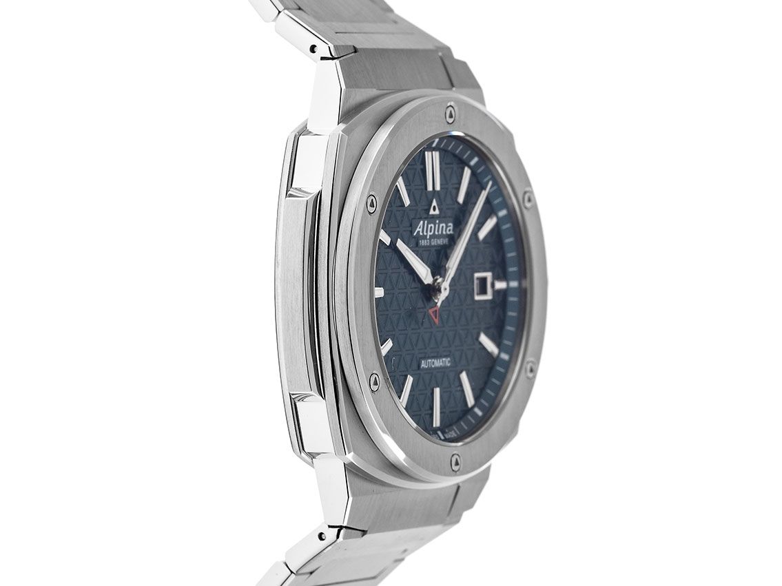 Alpina Alpiner Extreme Stahl Automatik Armband StahlGehäuse Edelstahl poliert und satiniert, Gehäusedurchmesser ohne Krone 41mm, Gehäusehöhe 11,5mm. Lünette Edelstahl 6-fach verschraubt, poliert und satiniert. Armband Edelstahl poliert und satiniert, verdeckte Doppelsicherheitsfaltschließe Edelstahl mit Hersteller-Logo. Zifferblatt blau mit aufgesetzten Edelstahl Leuchtindexen und Leuchtzeigern. Uhrwerk Automatik, Kaliber Alpina AL-525 mit 26 Edelsteinen. Anzeige von Stunde, Minute und Sekunde über Zeiger aus der Mitte mit Sekundenstopp zur sekundengenauen Einstellung der Uhrzeit, Datumsanzeige mit Schnellverstellung bei 3 Uhr. Saphirglas kratzfest. Krone verschraubbar mit Hersteller-Logo. Boden Edelstahl 6-fach verschraubt und graviert mit Saphirglas Sichtfenster. Gewicht der Uhr inklusive Armband 164g, Länge des Armbandes inklusive Gehäuse 200mm. Wasserdicht bis 20 ATM. Referenznummer: AL-525TB4AE6B, Gehäusenummer: 3961XXX, ID: ST254623760323H-1995, Artikelnummer: 10000069054. Original Alpina Box mit Umkarton und Garantie Papiere, Full Set. Neu. Lieferzeit sofort.
