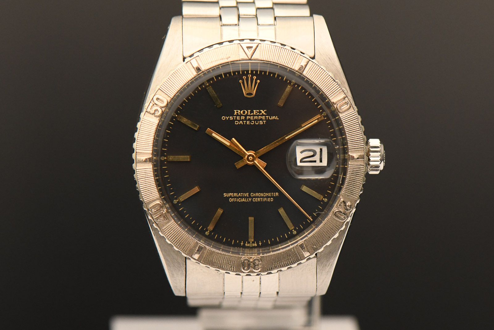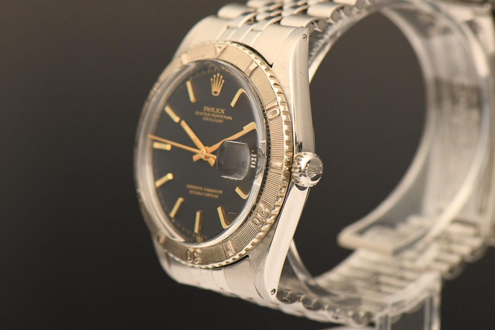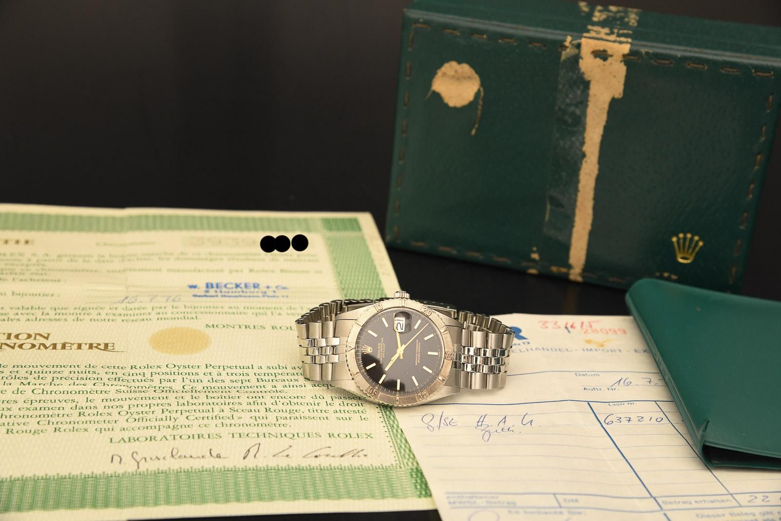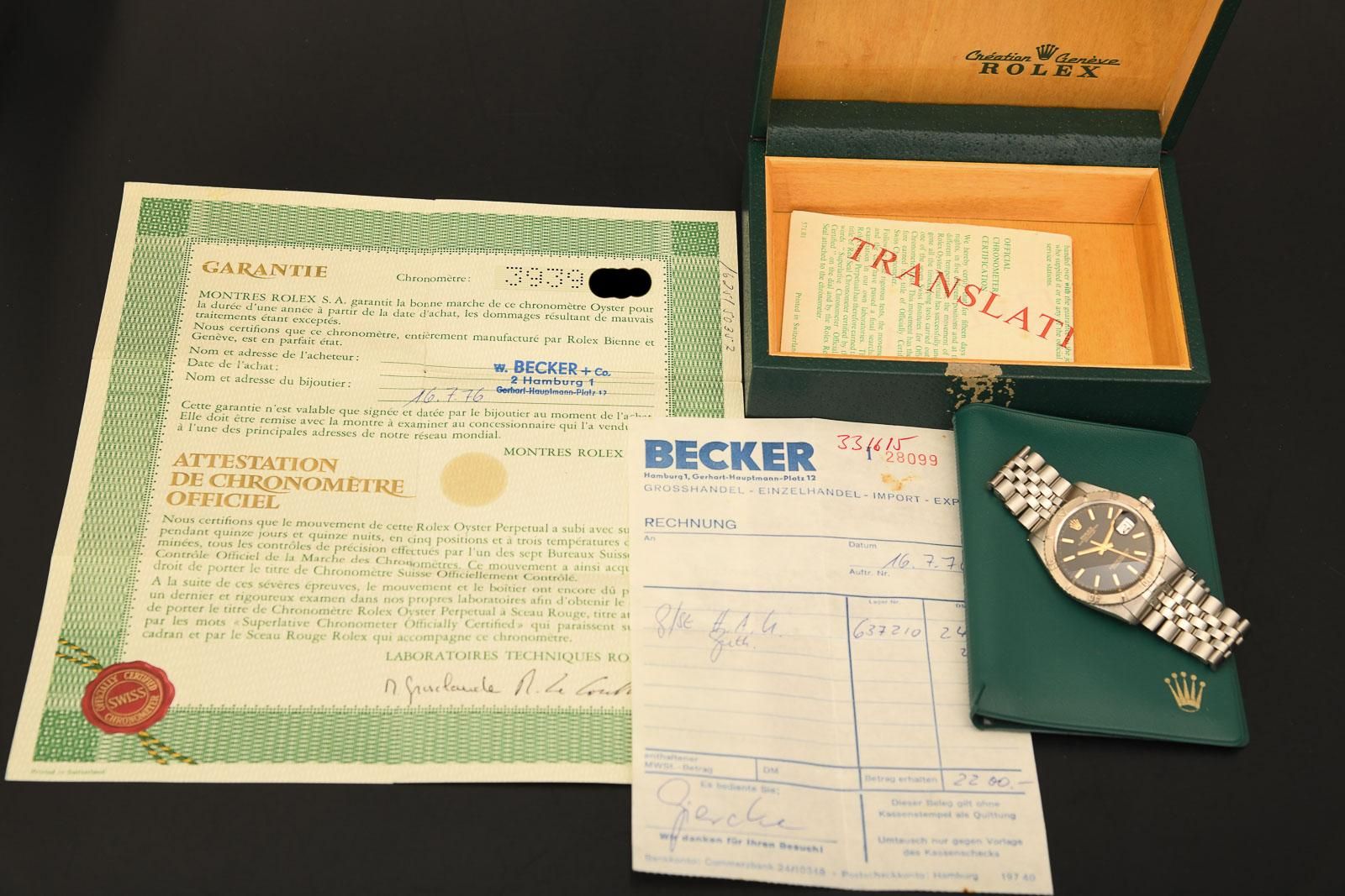 ROLEX 1625 TOG 1974 Rolex Turn o Graph FULL SET. Beautiful Turn o Graph in steel with white gold bezel. The watch was produced in 1974 and sold by Juwelier Becker in Hamburg in 1976. In addition to the original papers, the original purchase receipt from 1976 is also included. The case and strap are in very good condition for their age and have been recently refurbished. Unfortunately, the original box is no longer in very good condition and the inner board is missing, but the accompanying papers are all complete and well preserved. The movement is very clean and oscillates with a strong amplitude of 270 degrees. Under normal circumstances, therefore, no servicing will be required in the near future. A beautiful and, with its black dial, certainly rare watch of the reference 1625.