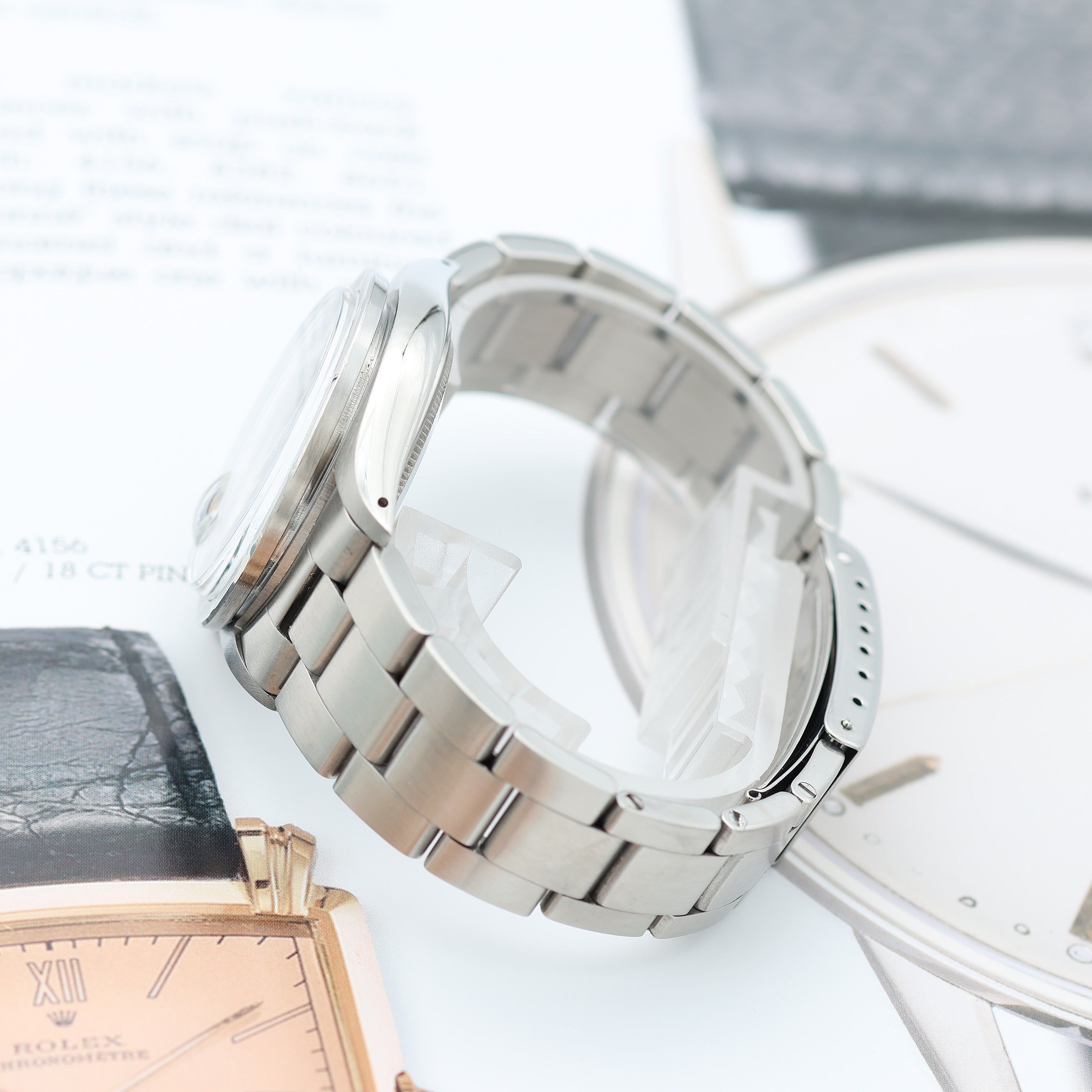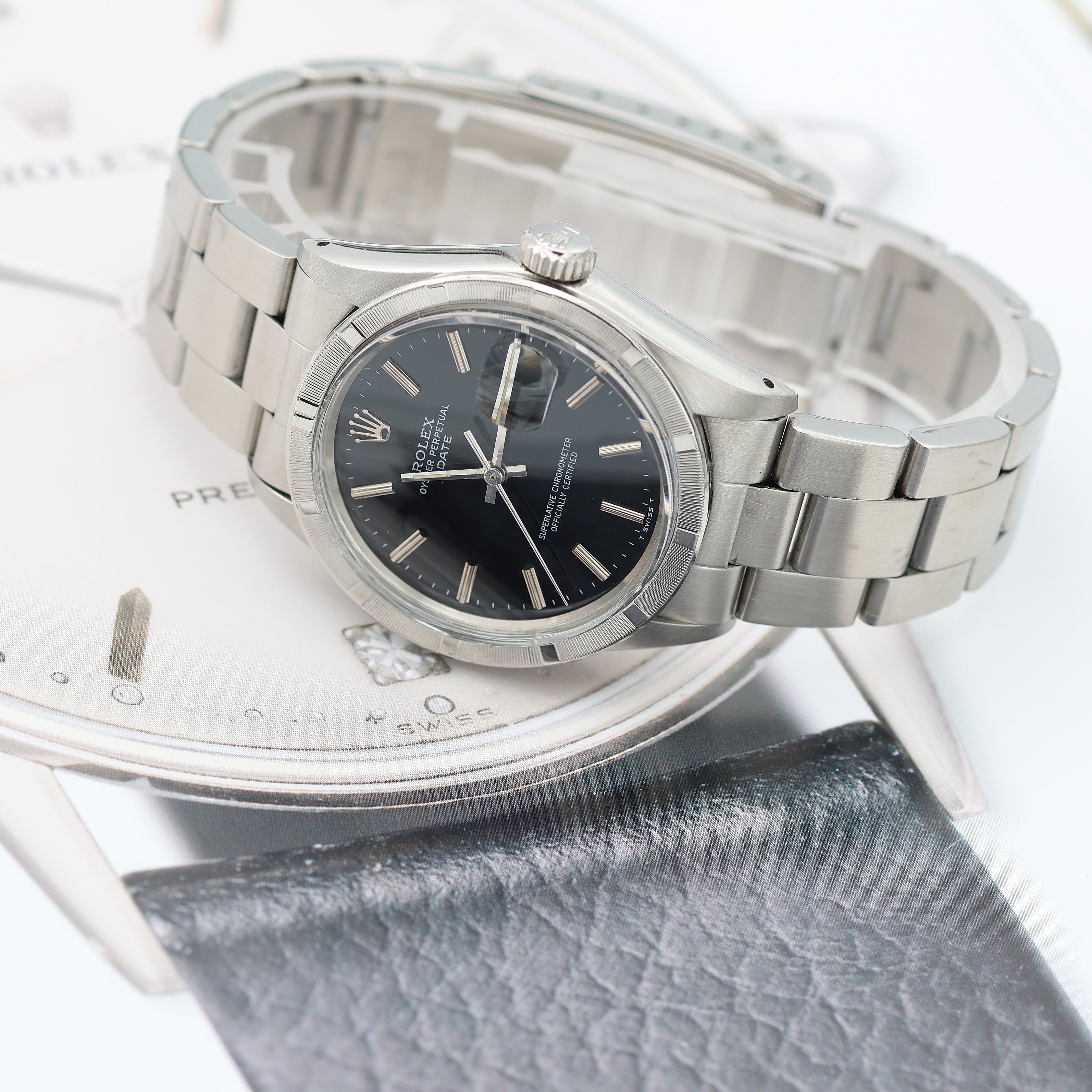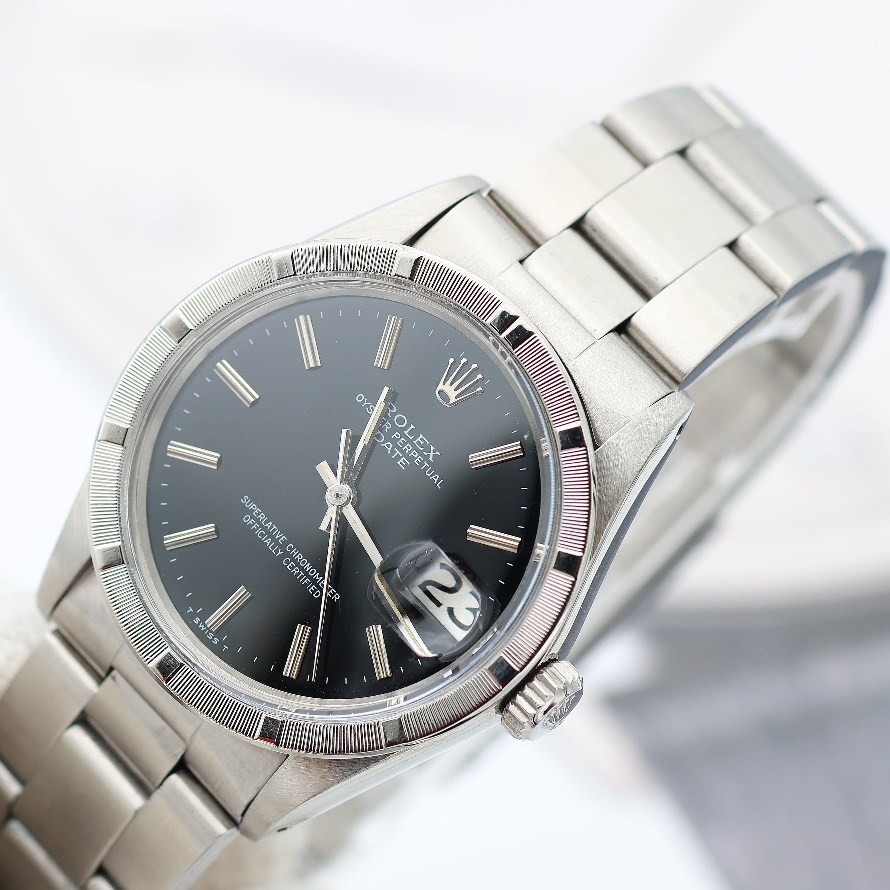 For sale at Debonar Watches: pre-owned Rolex Date 1501 with a sportive black dial on top of a solid Oyster bracelet. The key factor that separates the Rolex Date ref. 1501 from the standard Datejust of the same era is its slightly smaller case. While the classic size of the men’s Rolex Datejust is 36mm, the case size of Rolex Date measures 34mm, similar to the Air-King and Oyster Perpetual models that Rolex was producing at that time. This watch presents a deep black dial. The dial also presents a Cyclops window above the date aperture for better clarity. An engine turned bezel, matching metal Oyster bracelet and screw-down crown complete the watch’s sleek look.Like other vintage Rolex watches, the reference 1501 Date is fitted with an acrylic crystal (plastic/plexiglass).Ref 1501 does not disappoint. Released in the 1970s, this vintage watch offers a classic design that never goes out of style. BRAND ROLEX MODEL OYSTER PERPETUAL DATE REFERENCE 1501 CASE MATERIAL STEEL MOVEMENT AUTOMATIC DIMENSION 34 MM DIAL BLACK BEZEL STEEL CRYSTAL PLEXIGLASS BRACELET TYPE OYSTER BRACELET MATERIAL STEEL BRACELET LENGHT 17 CM ORIGINAL BOX NO ORIGINAL PAPERS NO YEAR Approx. '70s CONDITION EXCELLENT