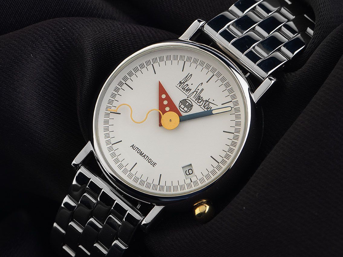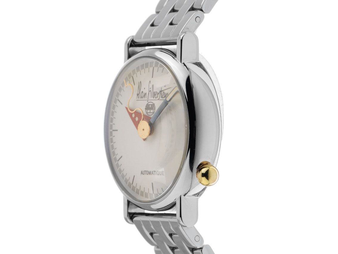Gehäuse Edelstahl poliert, Gehäusedurchmesser ohne Krone 35mm, Gehäusehöhe 10,8mm. Braçadeira Edelstahl poliert, Doppelfaltschließe Edelstahl mit Hersteller-Logo. Zifferblatt weiß mit schwarzen Indexen und bunten Zeigern. Relógio automático, calibre 2892. Indicação do tempo (rot), dos minutos (blau) e da semana (dourado) através de um marcador de tempo com um botão de paragem para indicar a hora, indicação de data com indicação de velocidade até às 4 horas. Saphirglas kratzfest. Coroa a partir das 4 horas. Corpo em Edelstahl verschraubt und graviert mit Saphirglas Sichtfenster. Peso incluindo a braçadeira 94g, Largura da braçadeira incluindo a gehäuse 175mm. ID: P126238000725H-5600, Artikelnummer: 10000081653. Mit Gangkontrolle und kompletter äußerlicher Aufarbeitung von Juli 2025. Caixa original Alain Silberstein com Umkarton und Garantie Papiere von März 1994 sowie Beschreibung, Wechselarmband und Bandwechselwerkzeug, Full Set. Kapitalanlage mit Wertsteigerungspotential, extrem seltenes Sammlerstück. Limitado a 999 exemplares. Como novo. Lieferzeit sofort.