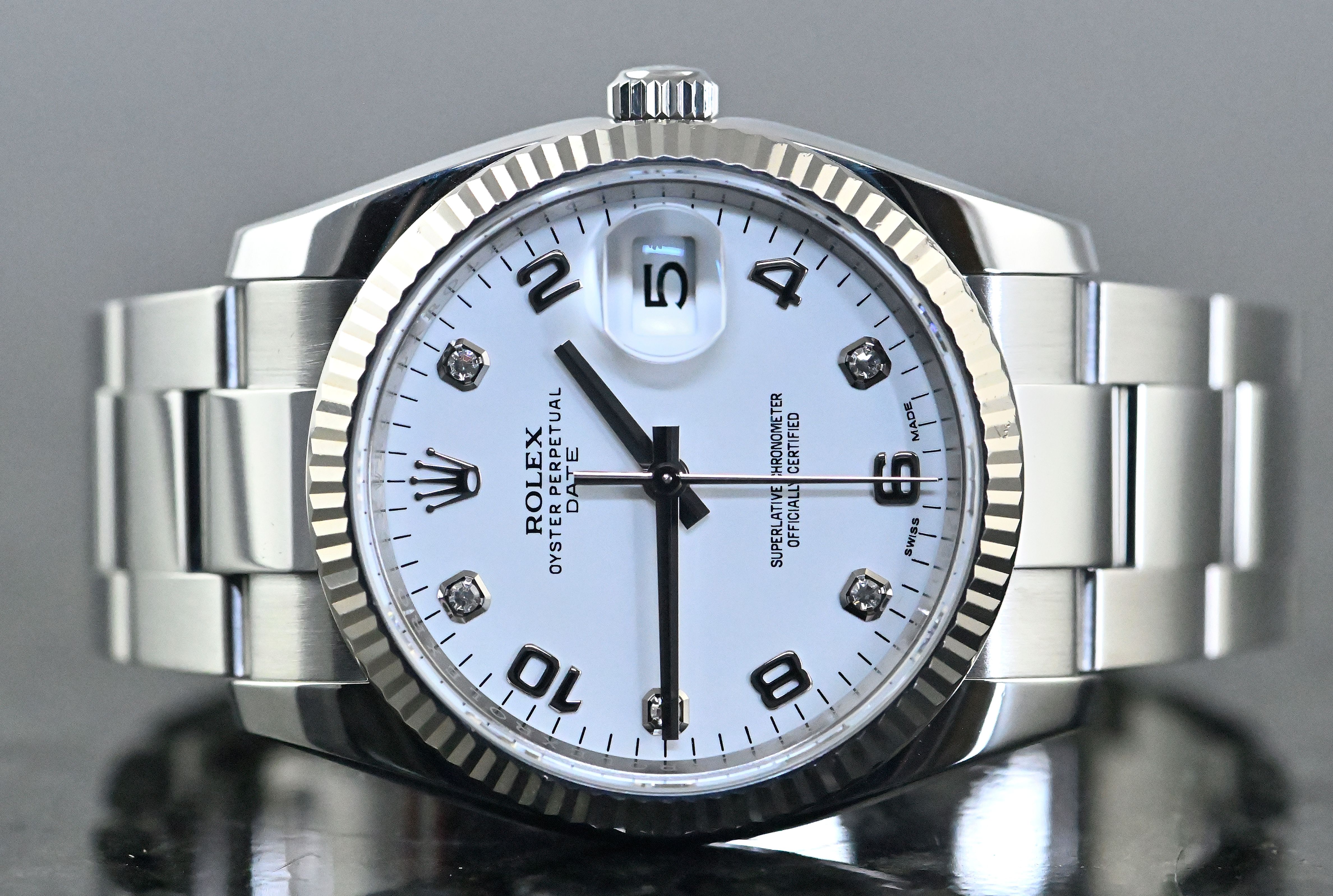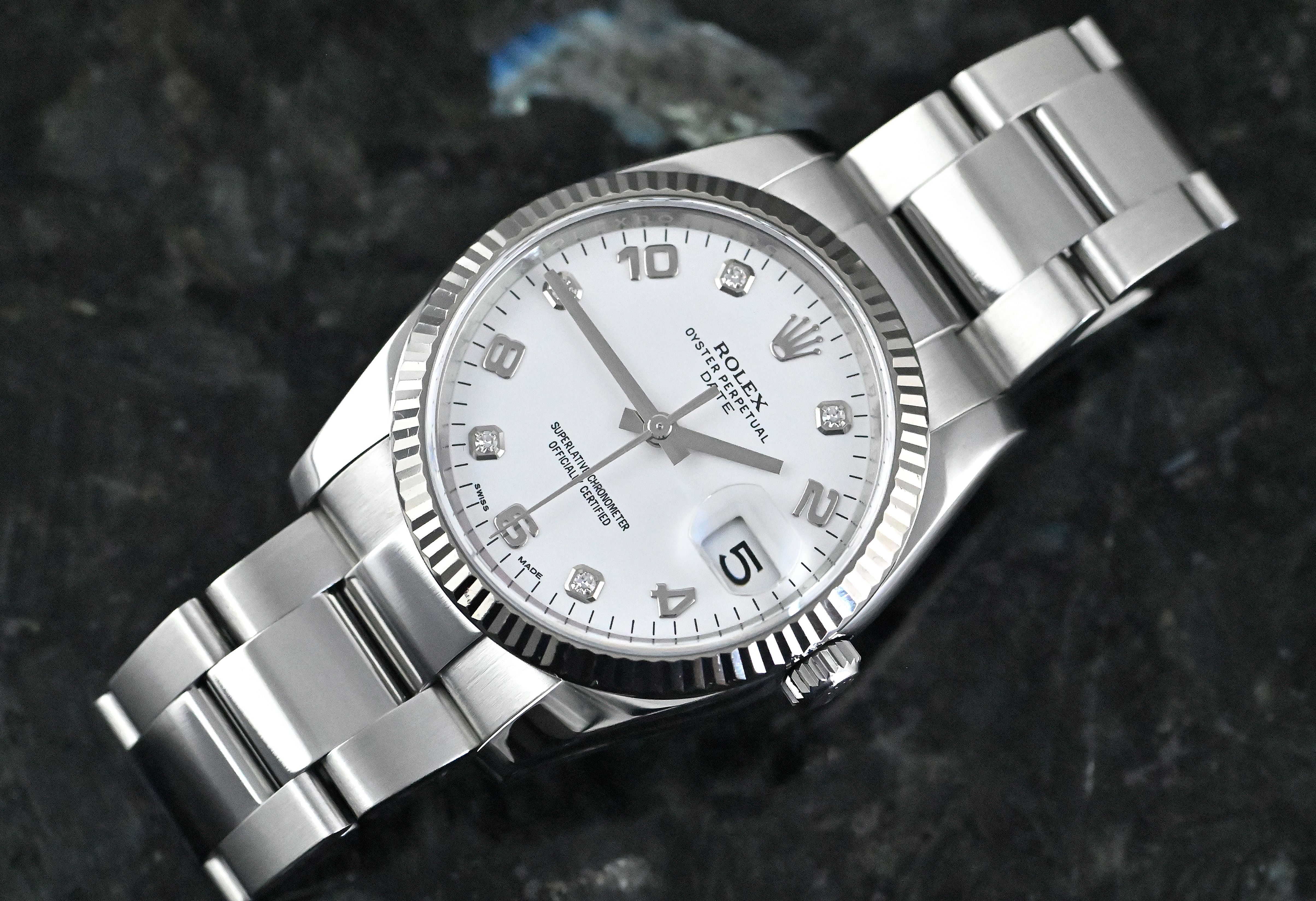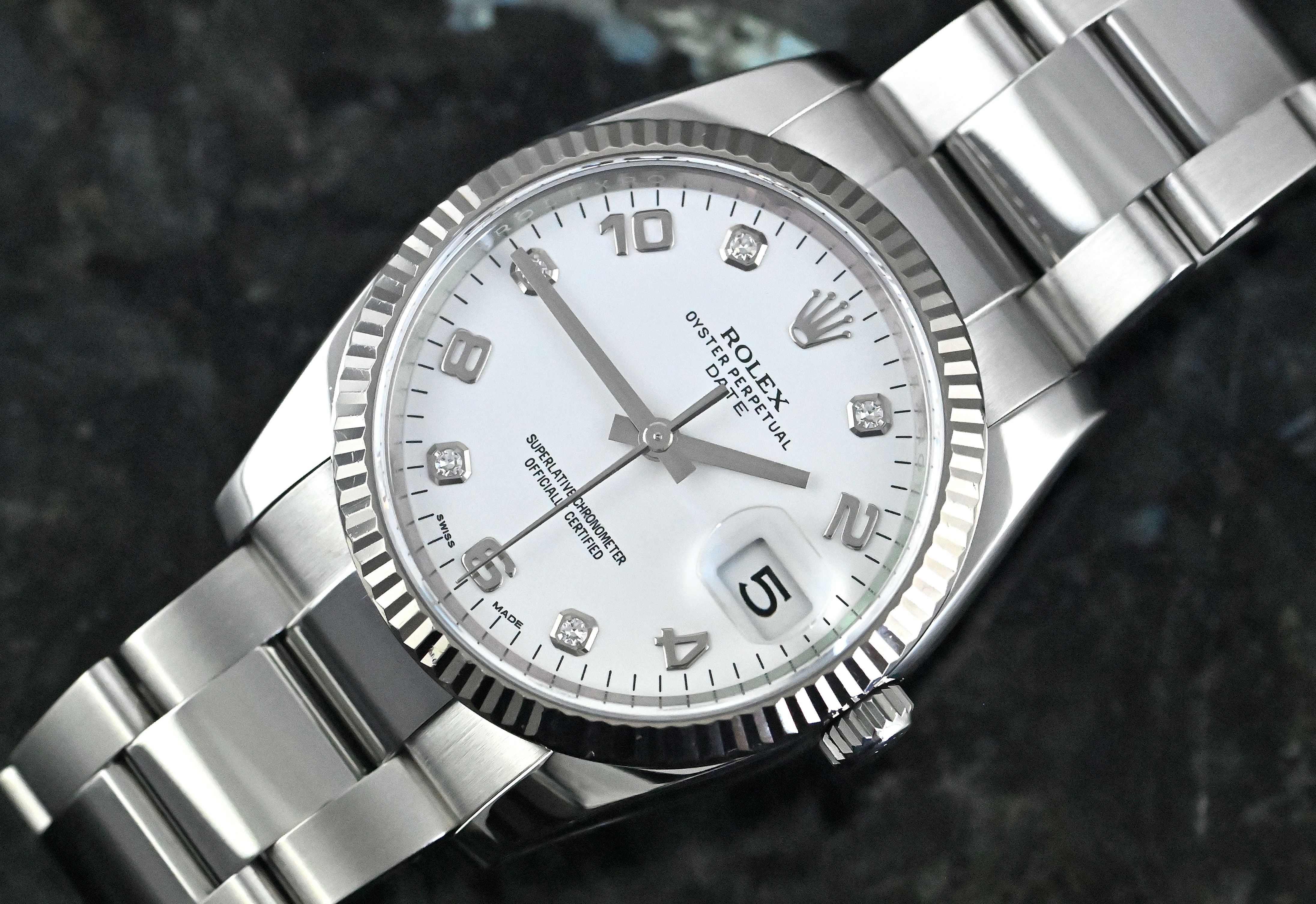Rolex Oyster Perpetual Date 34 ‘white diamond dial’ | reference 115234 | in steel | SEL Oyster bracelet | fluted bezel in 18k white gold | Rolex automatic calibre 3135 | white dial with diamond and Arabic indices | very good condition | full set with original Rolex box and outer carton - warranty card LC100 (sold in April 2017 - Germany) - booklets - chronometer hang tag - three dismantled elements.