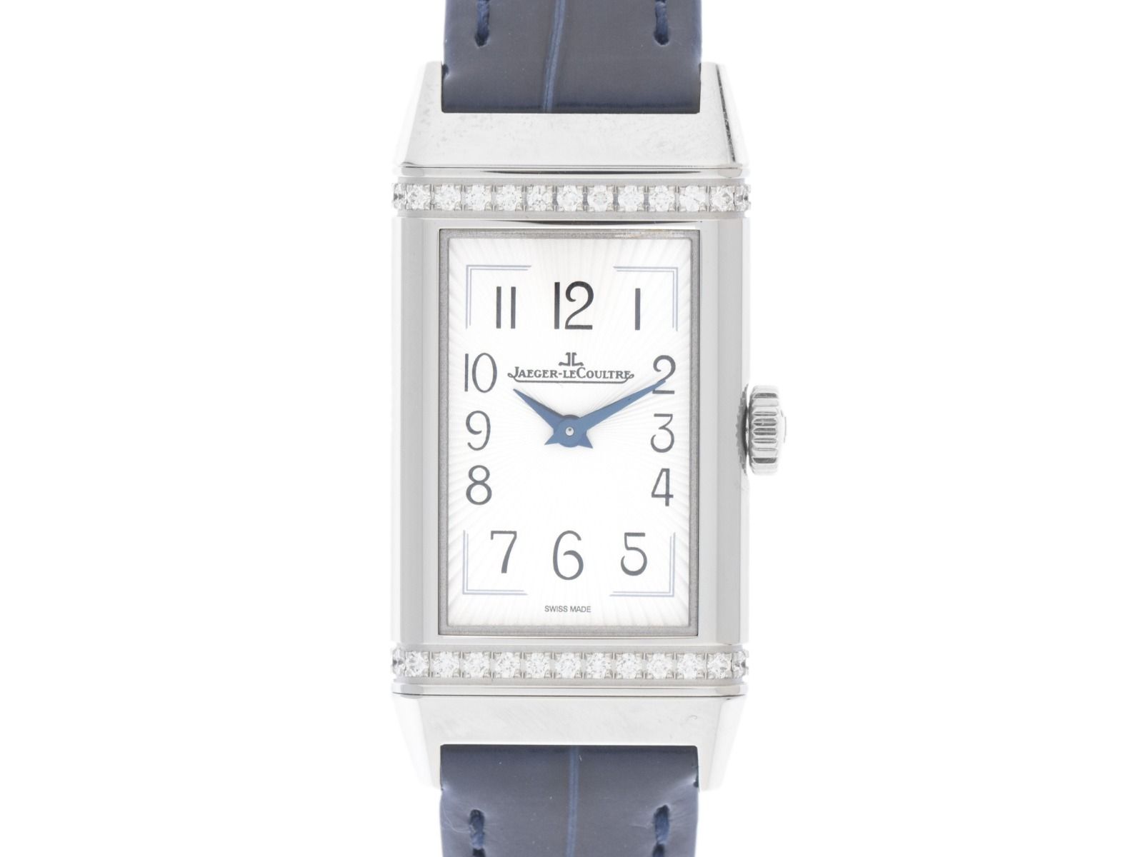 Jaeger-leCoultre Reverso One Stahl Diamanten Quarz Armband Krokoleder FaltschließeGehäuse Edelstahl poliert mit Diamantbesatz, Gehäusemaße 40,1x20mm mit 180° Wendegehäuse, Gehäusehöhe 7,8mm. Jaeger-leCoultre Armband Krokoleder blau mit Ziernaht, Anstoßbreite 14mm, Jaeger-leCoultre Doppelfaltschließe Edelstahl mit Hersteller-Logo. Zifferblatt silbergrau mit schwarzen arabischen Ziffern und gebläuten Zeigern. Uhrwerk quarzgesteuert, Jaeger-leCoultre Manufakturkaliber 657 mit 4 Edelsteinen. Anzeige von Stunde und Minute über Zeiger aus der Mitte. Saphirglas kratzfest. Krone mit Hersteller-Logo. Boden Edelstahl. Gewicht der Uhr inklusive Armband 35g. Wasserdicht bis 3 ATM. Referenznummer: Q3288420, ID: ST5806119040825H-8250, Artikelnummer: 10000081899. Original Jaeger-leCoultre Box mit Umkarton und Garantie Papiere von 2025 sowie Beschreibung, Full Set. Ungetragen. Lieferzeit sofort.