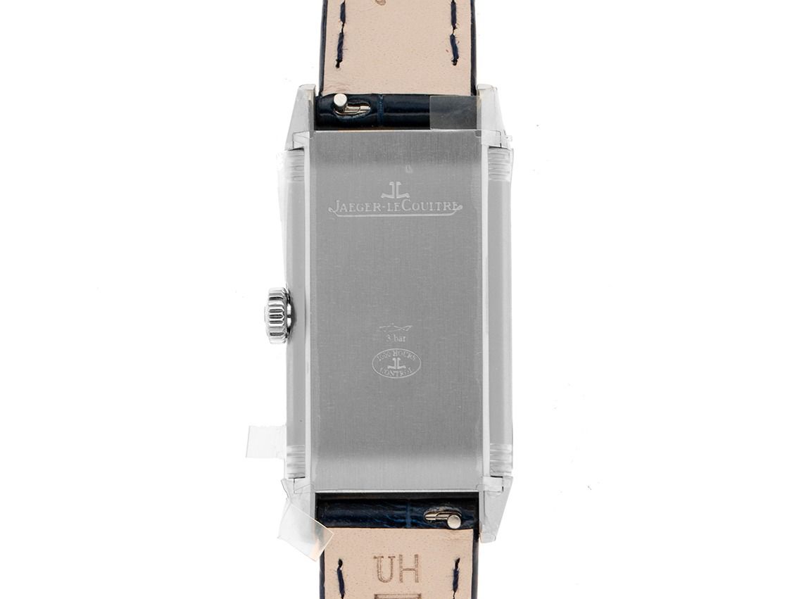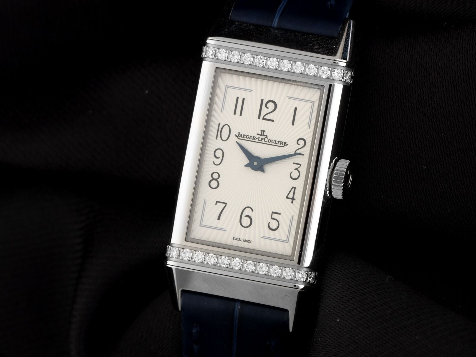 Gehäuse Edelstahl poliert mit Diamantbesatz, Gehäusemaße 40,1x20mm mit 180° Wendegehäuse, Gehäusehöhe 7,8mm. Braçadeira Jaeger-leCoultre Krokoleder blau mit Ziernaht, Anstoßbreite 14mm, Jaeger-leCoultre Doppelfaltschließe Edelstahl mit Hersteller-Logo. Zifferblatt silbergrau mit schwarzen arabischen Ziffern und gebläuten Zeigern. Caixa de ferramentas de quarzgesteuert, Jaeger-leCoultre Manufakturkaliber 657 com 4 Edelsteinen. Anzeige von Stunde und Minute über Zeiger aus der Mitte. Saphirglas kratzfest. Coroa com logótipo do vendedor. Corpo em metal duro. Peso da unidade, incluindo a braçadeira, 35 g. Pressão de água até 3 ATM. Número de referência: Q3288420, ID: ST5806119040825H-8250, Artikelnummer: 10000081899. Caixa original Jaeger-leCoultre com Umkarton und Garantie Papiere von 2025 sowie Beschreibung, Conjunto completo. Não disponível. Lieferzeit sofort.