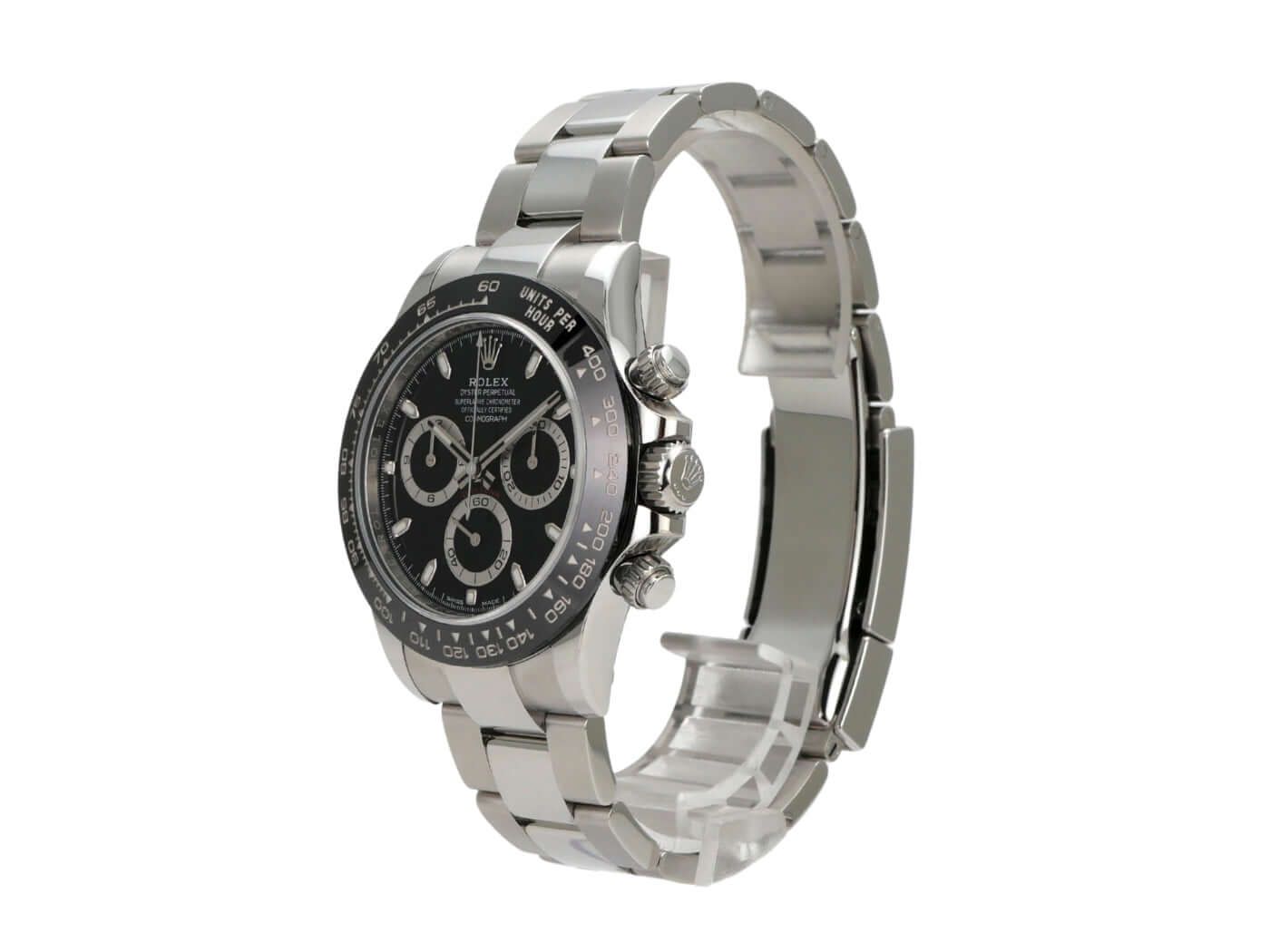 Rolex Daytona Stainless Steel Ref. 116500LN Black Dial from 2023Case made of polished and satin-finished stainless steel, ceramic bezel with tachymeter scale, Oyster stainless steel bracelet polished and satin-finished with safety folding clasp, black dial with luminous indices, luminous hands, Rolex manufacture caliber 4130, 44 jewels, power reserve approx. 72 hours, chronometer, sapphire crystal, screw-down crown with flank protection and manufacturer logo, screwed stainless steel case back, water-resistant up to 10 bar.