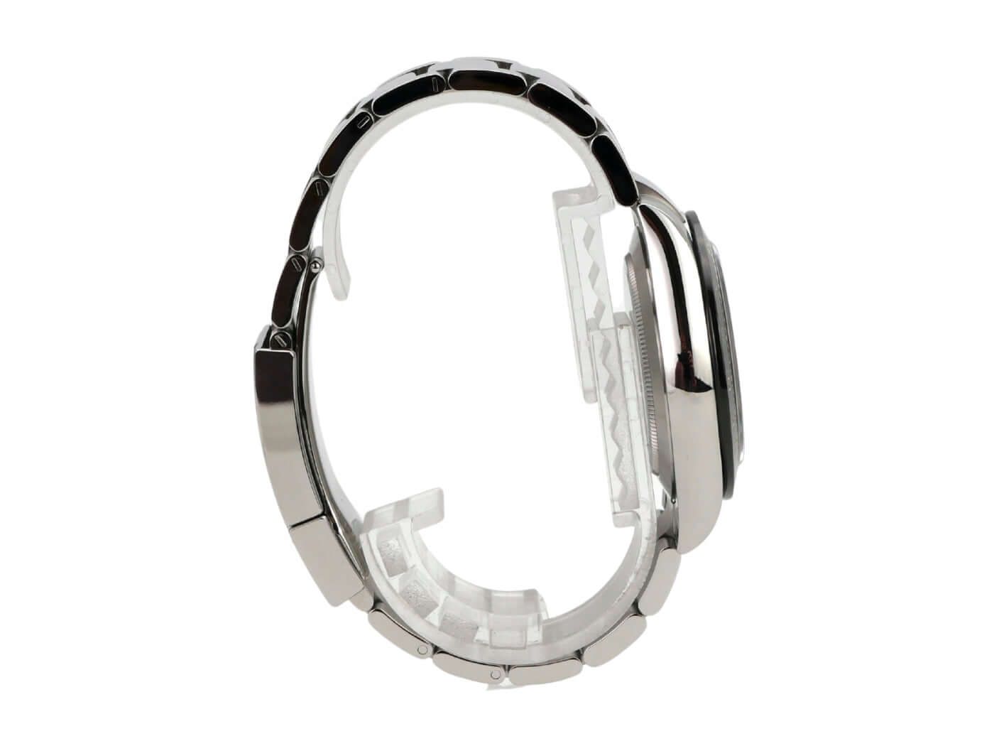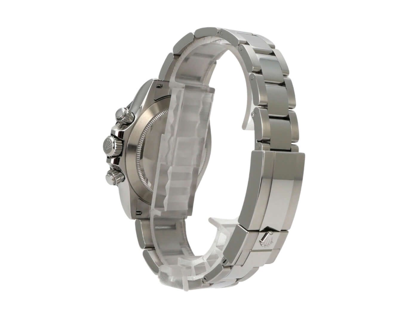 Caixa em aço inoxidável polido e acetinado, luneta em cerâmica com escala taquimétrica, pulseira oyster em aço inoxidável polido e acetinado com fecho de segurança desdobrável, mostrador preto com índices luminosos, ponteiros luminosos, calibre Rolex 4130, 44 jóias, reserva de marcha aprox. 72 horas, cronómetro, vidro de safira, coroa de rosca com proteção de flanco e logótipo do fabricante, fundo da caixa em aço inoxidável aparafusado, estanque até 10 bar.