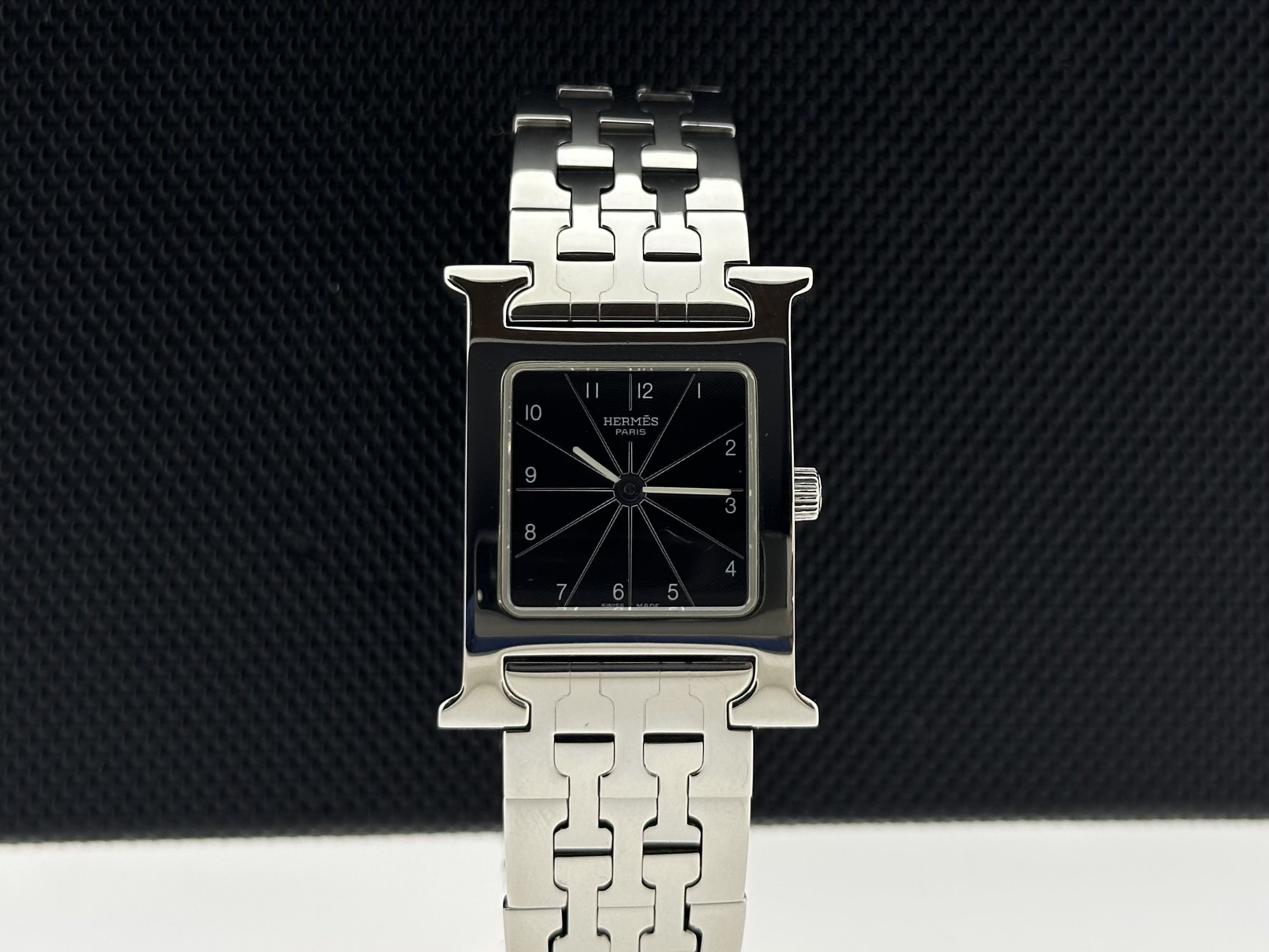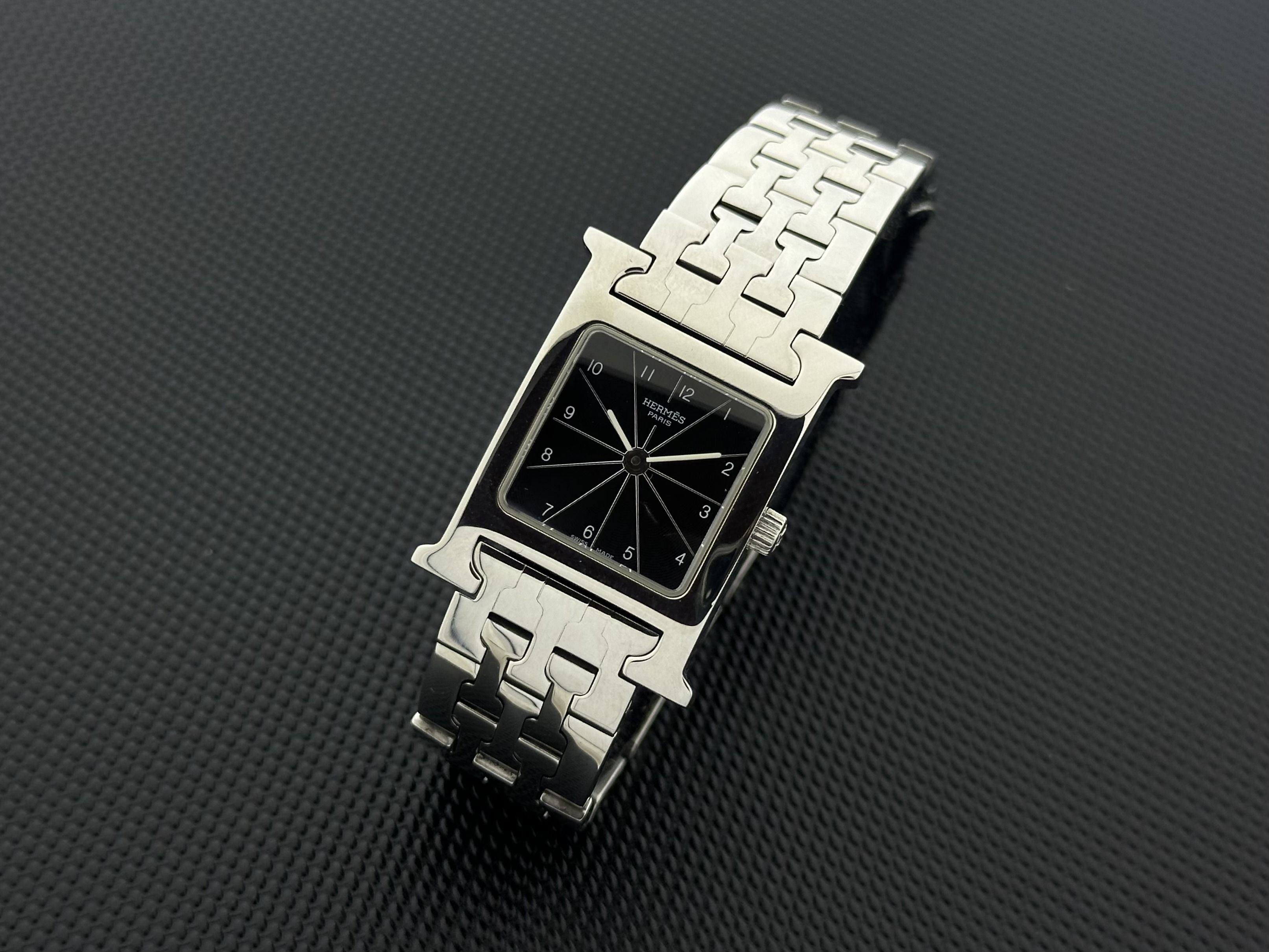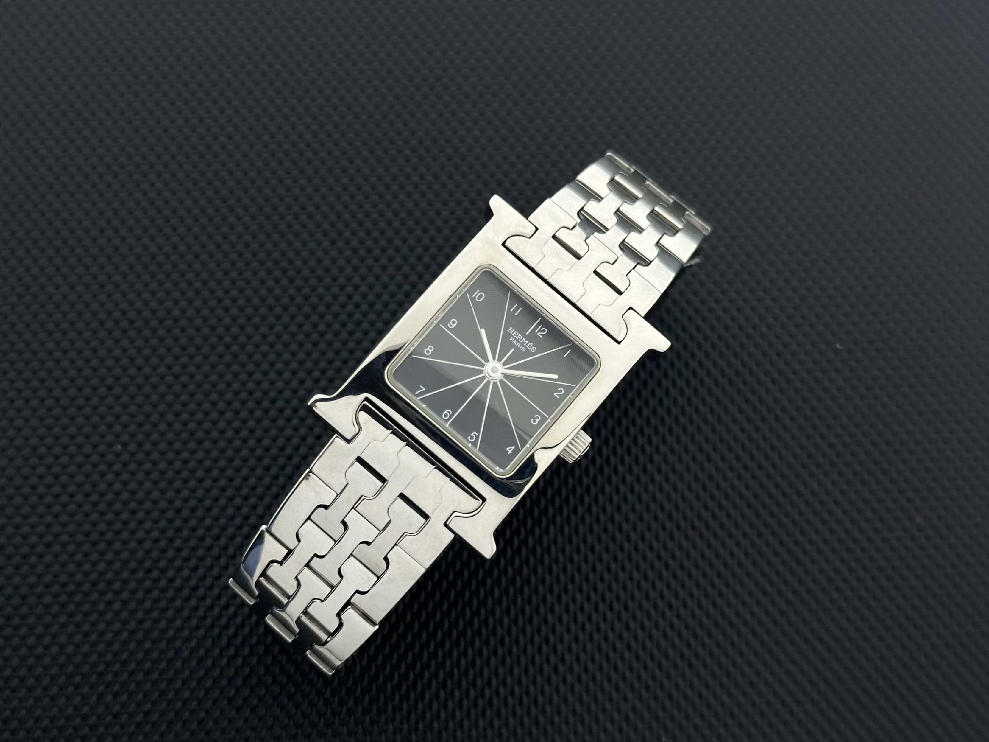 The Hermès comes with 24 months of warranty.A steel vintage Hermès Heure H watch, ref. HH1.210. The watch has a steel case, 21x30mm in the shape of the letter H. The watch has a steel bracelet. This Hermès Heure H watch has a black guilloché dial with Arabic numerals. The watch has a small scratch on the crystal, visible between 4 and 5 o'clock. The watch has a new battery.