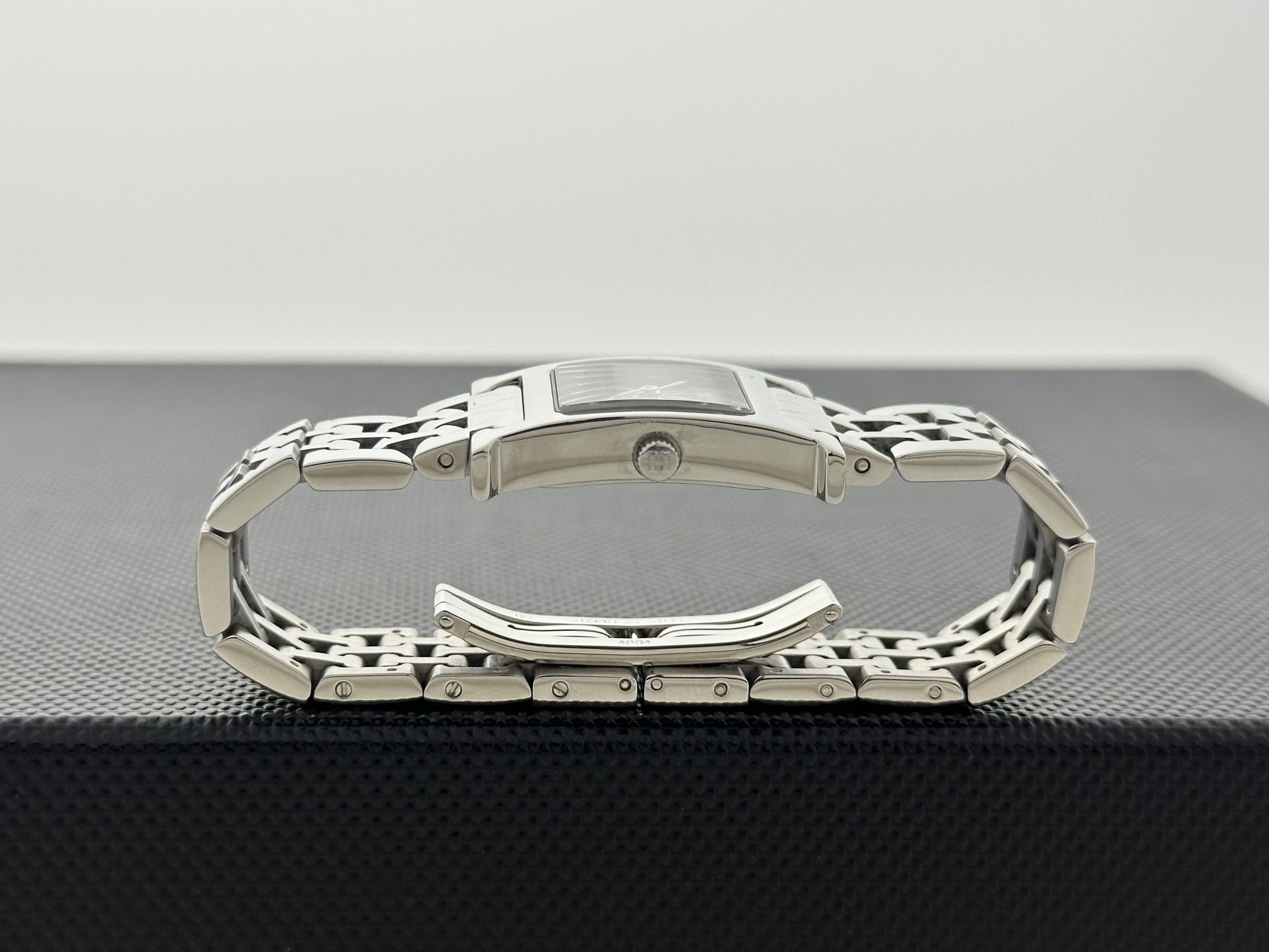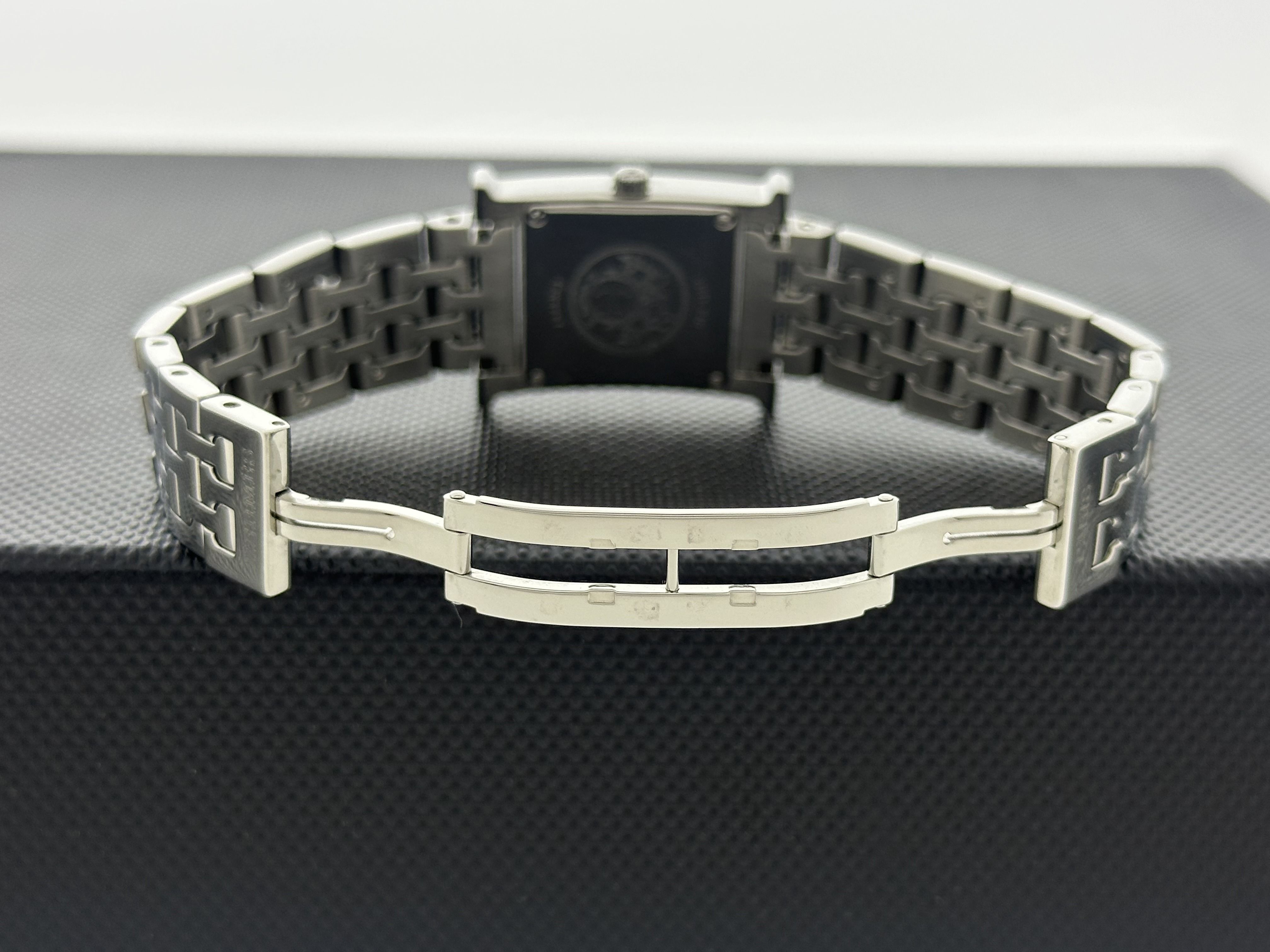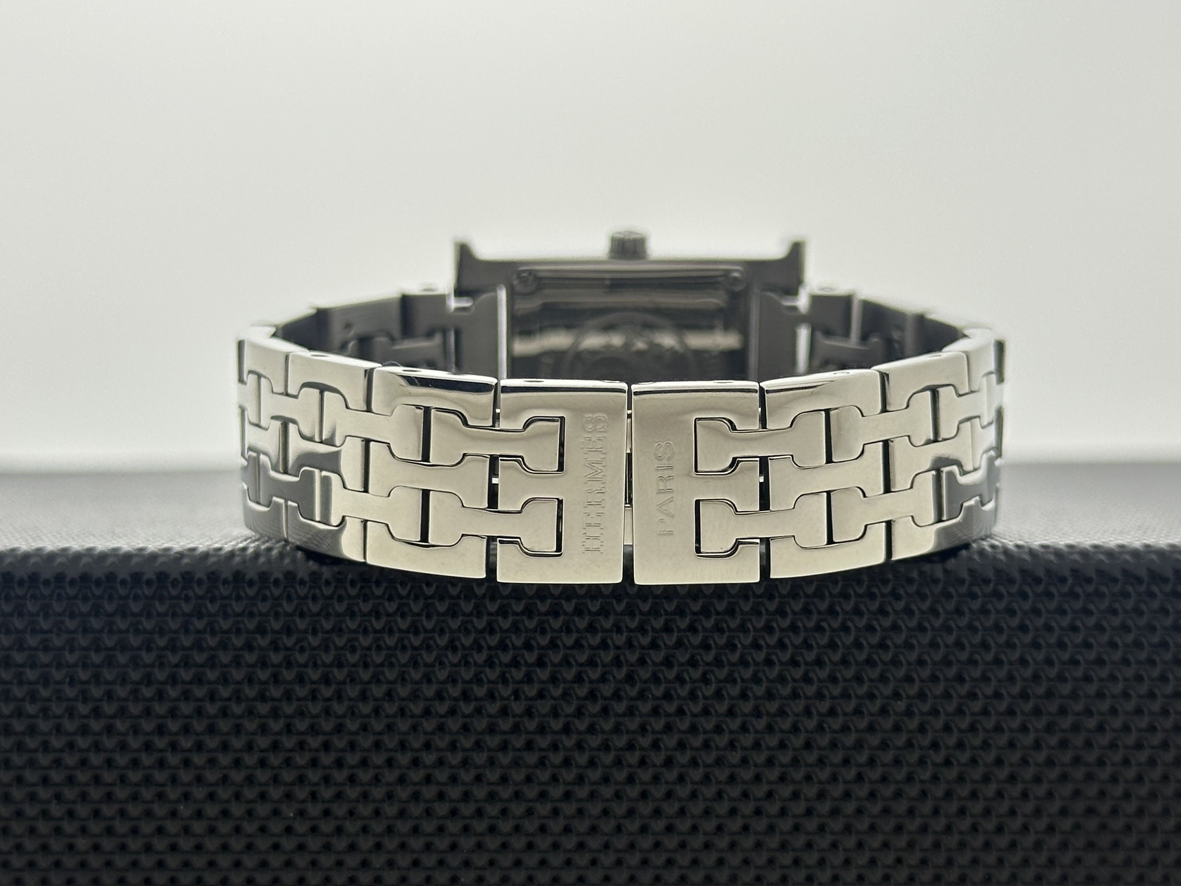 The Hermès comes with 24 months of warranty.A steel vintage Hermès Heure H watch, ref. HH1.210. The watch has a steel case, 21x30mm in the shape of the letter H. The watch has a steel bracelet. This Hermès Heure H watch has a black guilloché dial with Arabic numerals. The watch has a small scratch on the crystal, visible between 4 and 5 o'clock. The watch has a new battery.