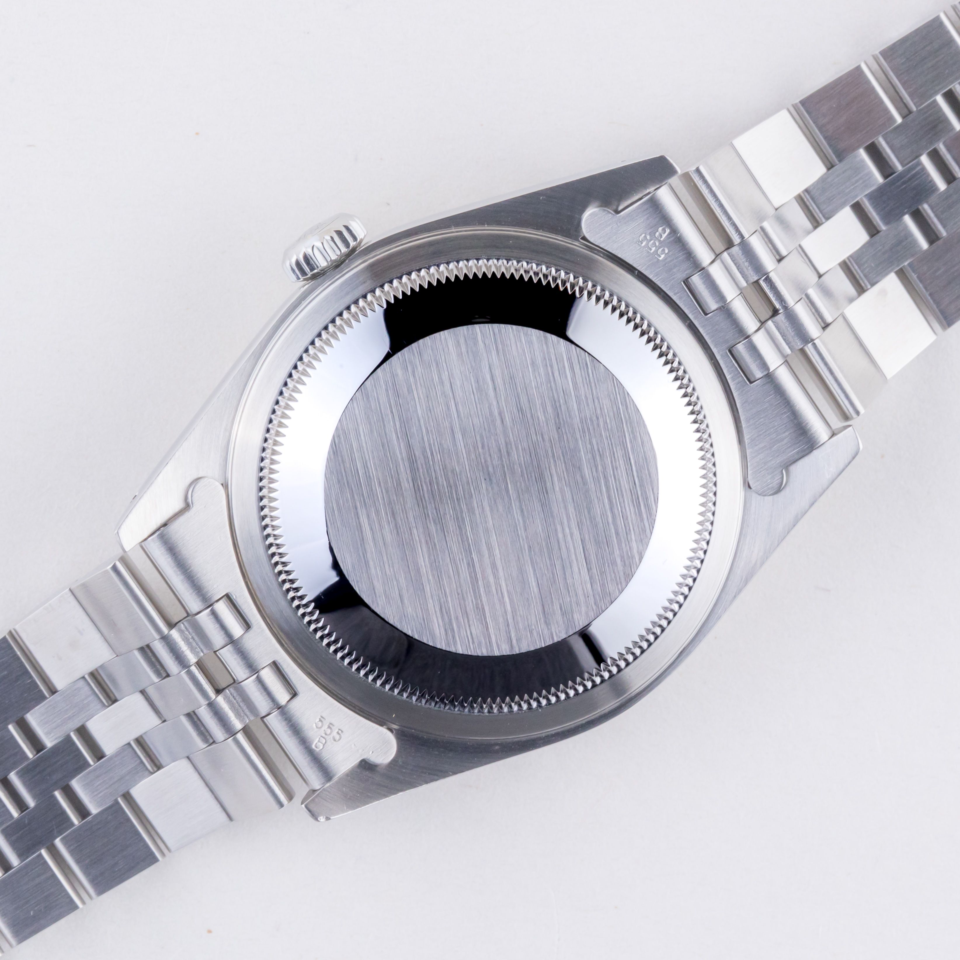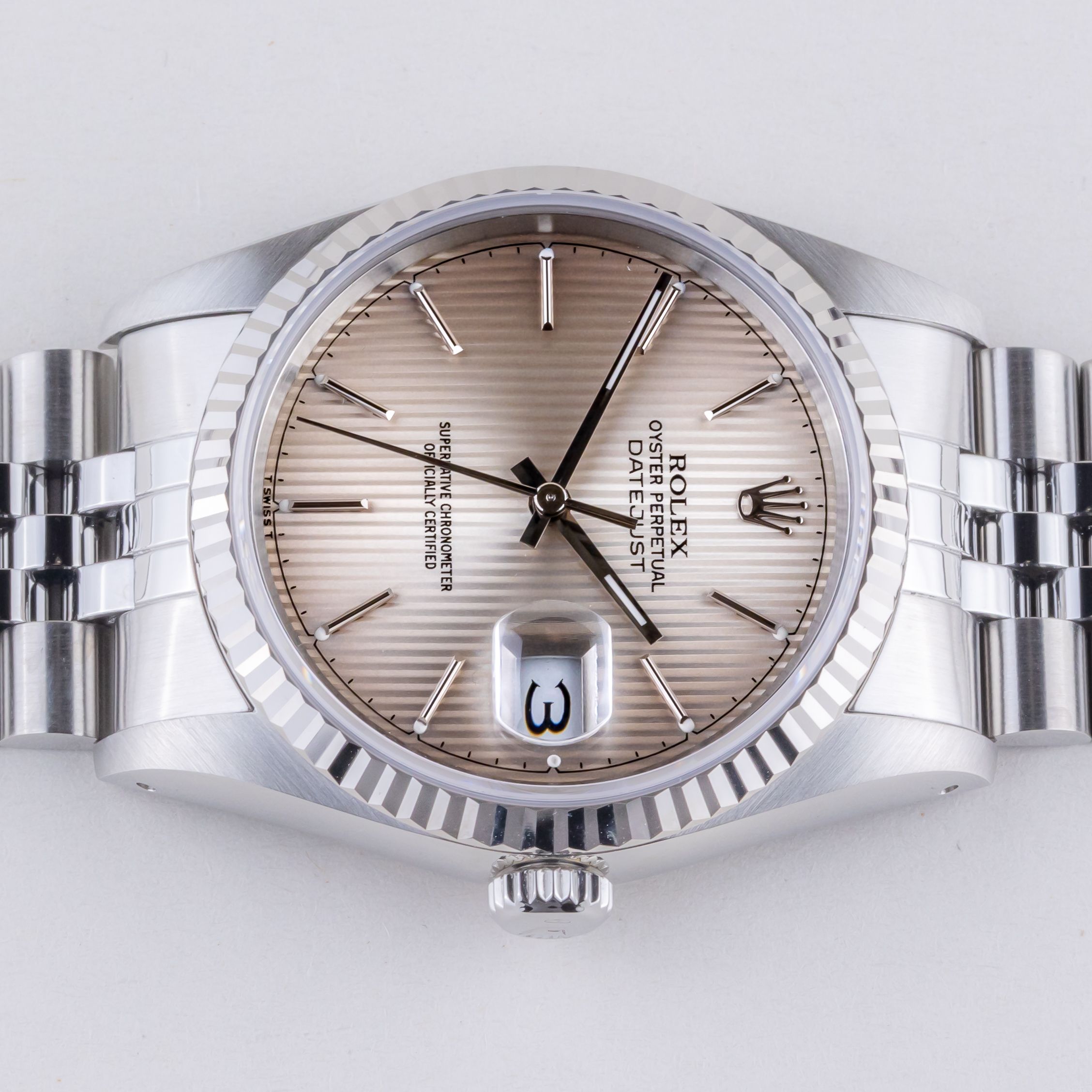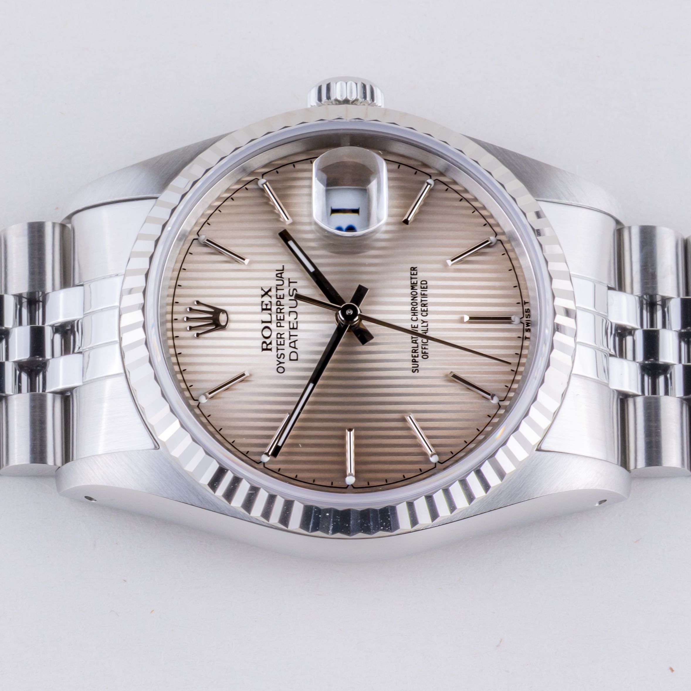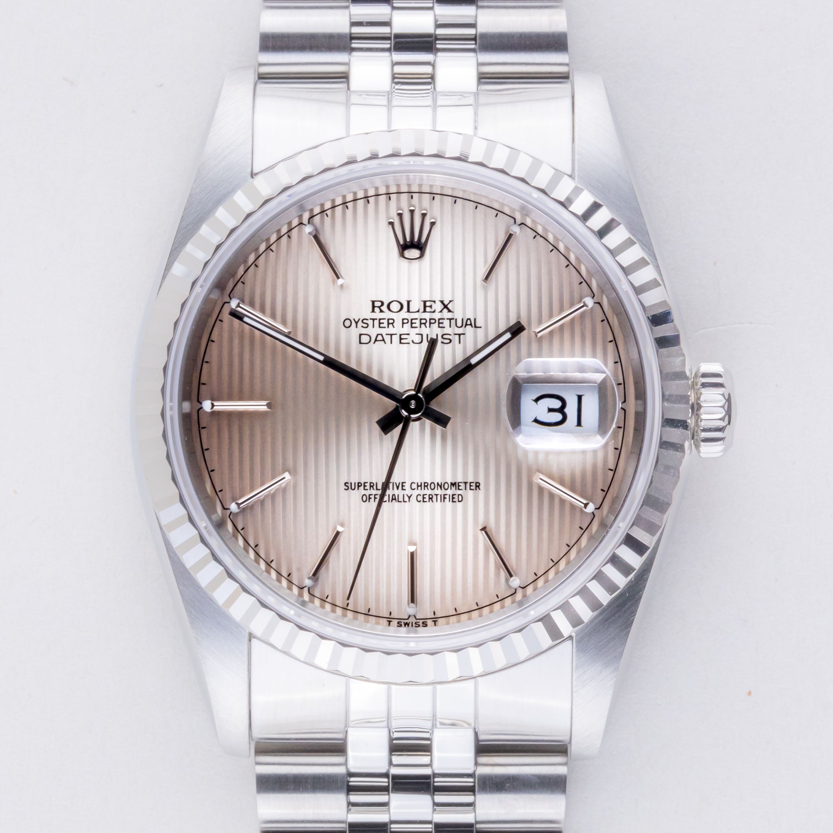Rolex Oyster Perpetual Datejust, referência 16234 de 1990. O Datejust 16234 Datejust apresenta uma caixa de 36 mm em aço inoxidável, uma bracelete Jubilee em aço inoxidável e uma luneta canelada em ouro branco de 18K. Este Datejust 16234 apresenta um movimento automático calibre 3135 com função de data fixa, um vidro de safira resistente a riscos e um mostrador de tapeçaria prateado.
