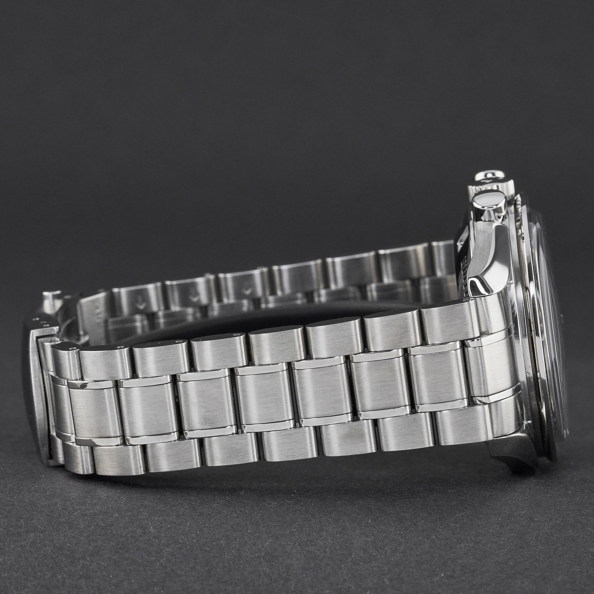 Este Omega Speedmaster, introduzido em 2004 como parte da série Michael Schumacher “A Lenda”, se destaca com seu mostrador prateado acentuado por submostradores pretos contrastantes. Este layout distinto melhora a legibilidade enquanto confere ao cronógrafo um caráter esportivo, mas refinado.