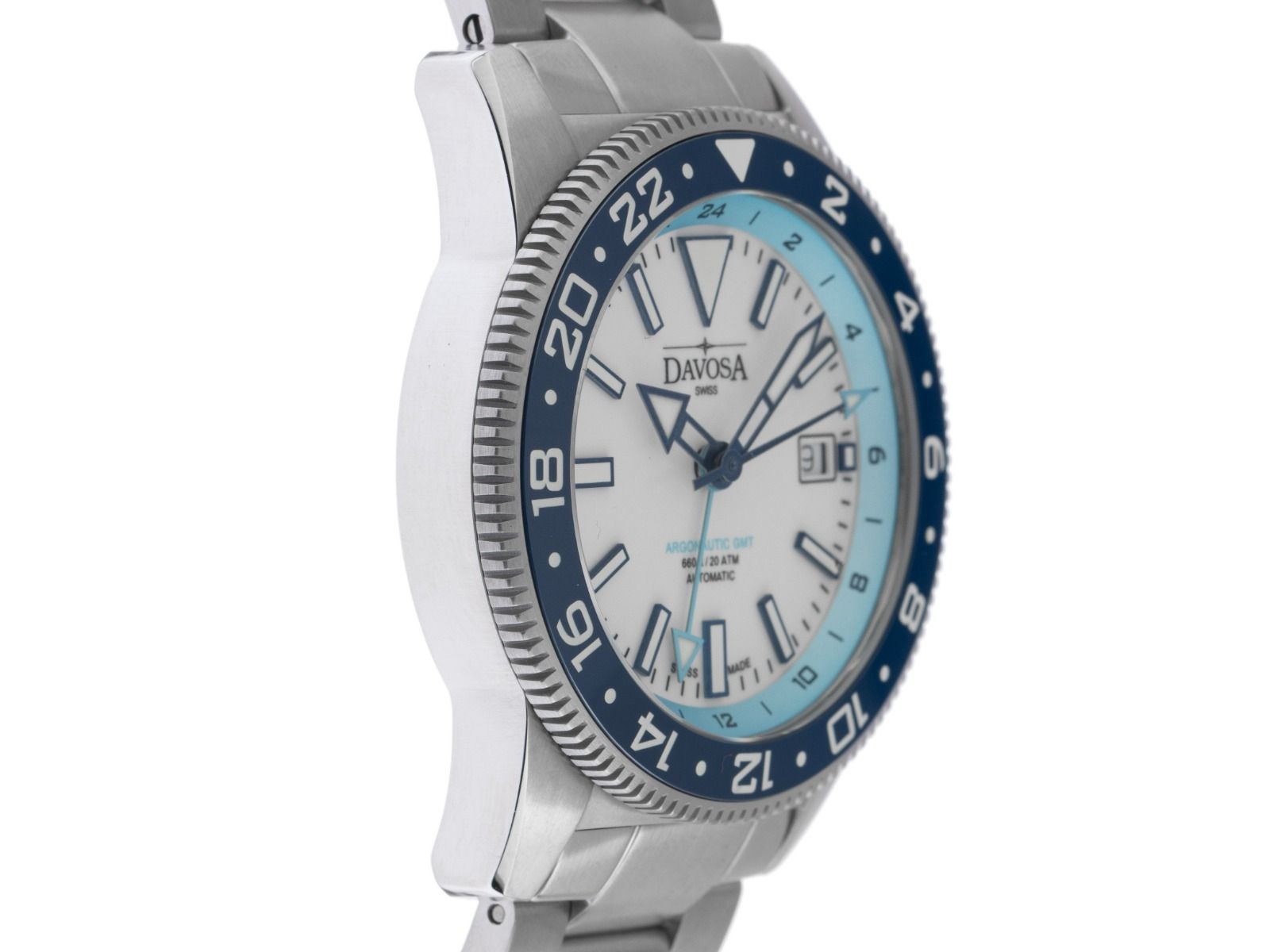 Davosa Argonautic World Traveller Stahl Keramik Automatik Armband StahlGehäuse Edelstahl satiniert und poliert, Gehäusedurchmesser ohne Krone 41mm, Gehäusehöhe 11,9mm. Lünette Edelstahl geriffelt mit blauem Keramik Inlay und 24-Stunden Skala, beidseitig drehbar. Armband Edelstahl satiniert, Sicherheitsfaltschließe Edelstahl mit Hersteller-Logo. Zifferblatt weiß mit aufgesetzten Leuchtindexen und Leuchtzeigern und Unterglas 24-Stunden Skala. Uhrwerk Automatik, Kaliber DAV 3032 mit 21 Edelsteinen, Gangreserve ca. 56 Stunden. Anzeige von Stunde, Minute und Sekunde über Zeiger aus der Mitte mit Sekundenstopp zur sekundengenauen Einstellung der Uhrzeit, Datumsanzeige mit Schnellverstellung bei 3 Uhr, zweite Zeitzone über roten Zeiger mit Leuchtspitze aus der Mitte. Saphirglas kratzfest und entspiegelt. Krone verschraubbar mit Flankenschutz und Hersteller-Logo. Boden Edelstahl verschraubt und graviert. Gewicht der Uhr inklusive Armband 174g, Länge des Armbandes inklusive Gehäuse 210mm. Wasserdicht bis 20 ATM. Referenznummer: 161.542.40, ID: ST115618920925H-1590, Artikelnummer: 10000082264. Original Davosa Box mit Umkarton und Garantie Papiere sowie Beschreibung, Full Set. Neu. Lieferzeit sofort.