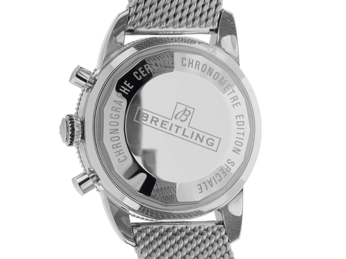 Gehäuse Edelstahl poliert, Gehäusedurchmesser ohne Krone 44mm, Gehäusehöhe 15,5mm. Lünette Edelstahl gerädelt mit schwarzem Keramik Inlay und 60-Minuten Skala, einseitig drehbar. Braçadeira Edelstahl Aero Classic, com logótipo do vendedor. Zifferblatt schwarz mit aufgesetzten Edelstahl Indexen und Leuchtpunkten sowie Edelstahl Leuchtzeigern. Relógio automático, cronógrafo, calibre Breitling 13 com 25 botões, reserva de marcha ca. 48 Stunden. Anzeige von Stunde, Minute und Sekunde über Zeiger aus der Mitte mit Sekundenstopp zur sekundengenauen Einstellung der Uhrzeit, Wochentagsanzeige und Datumsanzeige mit Schnellverstellung bei 3 Uhr. Saphirglas kratzfest, doppelseitig entspiegelt. Coroa verschraubbar com logótipo do vendedor. Corpo em Edelstahl, com a marca do vendedor. Peso da unidade incluindo a braçadeira 188g, comprimento da braçadeira incluindo o suporte 200mm. Pressão de água até 20 ATM. Referenznummer: A13313121B1A1, ID: ST580695240925H-6900, Artikelnummer: 10000082270. Caixa original Breitling e papel de garantia de 2025, bem como descrição, conjunto completo. Ungetragen. Lieferzeit sofort.