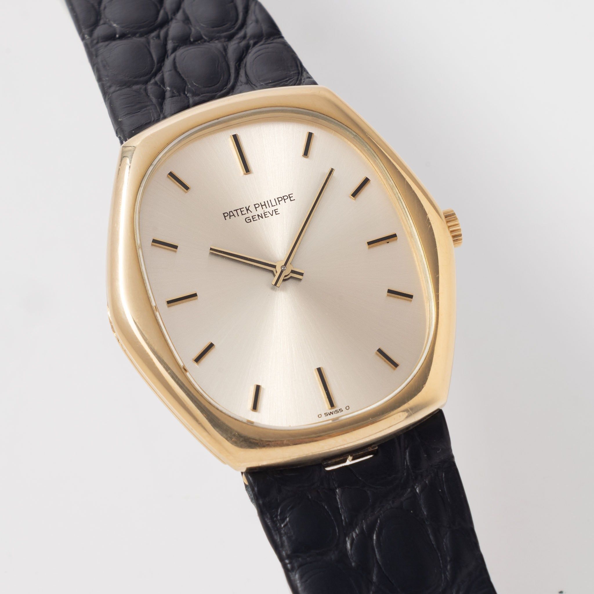 This is a beautiful and visually striking vintage Patek Ellipse, featuring a slightly bulkier case that, to our eyes, resembles the elegant form of a manta ray. The Patek Ellipse has become a focus for us in recent years — we’re drawn to the subtle yet sophisticated details found in these wonderfully crafted timepieces. The champagne-colored dial is in fantastic condition, with crisp black text and sigma markings at the bottom edge, indicating that the hour markers are made of solid gold.The case back features an engraving from the former owner: "I X 74 80", rendered in a charming font. The watch is presented on the pictured Bulang and Sons leather strap, fitted with a yellow gold Patek Ellipse-style pin buckle. It has also been fully serviced by our watchmaker. This is a distinctive and refined Patek Philippe dress watch, and we’d be delighted to tell you more about it. Please feel free to get in touch to arrange a call or a visit. Specifications: Patek Philippe golden Ellipse reference 3858J 31x34mm yellow gold ”flared-out“ case Case number 544xxx movement no 132xxxx dating to the end of 1970s Champagne no-lume sigma dial No-lume yellow gold hands Calibre 215 manual wind movement Bulang and sons leather strap and 18kt gold Patek Ellipse style buckle Case-back engraved Fully serviced by our watchmaker One-year mechanical warranty Free worldwide Fedex Priority shipping