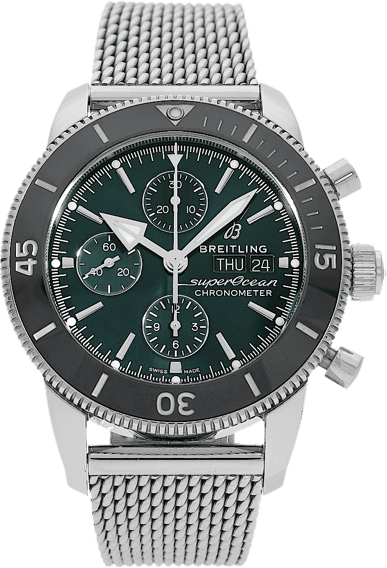 Breitling Superocean Heritage II Chronograph, Reference: A1331312.BG49.154A, Gender: Male, Size: 44mm, Dial color: Green, Strap material: Stainless Steel, Movement: Automatic, Condition: New and unworn. An inspection by our certified watchmakers guarantees authenticity., Documents: Original papers, CHRONEXT Certificate
