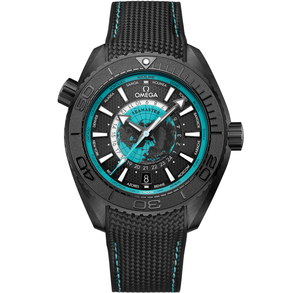 Omega 215.92.46.22.01.006 - Seamaster Planet Ocean 600M Co-Axial Worldtimer 45.5 Master Chronometer GMT-Master Cerâmica / Preto - Turquesa / Borracha
