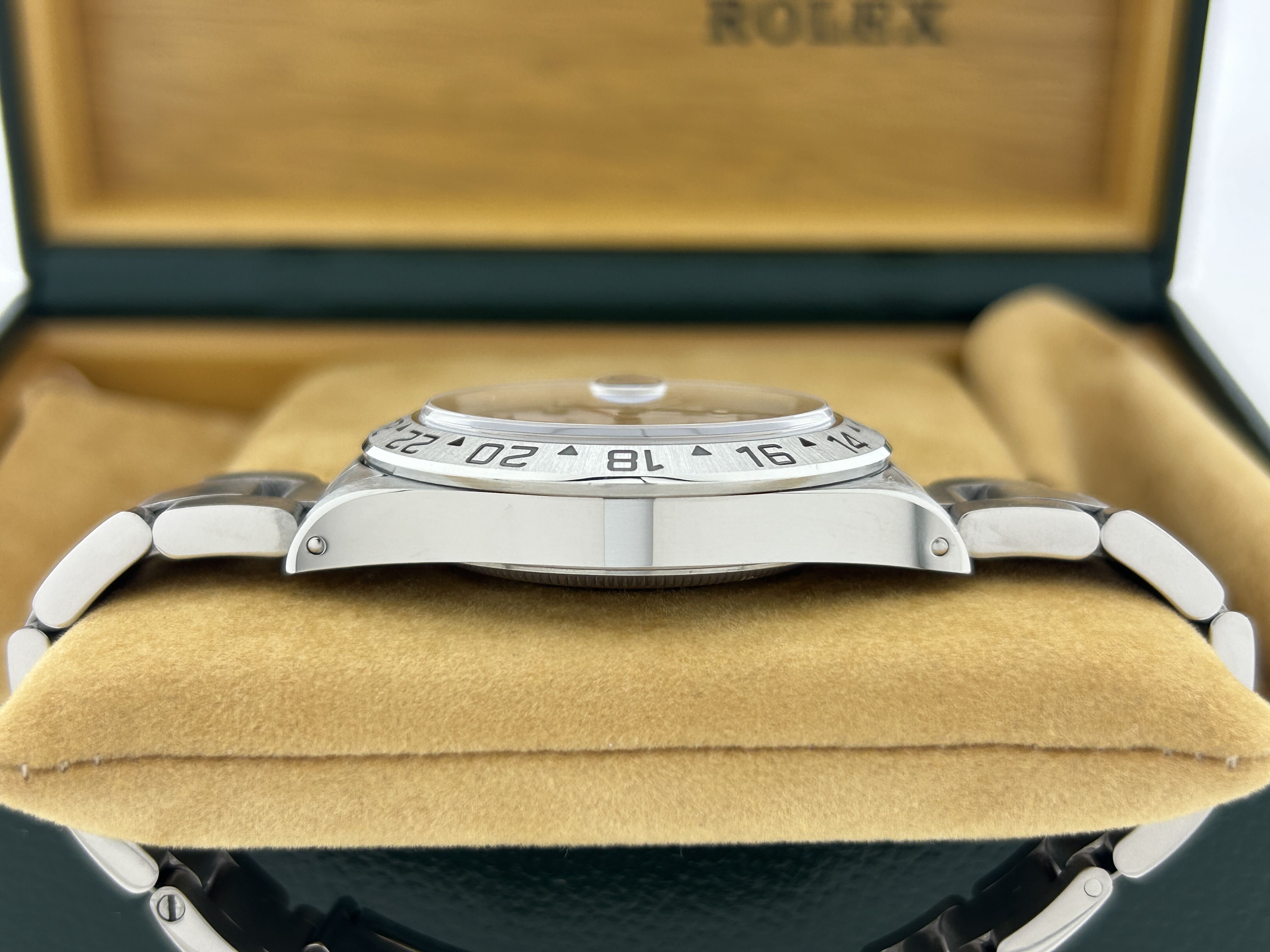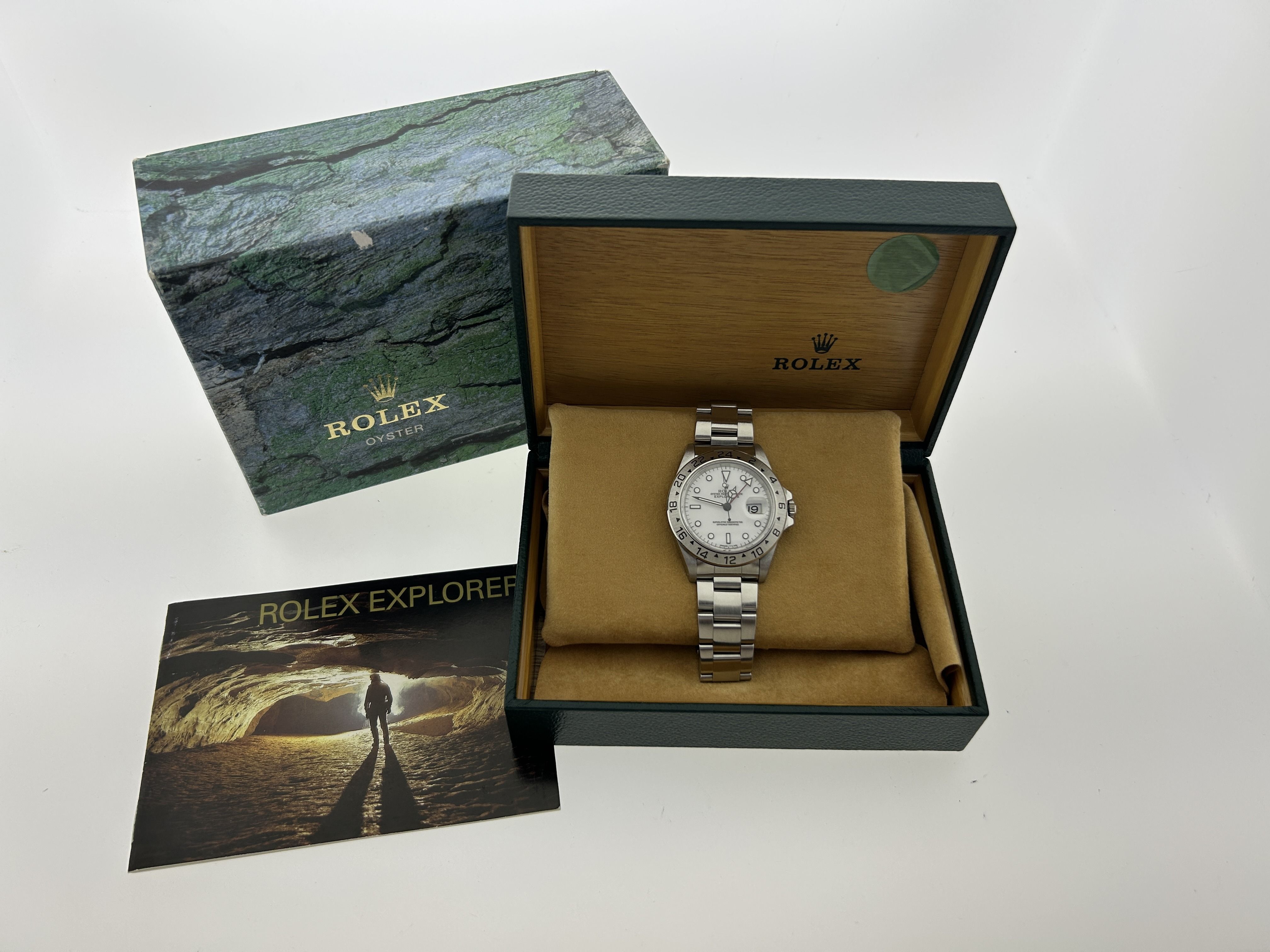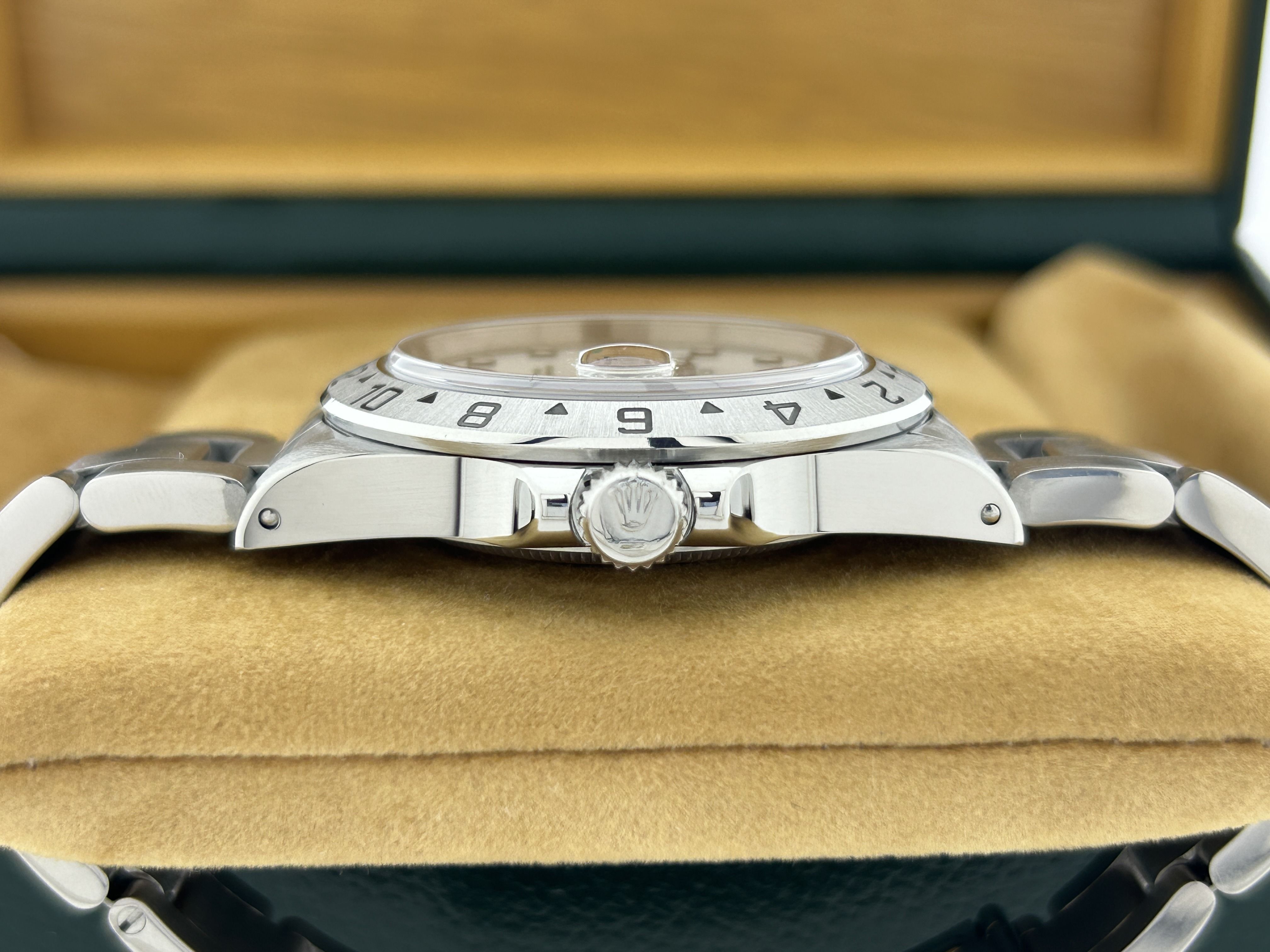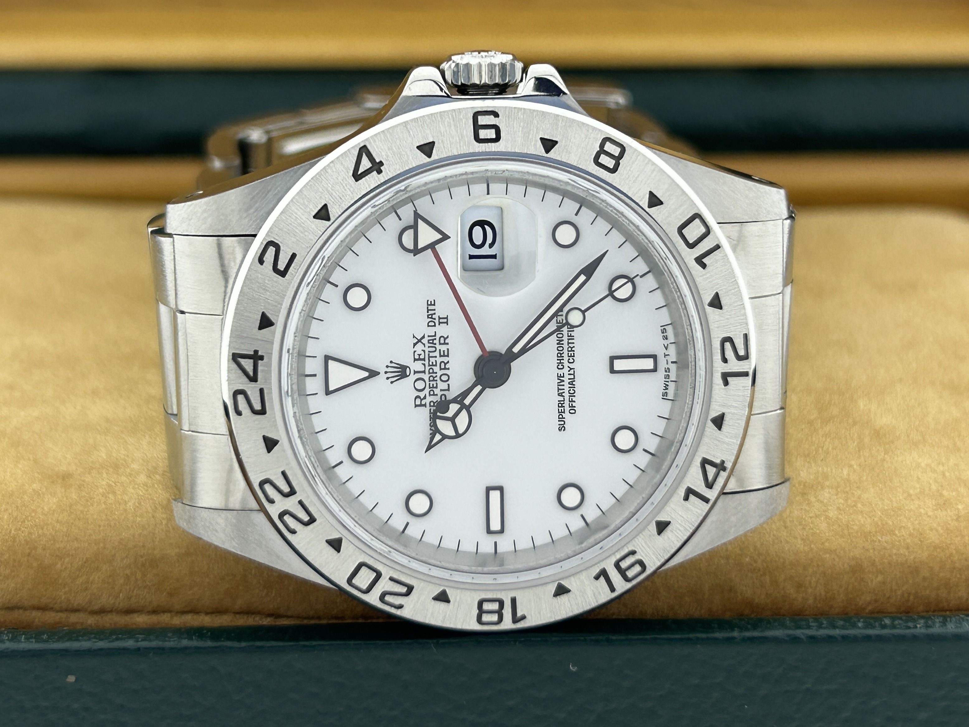 The Rolex comes with 24 months of warranty.A Rolex Explorer II 40, ref. 16570, from 1995. The Rolex has a steel 40mm case with a steel Oyster bracelet. The watch has a white dial, with a date-window at 3 o'clock. The Rolex has a 24-hour hand, that indicates the second time zone on the steel bezel. The watch comes in the original box.