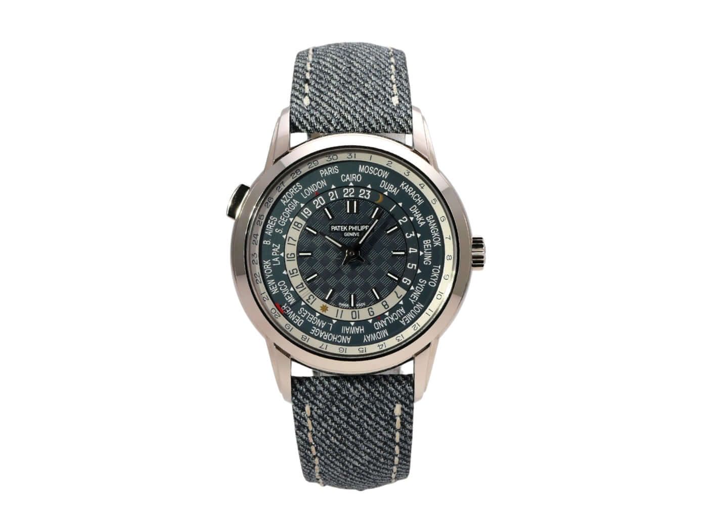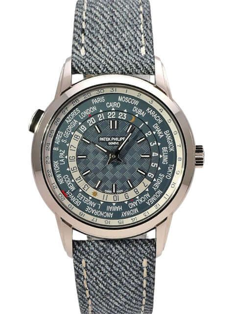 Patek Philippe World Time 5330G-001Case made of 18 kt White gold polished, case diameter 40 mm, White gold polished bezel, jeans strap with folding clasp, opaline dial blue/gray with luminous indices, luminous hands, automatic, manufacture caliber 240 HU C with 38 jewels, frequency 21,600 A/h, GMT/second time zone, power reserve of approx. 48 hours, case back made of 18 kt white gold with sapphire crystal window, water-resistant up to 3 bar.