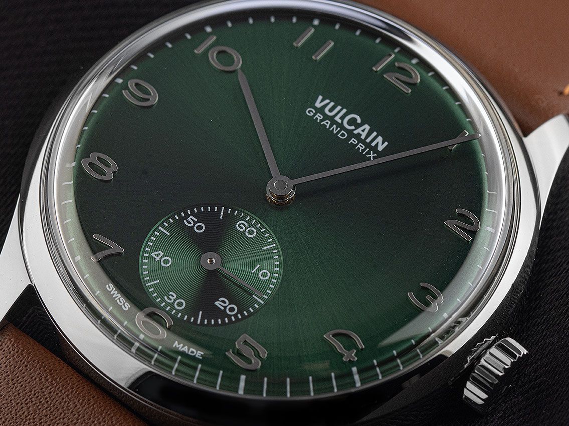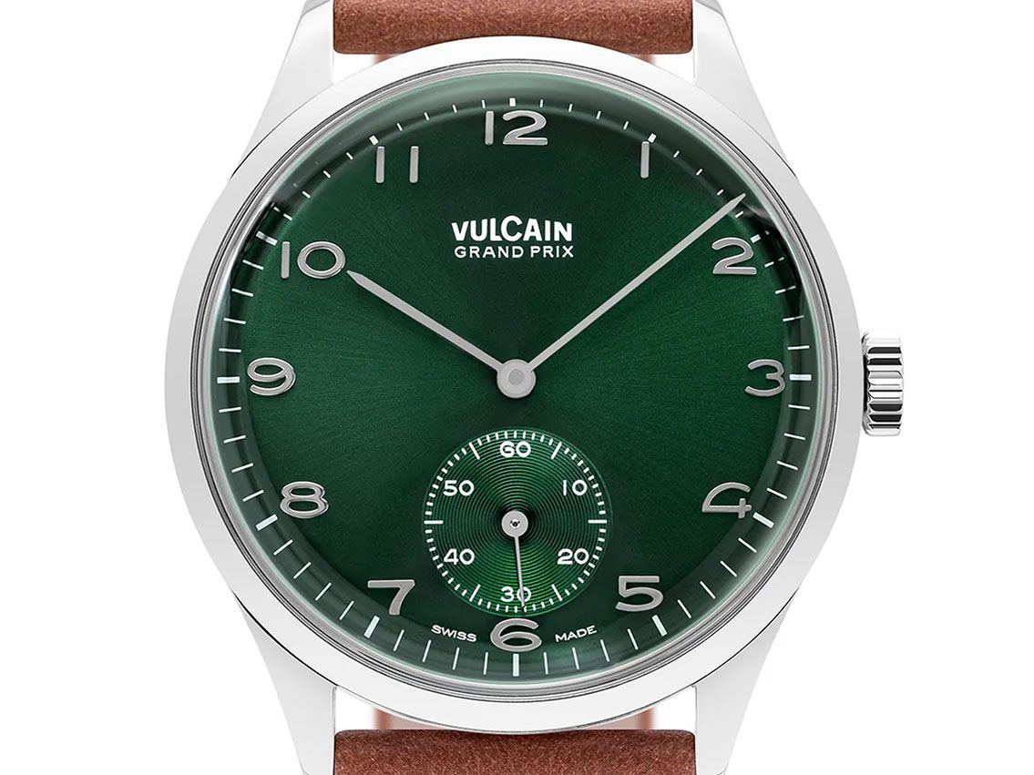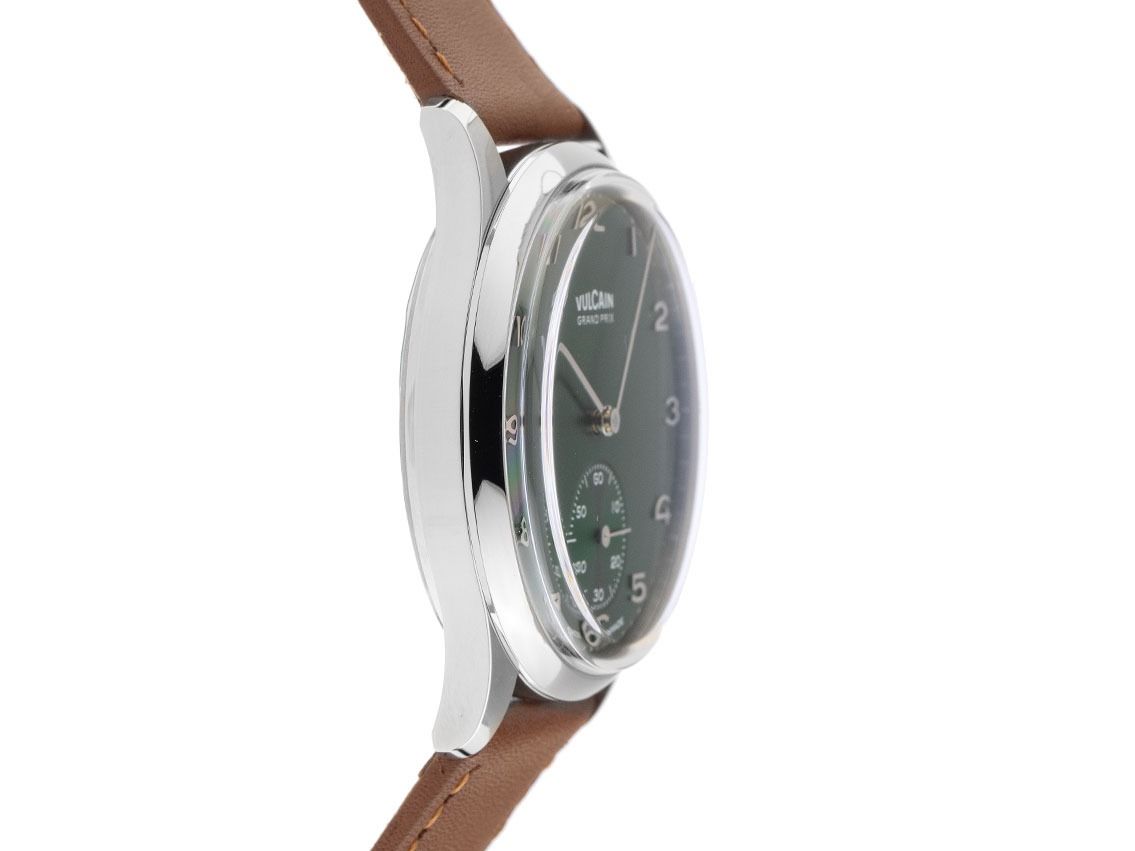 Vulcain Grand Prix Stahl Automatik Armband LederGehäuse Edelstahl poliert, Gehäusedurchmesser ohne Krone 39mm, Gehäusehöhe 12,7mm. Lünette Edelstahl glatt und poliert. Armband Leder braun mit Ziernaht, Anstoßbreite 20mm, Stiftschließe Edelstahl mit Hersteller-Logo. Zifferblatt grün mit aufgesetzten arabischen Edelstahl Ziffern und Edelstahl Zeigern. Uhrwerk Automatik, Kaliber Vulcain Landeron L24, Gangreserve ca. 40 Stunden. Anzeige von Stunde und Minute über Zeiger aus der Mitte, kleine Sekunde mit Sekundenstopp zur sekundengenauen Einstellung der Uhrzeit bei 6 Uhr. Saphirglas kratzfest und gewölbt. Krone geriffelt mit Hersteller-Logo. Boden Edelstahl verschraubt und graviert. Gewicht der Uhr inklusive Armband 61g. Referenznummer: 690175A90.BAC207, ID: ST593416541025H-1408, Artikelnummer: 10000082522. Original Vulcain Box und Garantie Papiere von 2025, Full Set. Neu. Lieferzeit sofort.