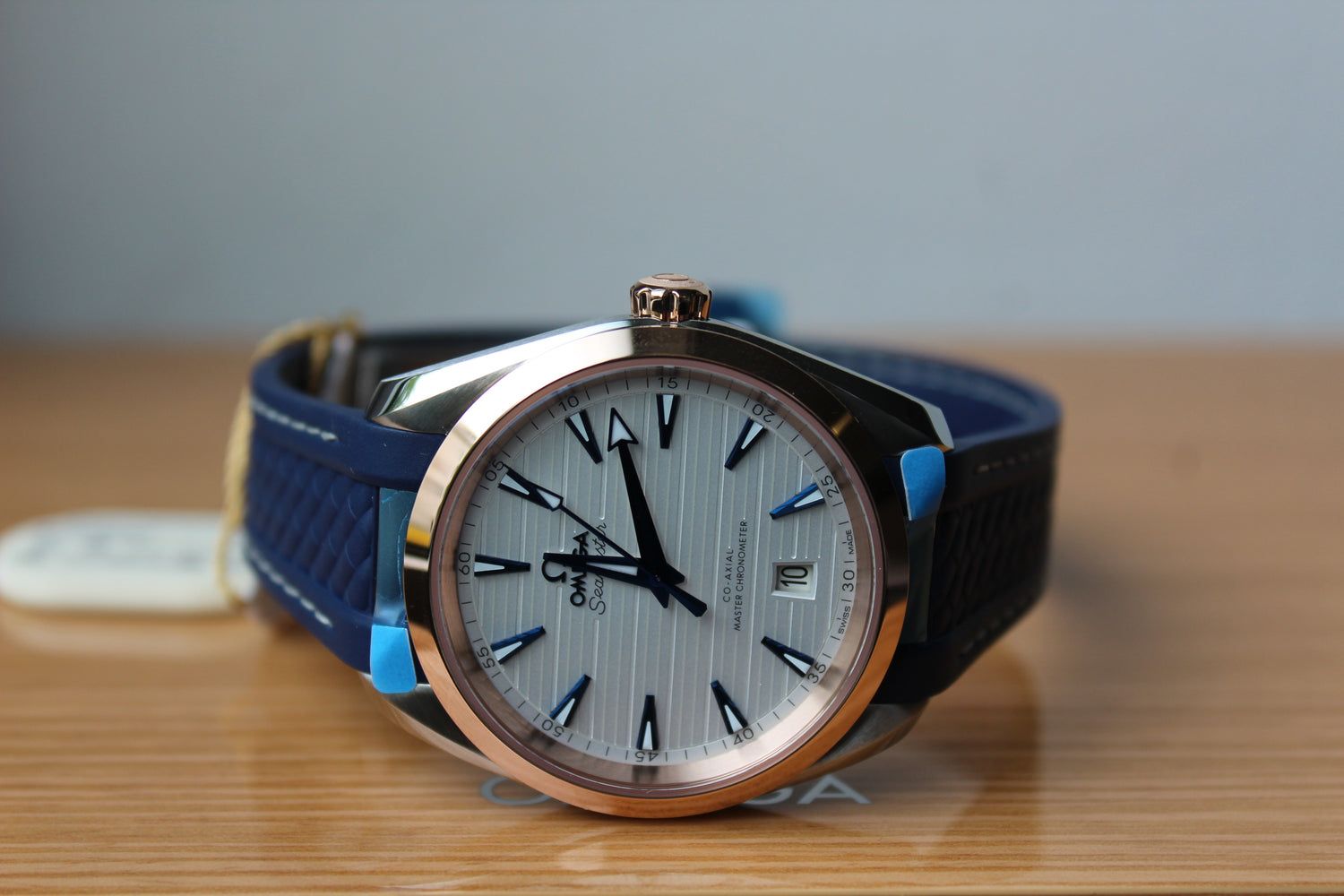 Omega Seamaster AQUA TERRA 150 M CO‑AXIAL MASTER CHRONOMETER 220.22.38.20.02.001 prata 38mm ouro/aço, pulseira de borracha azul