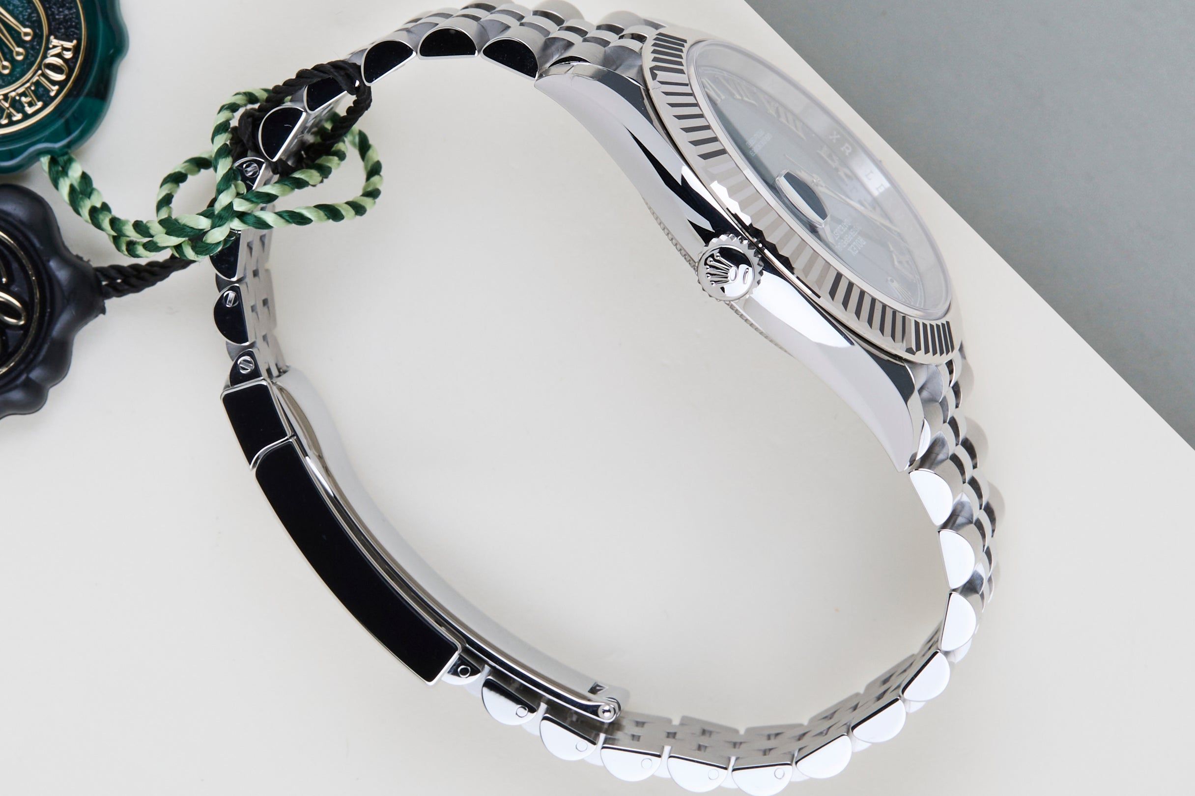 Este Rolex Datejust 41 é Novo & Sem Uso e vem com o Cartão de Garantia original da Rolex e caixa. Além disso, o relógio ainda possui Garantia Mundial Rolex até Outubro de 2030.