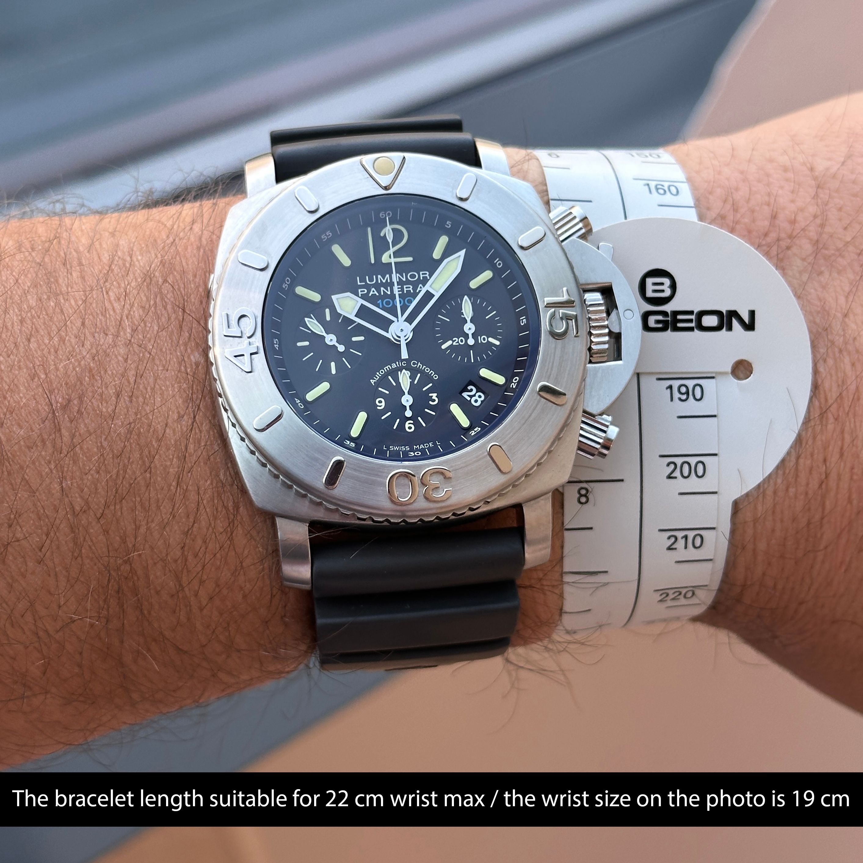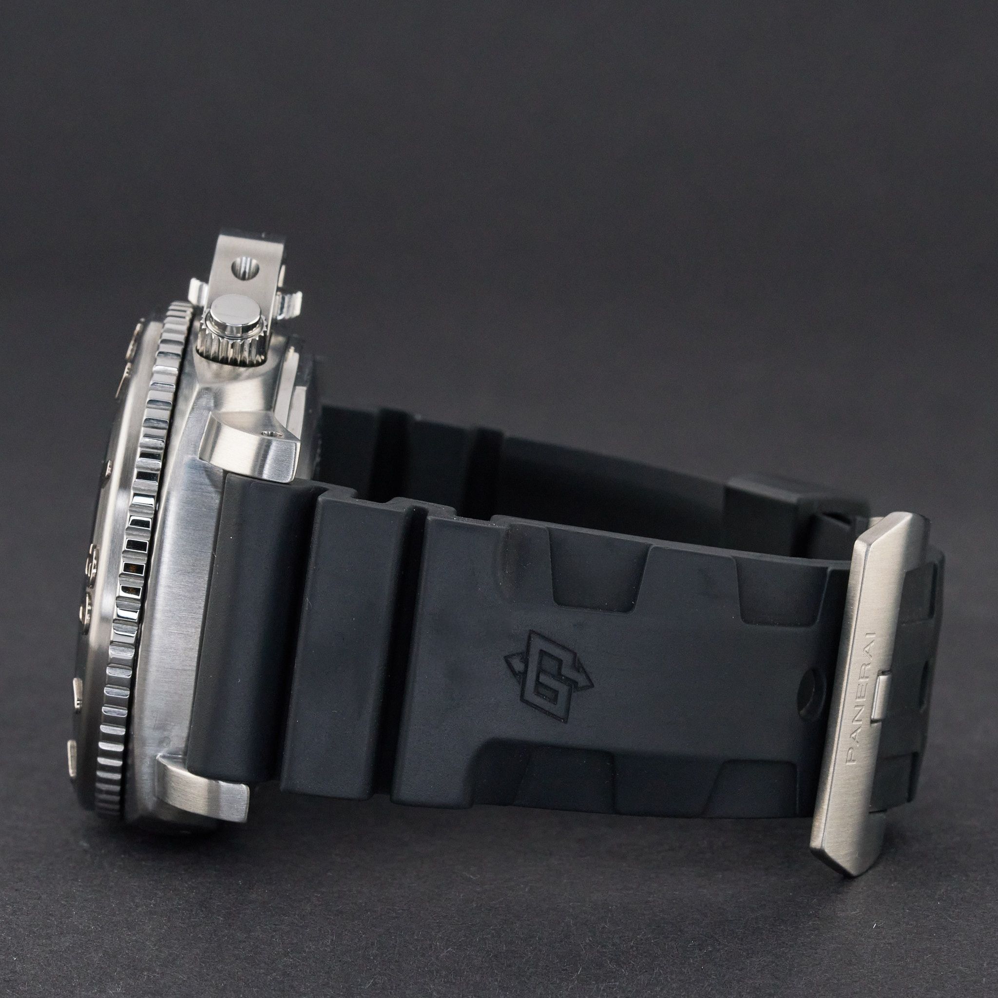 O relógio é apresentado em uma pulseira de borracha preta original "Panerai" com fecho de logotipo "Panerai".