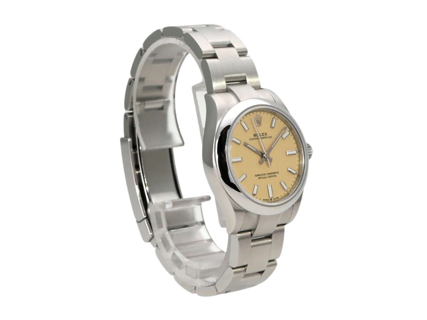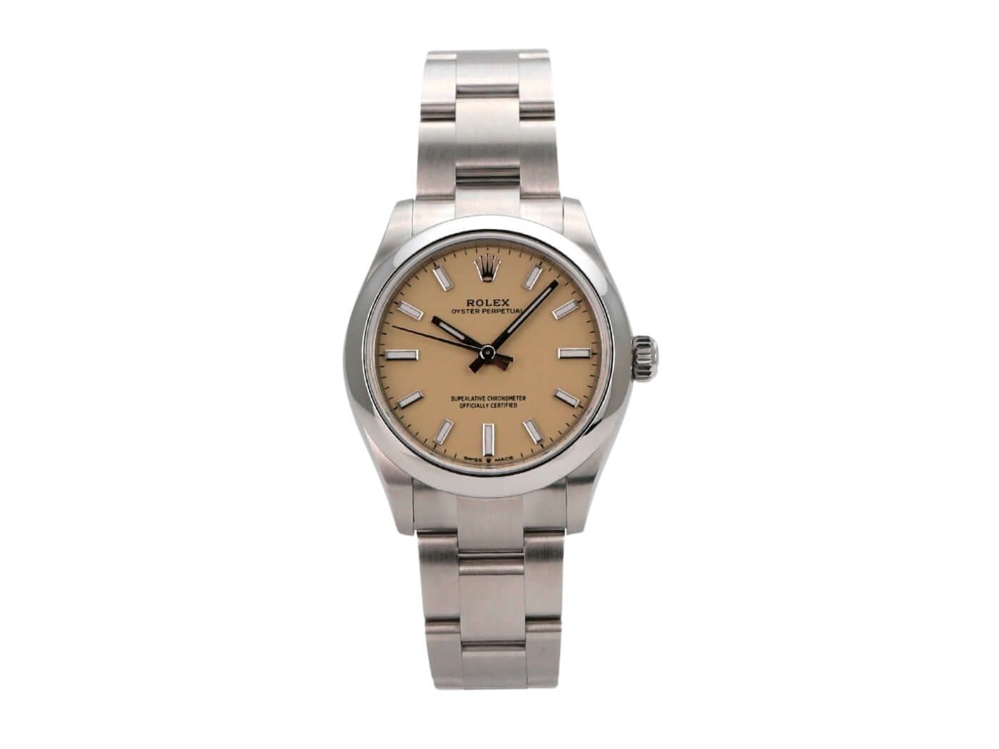 Rolex Oyster Perpetual 31 Ref. 277200 BeigeCase made of polished and satin-finished stainless steel, case diameter 31 mm, Oyster stainless steel bracelet polished and satin-finished with folding clasp, beige dial with applied luminous indices, luminous hands, automatic, Rolex manufacture caliber 2232, 55 hours power reserve, chronometer, sapphire crystal, water-resistant up to 10 bar.