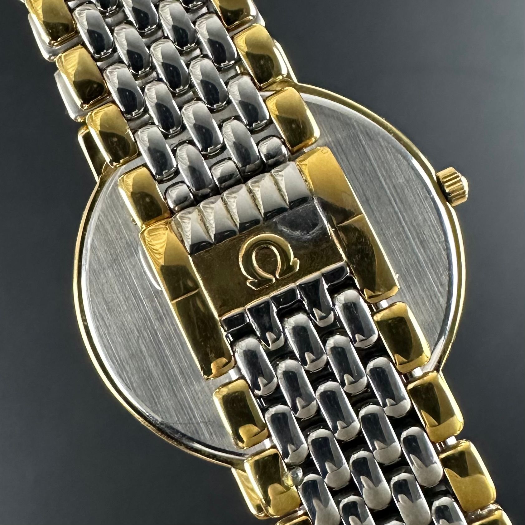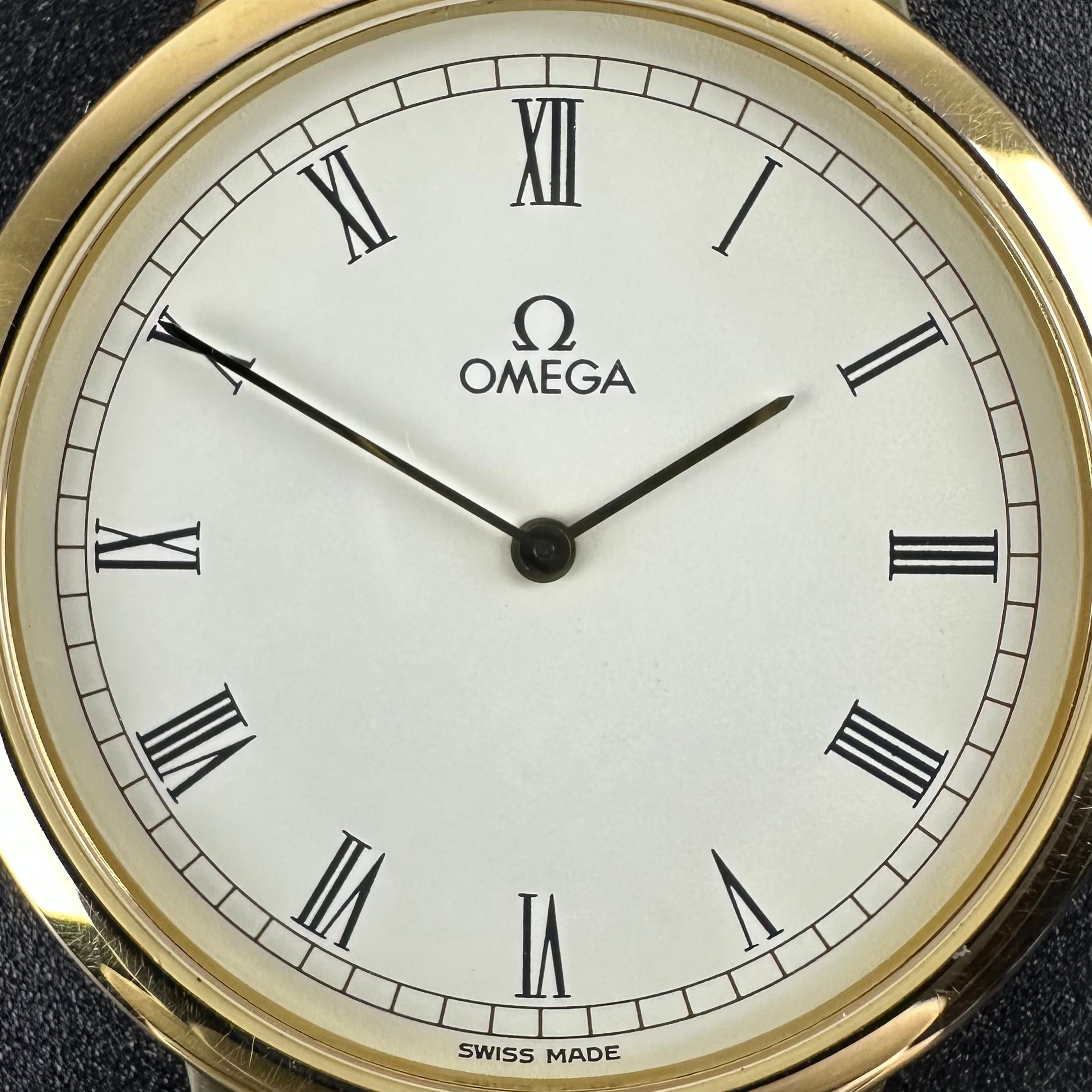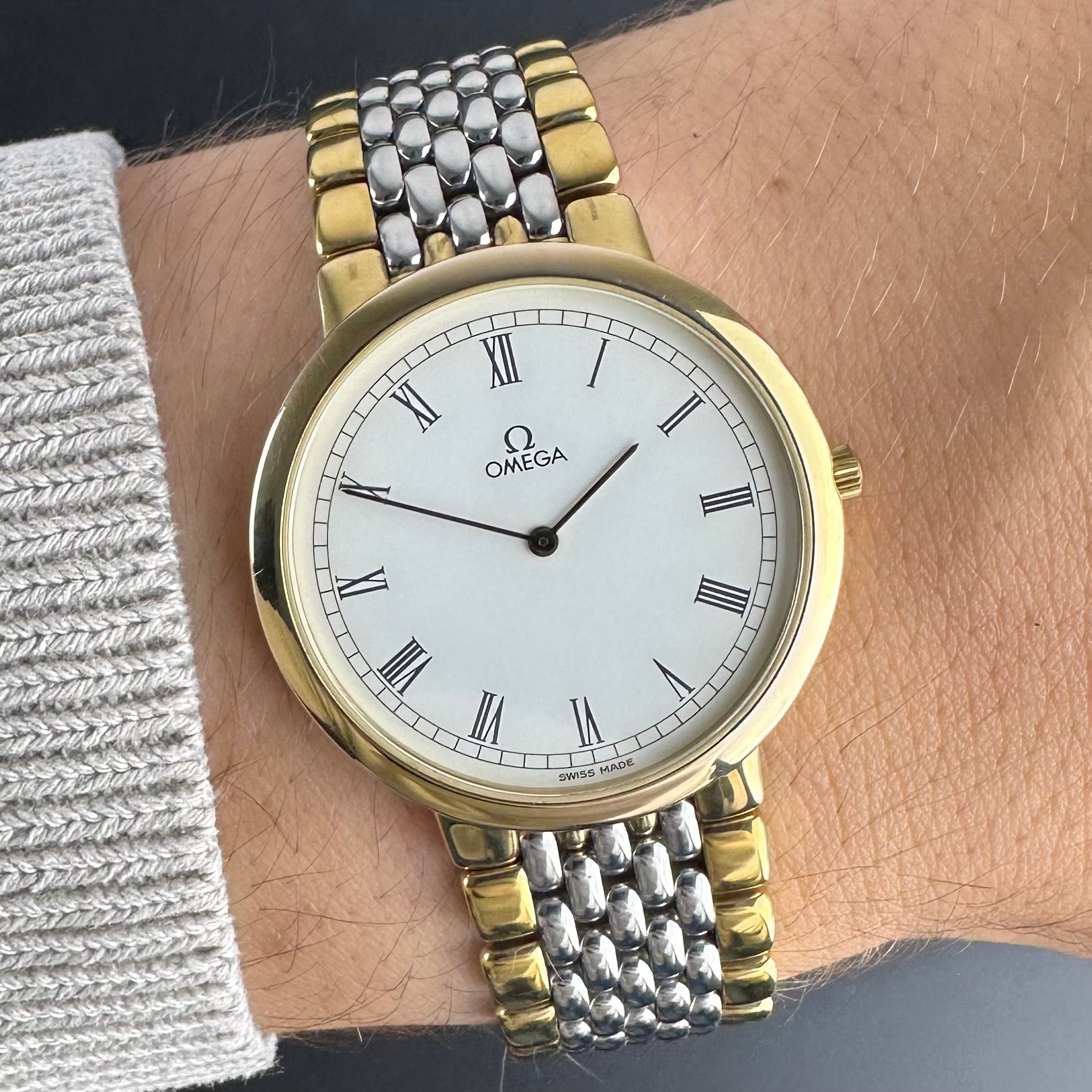 This vintage Omega De Ville “Ile de France” was produced in 1991 and features a white dial with Roman numerals, golden hands, and a gold-plated 32,5mm case, an elegant size suitable for both men’s and ladies’ wrists. Its ultra-thin 4,3mm profile is made possible by the quartz caliber 1378 movement, which was overhauled in October 2025.The watch comes on its original Omega bracelet, which remains in incredible condition with no gold fading. There is a mark on the buckle, but otherwise, the overall condition is excellent.