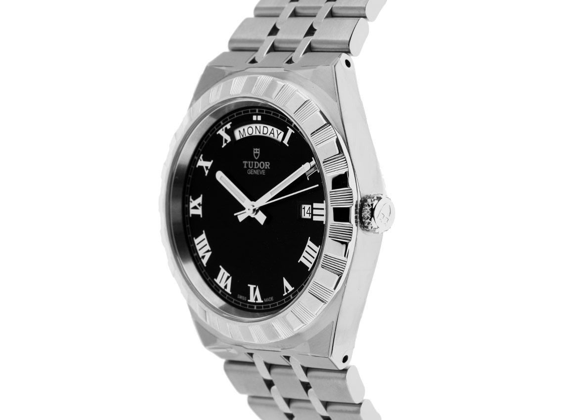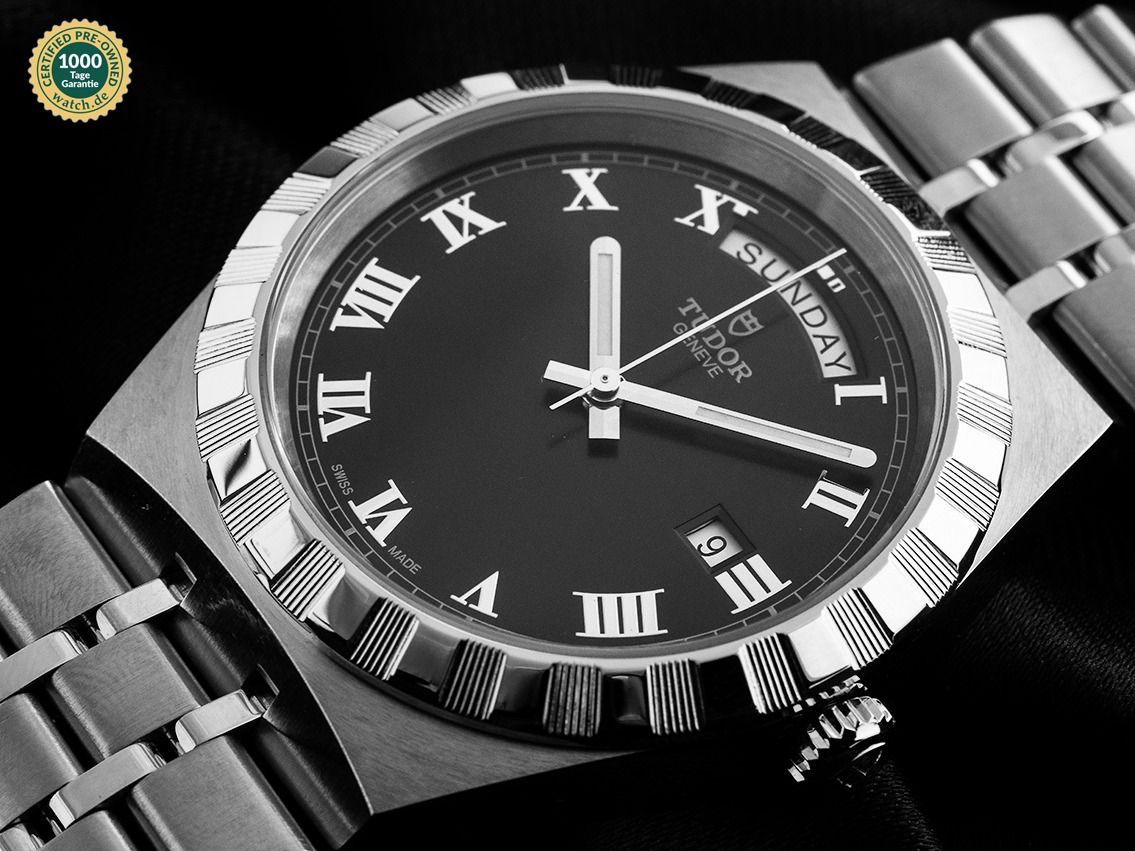 Tudor Tudor Royal Stahl Automatik Armband StahlGehäuse Edelstahl satiniert und poliert, Gehäusedurchmesser ohne Krone 41mm, Gehäusehöhe 10,6mm. Lünette Edelstahl geriffelt und poliert. Armband Edelstahl satiniert und poliert, Sicherheitsfaltschließe Edelstahl mit Hersteller-Logo. Zifferblatt schwarz mit aufgesetzten römischen Edelstahl Ziffern und Edelstahl Leuchtzeigern. Uhrwerk Automatik, Chronometer mit Zeugnis, Kaliber T603 mit 25 Edelsteinen, Gangreserve ca. 38 Stunden. Anzeige von Stunde, Minute und Sekunde über Zeiger aus der Mitte mit Sekundenstopp zur sekundengenauen Einstellung der Uhrzeit, Wochentaganzeige in Englisch bei 12 Uhr, Datumsanzeige mit Schnellverstellung bei 3 Uhr. Saphirglas kratzfest. Krone verschraubbar mit Hersteller-Logo. Boden Edelstahl verschraubt und graviert. Gewicht der Uhr inklusive Armband 153g, Länge des Armbandes inklusive Gehäuse 195mm. Wasserdicht bis 10 ATM. Referenznummer: M28600-0003, ID: ST116039601025H-2700, Artikelnummer: 10000082887. Original Tudor Box mit Umkarton und Garantie Papiere von Oktober 2025 sowie Beschreibung, Full Set. Ungetragen. Lieferzeit sofort.