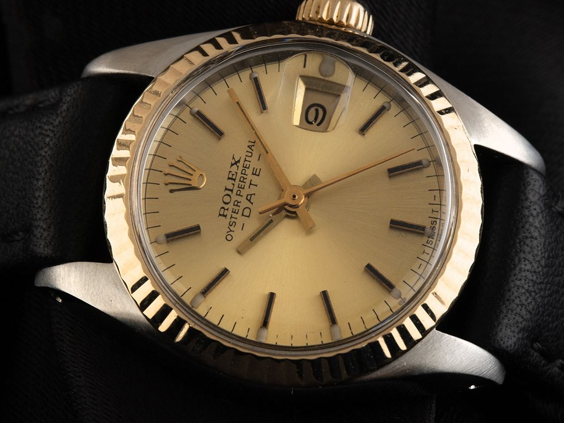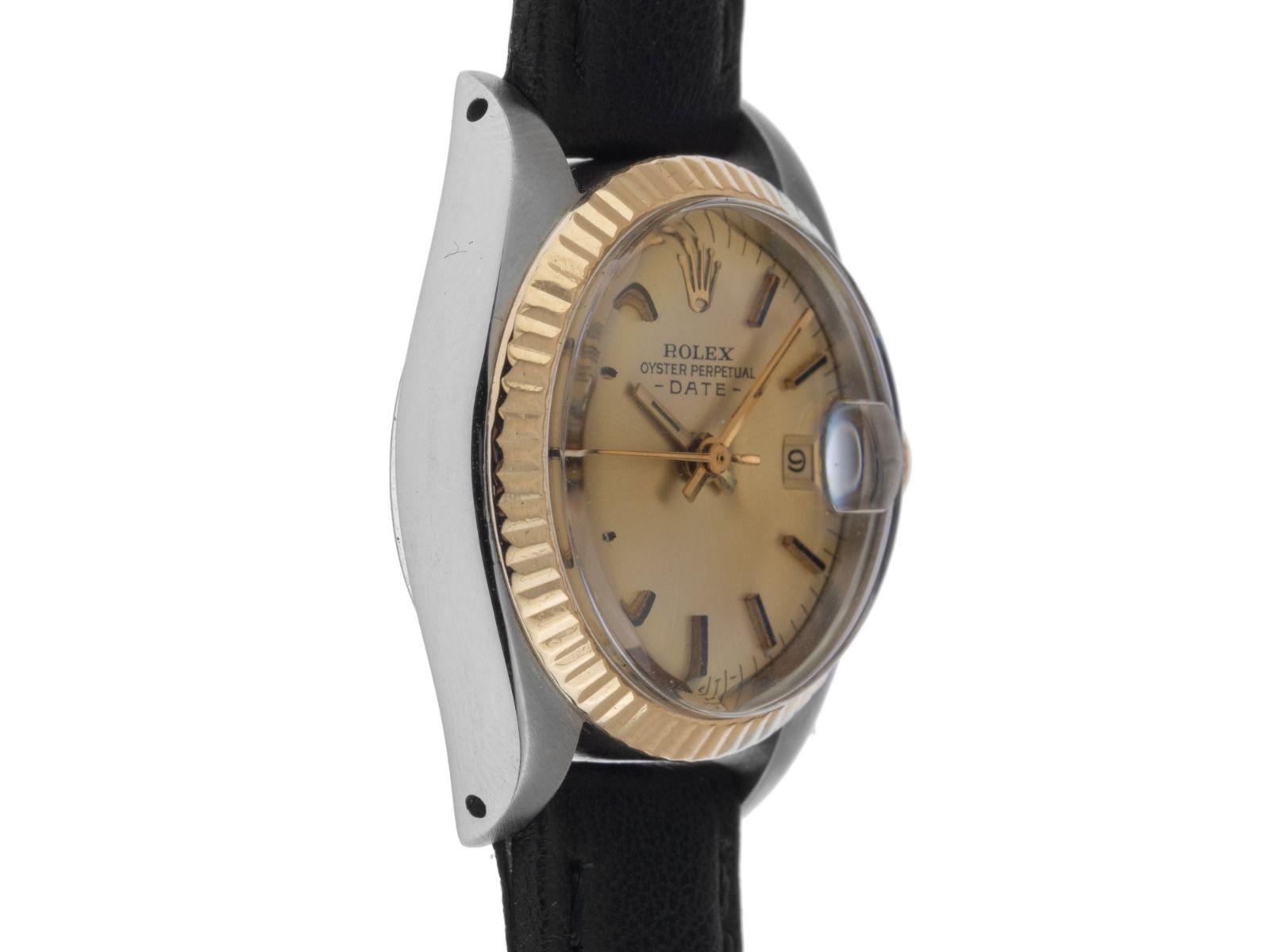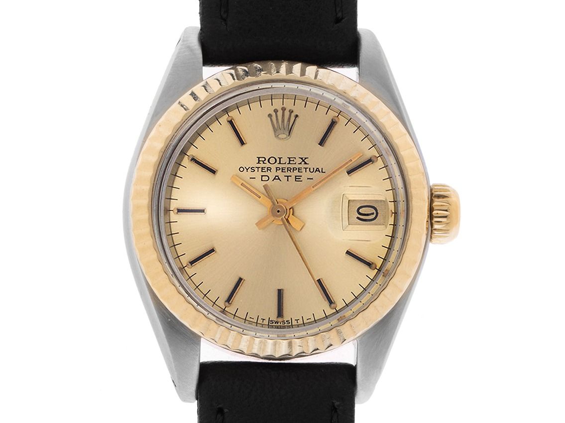 Caixa em aço polido e acetinado, diâmetro da caixa sem coroa 26mm, altura da caixa 11,7mm. Luneta em ouro amarelo 18kt estriada e polida. Bracelete de couro preto com costura decorativa, largura da alça 13mm, fecho de pino em aço dourado. Mostrador na cor champanhe com índices em ouro amarelo aplicados e ponteiros em ouro amarelo. Movimento automático, calibre de manufatura Rolex 2030 com 28 pedras preciosas. Exibição de horas, minutos e segundos através de ponteiros centrais com parada de segundos para ajuste preciso da hora, exibição da data sob lente de aumento às 3 horas, open 6/9 (seis e nove abertas na exibição da data). Vidro de safira resistente a riscos. Coroa rosqueada com logotipo do fabricante. Fundo em aço rosqueado e gravado. Peso do relógio incluindo o bracelete 28g. Número de referência: 6917, ano de fabricação: 1982, número da caixa: 7081XXX, ID: P179653181025RE-5900, número do artigo: 10000082834. Com controle de precisão e completa restauração externa de outubro de 2025. Caixa original da Rolex com embalagem e descrição, estojo de couro, manual de tradução, selo de cronômetro Rolex e extrato do Watch Register de outubro de 2025, Certificado do Watch Register / sem registro (Banco de dados internacional para relógios perdidos ou roubados), incluindo nota fiscal. Super oferta, investimento com potencial de valorização. Muito bom estado. Prazo de entrega imediato.