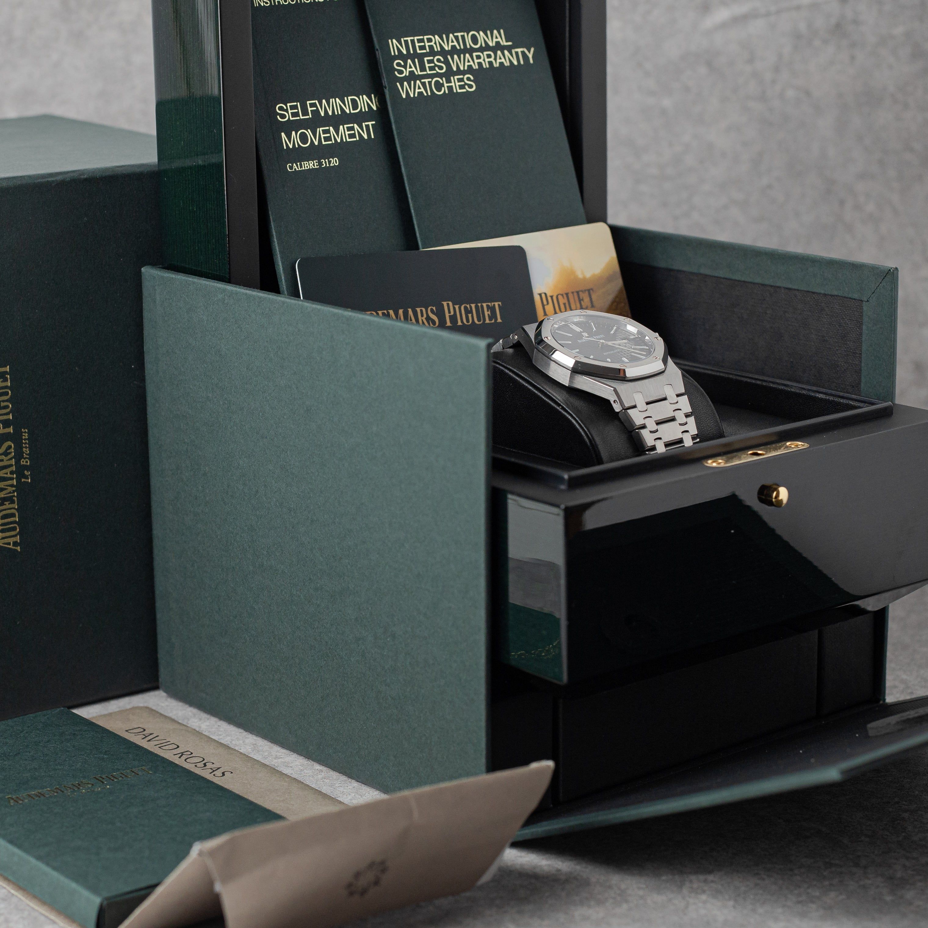 The Audemars Piguet Royal Oak 15400ST is a true icon, featuring the unmistakable Grande Tapisserie black dial and a 41mm stainless steel case. This example comes as a Full Set with full links and the original Portuguese invoice, reflecting its excellent provenance. In very good condition, it represents the perfect blend of sporty sophistication and timeless elegance, making it a must-have for collectors and enthusiasts alike.