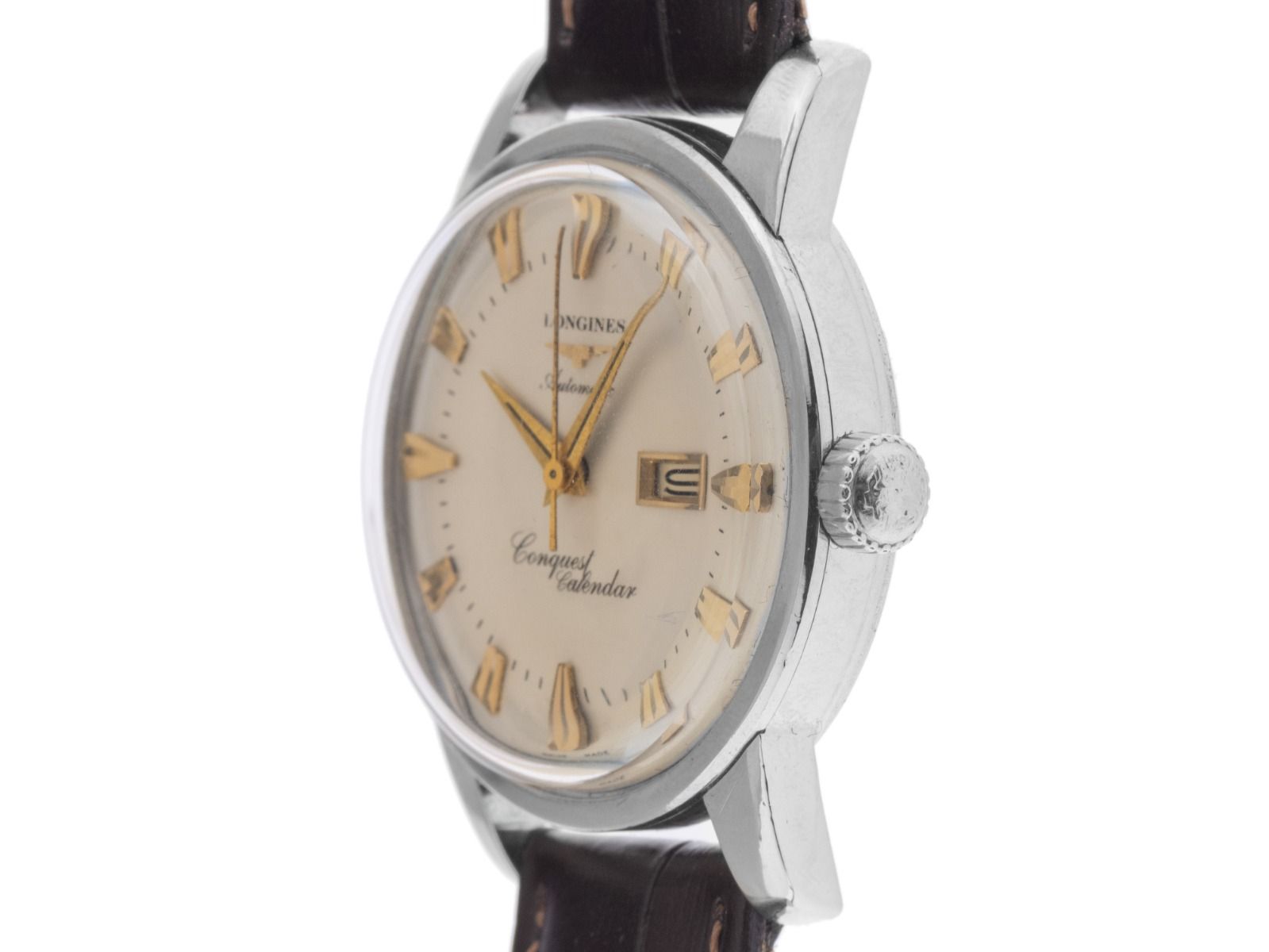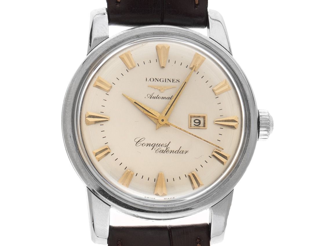 Longines Conquest Calendar Reduced Stahl Automatik Armband LederGehäuse Edelstahl poliert, Gehäusedurchmesser ohne Krone 35mm, Gehäusehöhe 14,1mm. Lünette Edelstahl glatt und poliert. Armband Leder braun mit Ziernaht, Anstoßbreite 18mm, Stiftschließe Edelstahl. Zifferblatt silberfarben mit aufgesetzten gelbgoldenen Indexen und gelbgoldenen Zeigern. Uhrwerk Automatik, Kaliber Longines 19ASD. Anzeige von Stunde, Minute und Sekunde über Zeiger aus der Mitte, Datumsanzeige bei 3 Uhr. Plexiglas. Krone geriffelt mit Hersteller-Logo. Boden Edelstahl verschraubt und graviert. Gewicht der Uhr inklusive Armband 54g. Referenznummer: 9004-1, Gehäusenummer: XXX, Baujahr: 1953, ID: P181322001025H-3400, Artikelnummer: 10000082902. Mit Gangkontrolle und kompletter äußerlicher Aufarbeitung von November 2025. Original Longines Service Box sowie Watchregister Auszug von Oktober 2025, The Watch Register Zertifikat / ohne Eintrag (Internationale Datenbank für verlorene oder gestohlene Uhren). Superschnäppchen, extrem seltenes Sammlerstück. Sehr guter Zustand. Lieferzeit sofort.