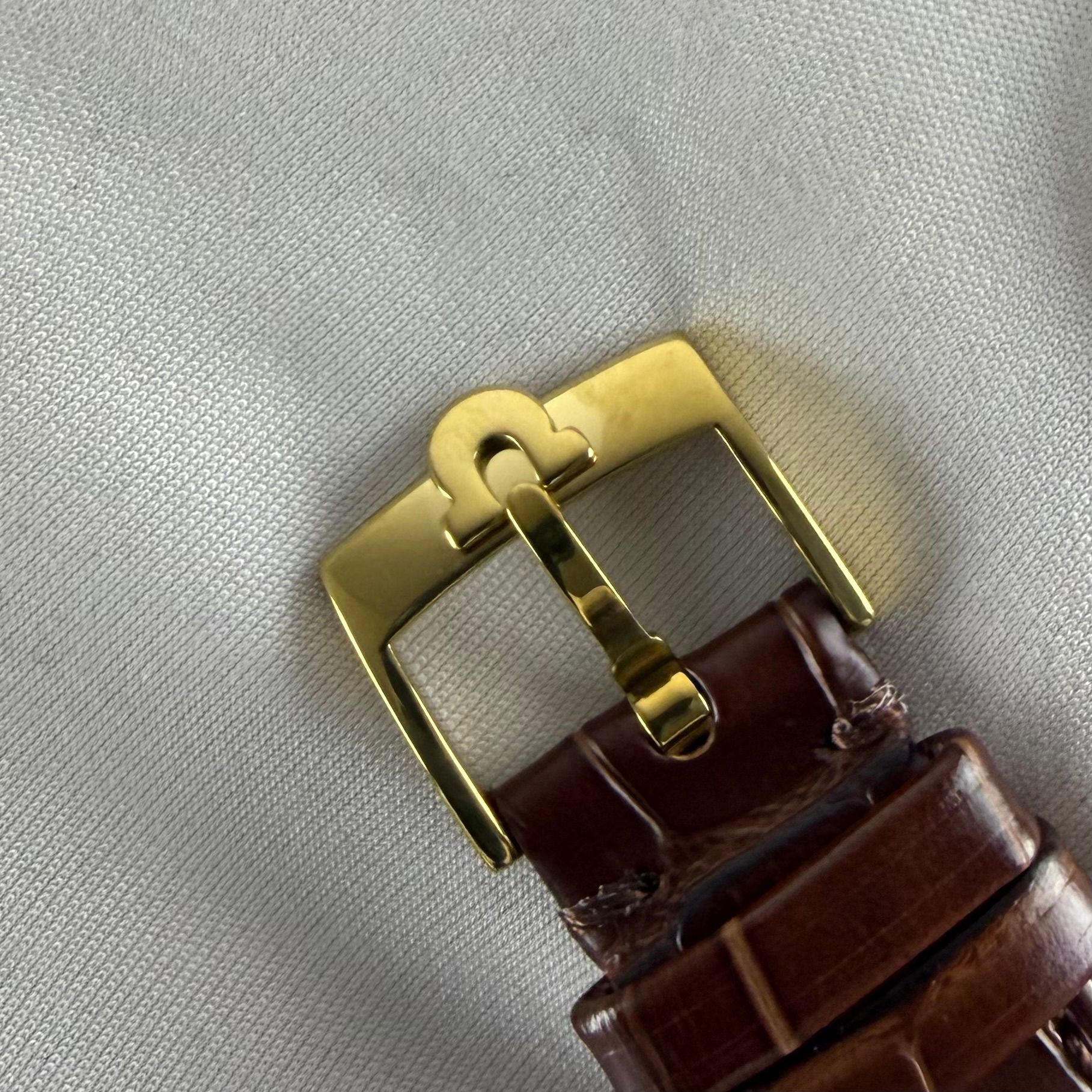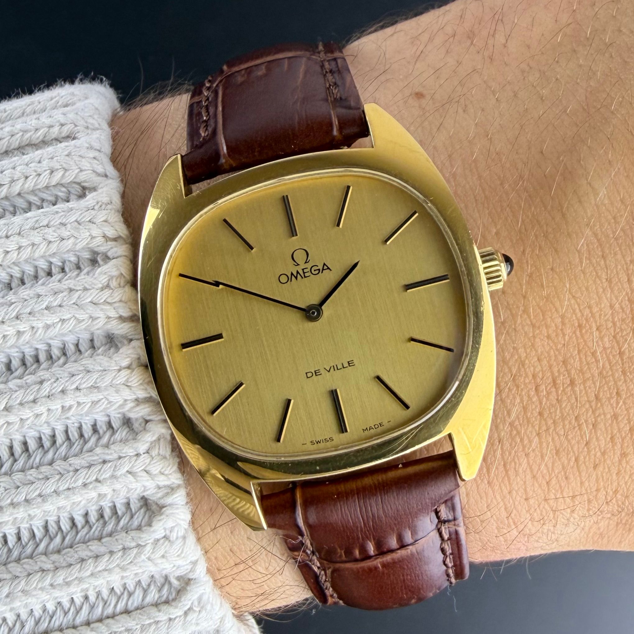This 1977 Omega De Ville features a gold-plated case in excellent condition, with sharp edges and intact gold plating. The golden dial has a fine vertical-lined motif and black accents. It is powered by a Caliber 625 manual-wind movement, serviced in November 2025 and running flawlessly. The watch is fully original except for the newly replaced brown leather strap.Year of production: 1977