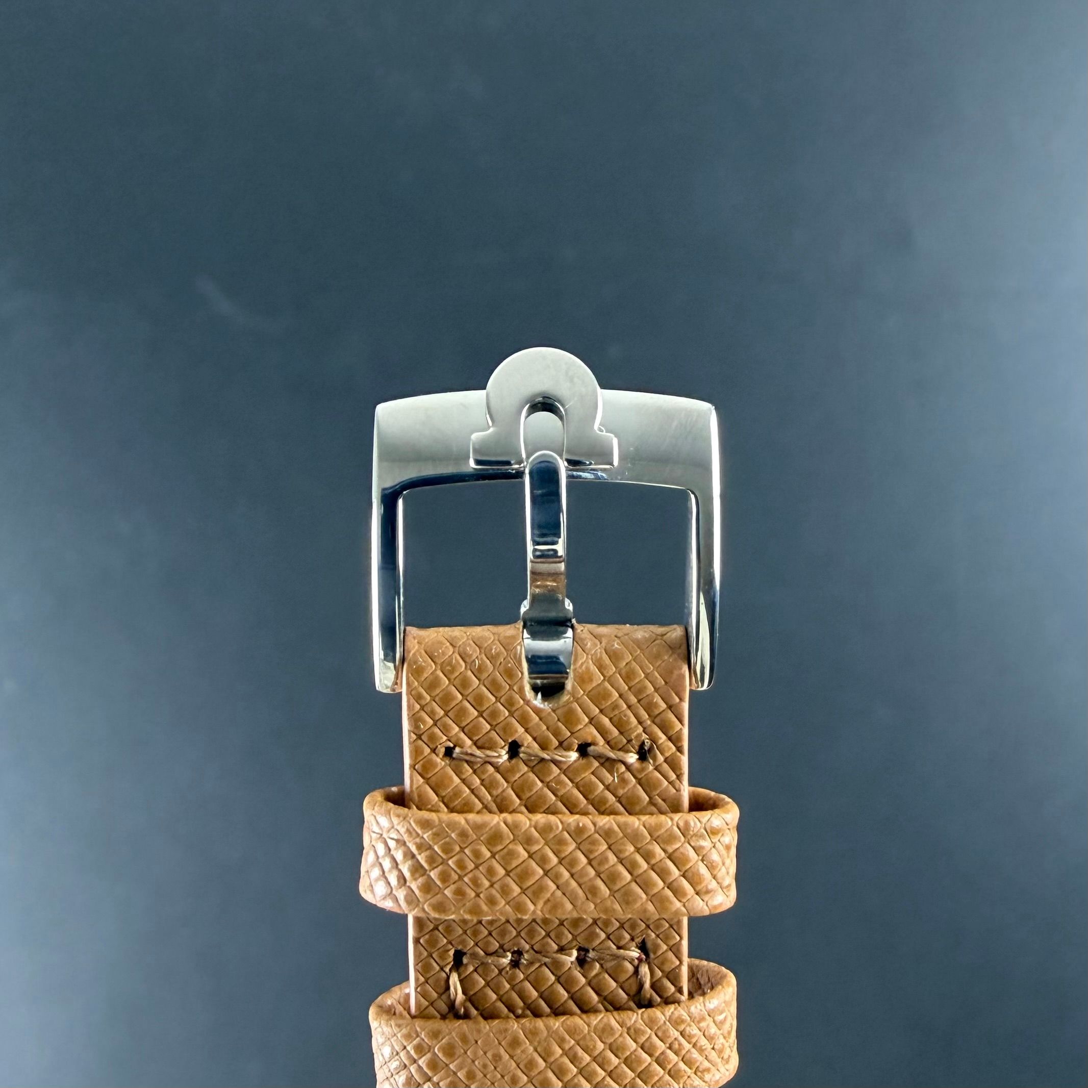 This 1970 Omega Genève is a vintage representation of the early 70s watch craftsmanship. With a 34,5mm steel case and a crisp white sunburst dial, it's both functional and visually appealing. Inside, the caliber 601 movement gives accurate timekeeping as it has been serviced in August 2025. The watch is fitted with a durable brown calf leather strap, making it a reliable and great choice for vintage enthusiasts.Year of production: 1970
