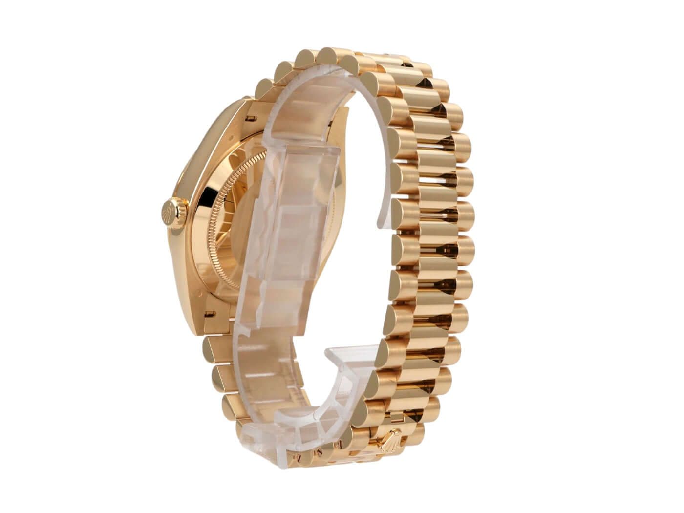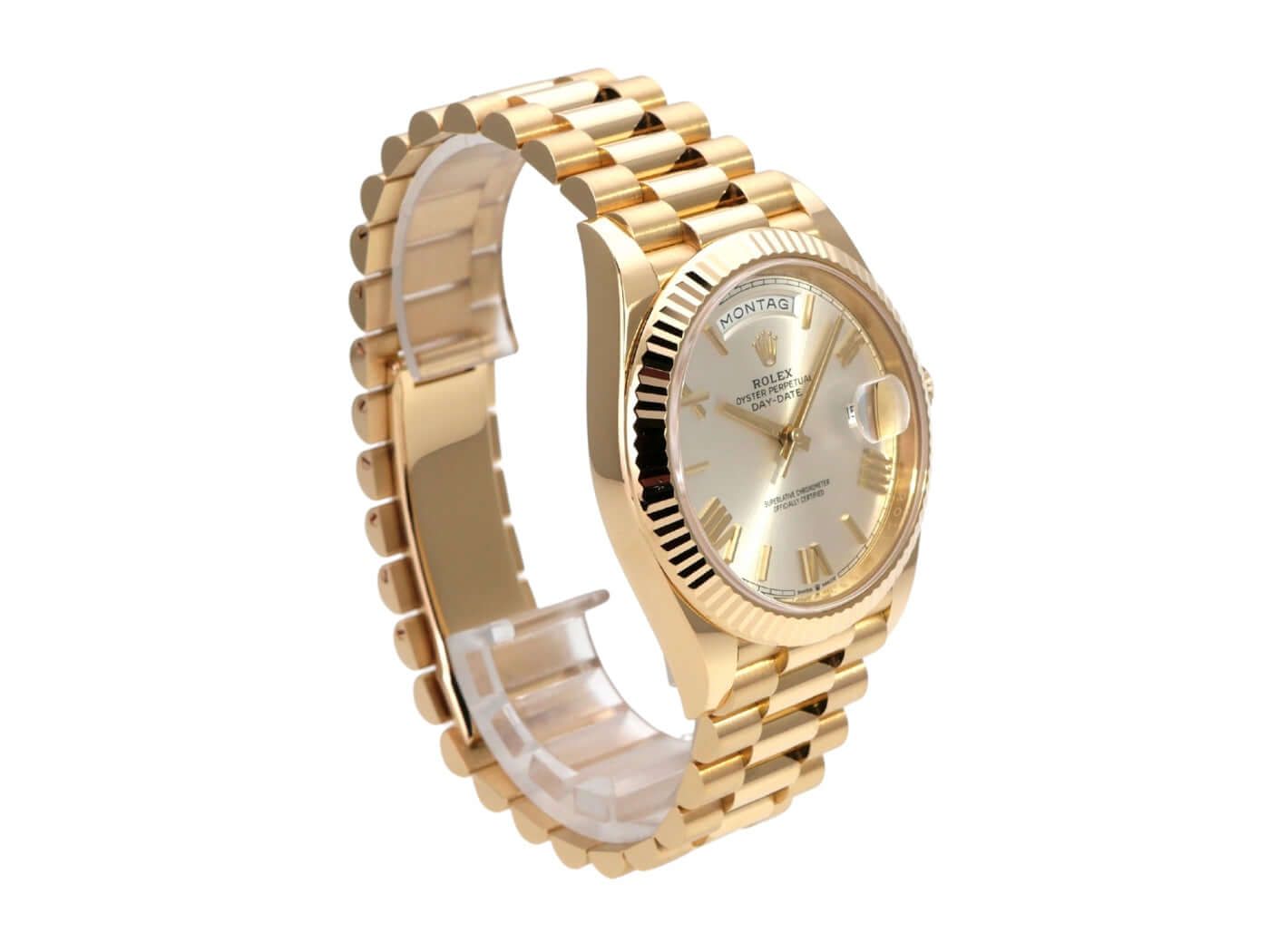 Rolex Day-Date 40 Yellow Gold Ref. 228238 Silver Roman from 2019Case made of polished 18 kt yellow gold, case diameter 40 mm, bezel made of fluted 18 kt yellow gold, President bracelet made of polished and satin-finished 18 kt yellow gold with folding clasp, silver-colored dial with applied gold Roman numerals, automatic movement, chronometer, Rolex manufacture caliber 3255, display of hours and minutes from the center, date with magnifying glass at 3 o'clock, scratch-resistant sapphire crystal, screwed case back made of 18 kt yellow gold, water-resistant up to 10 bar.