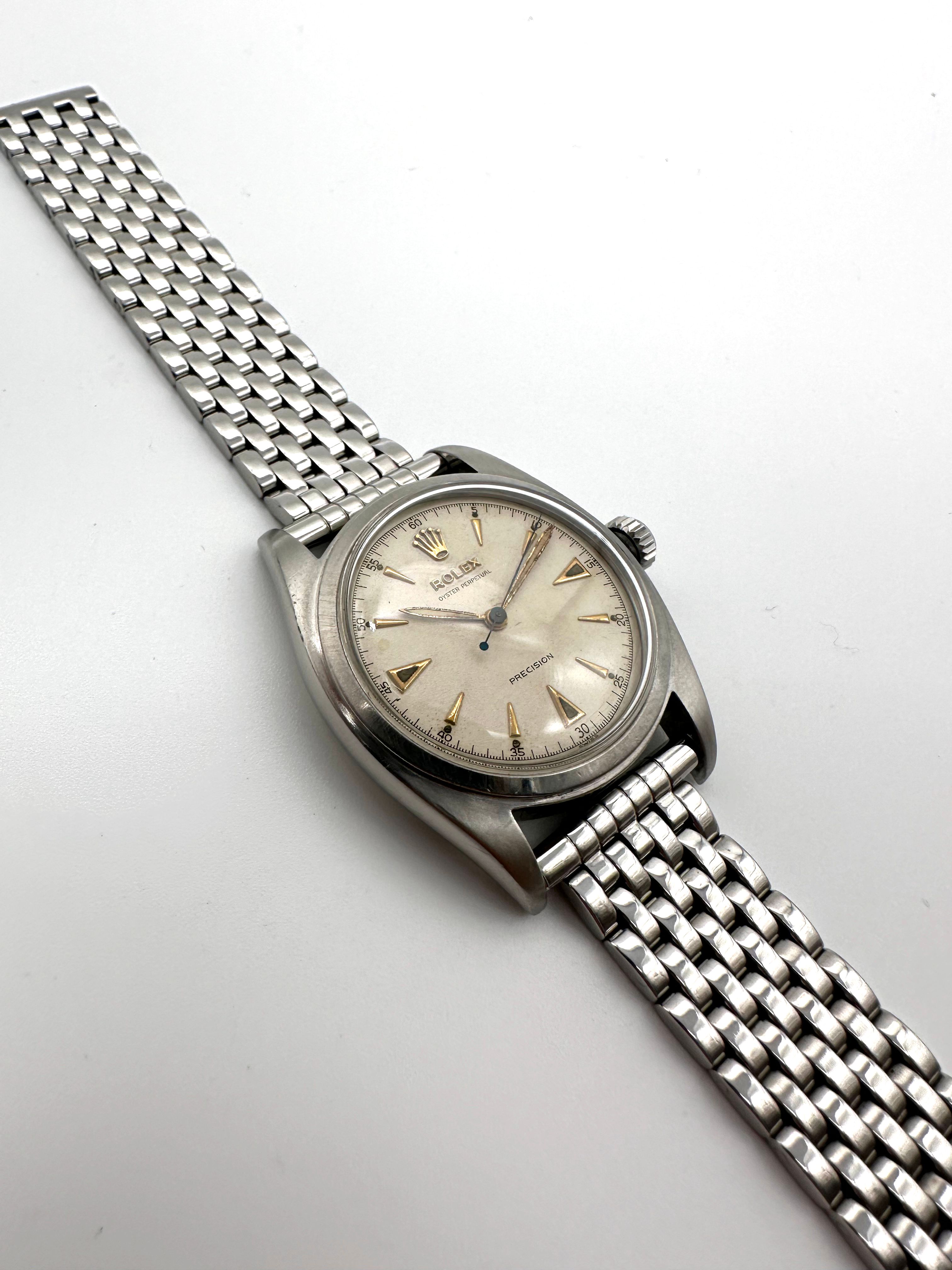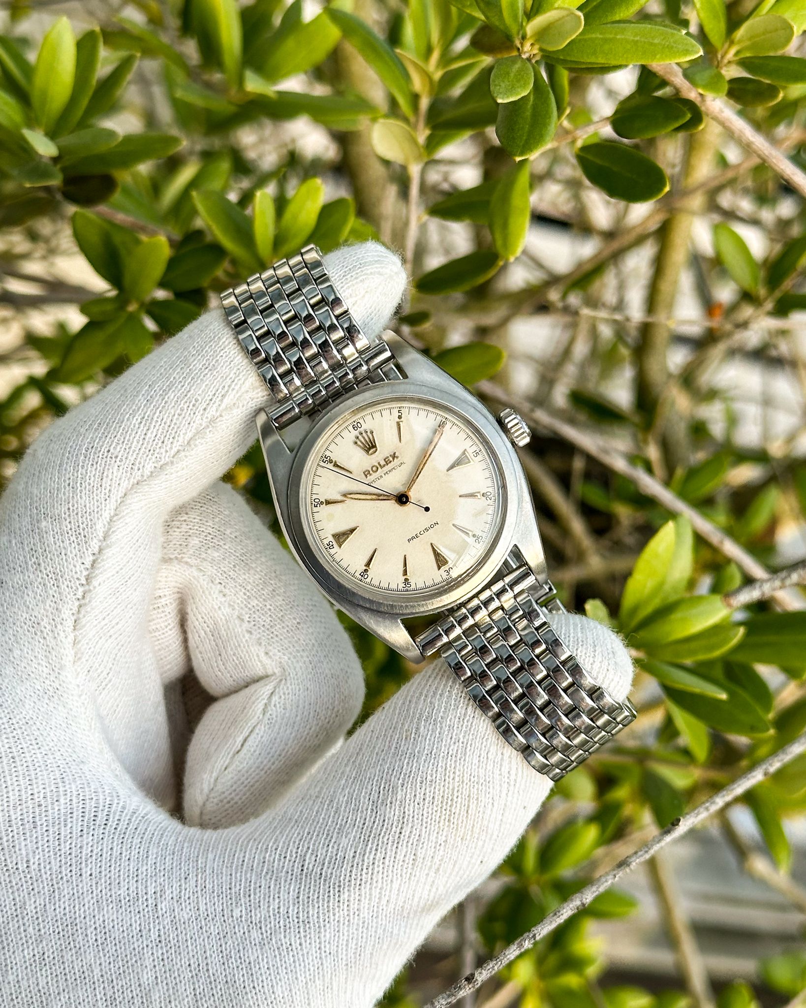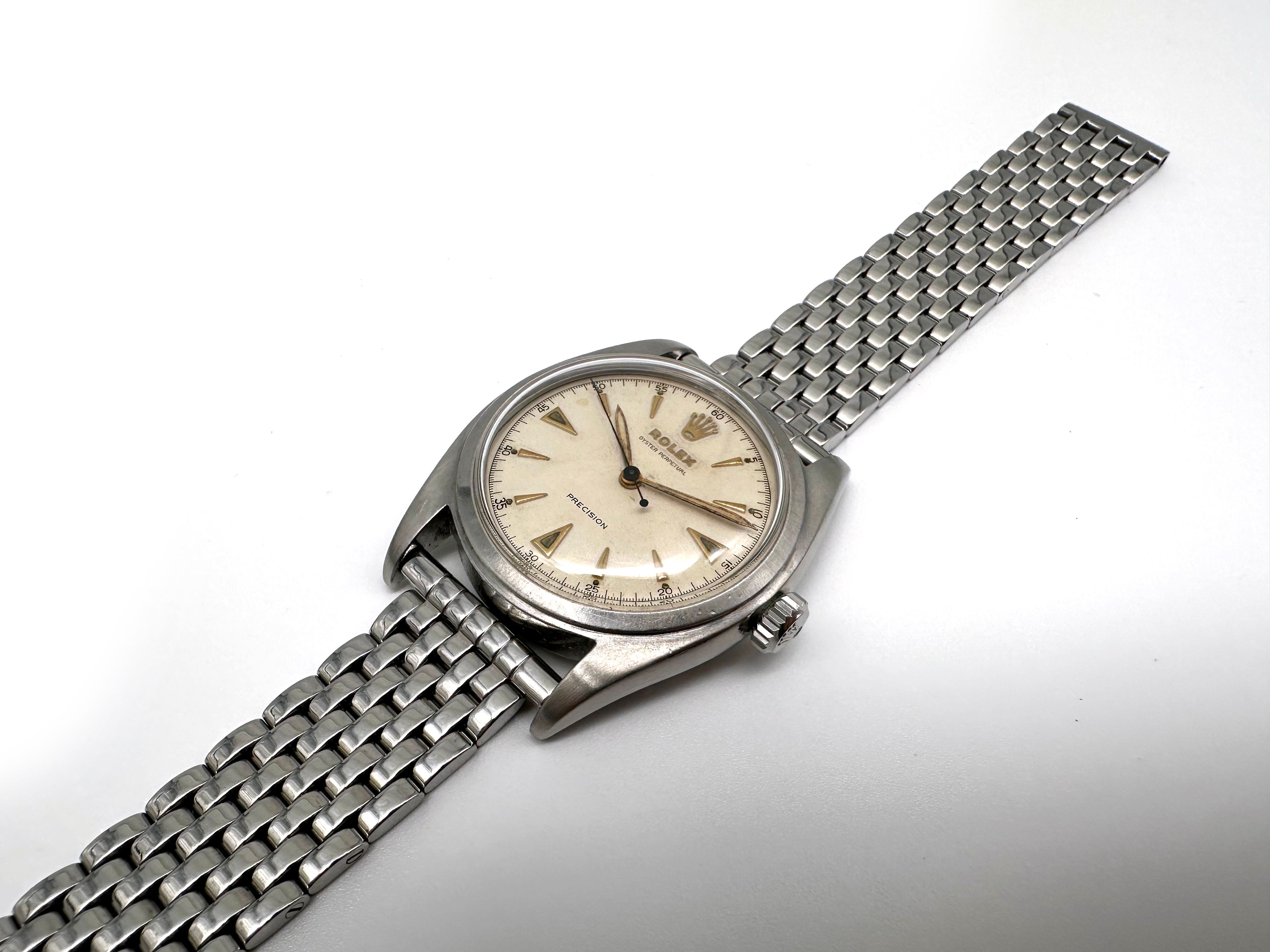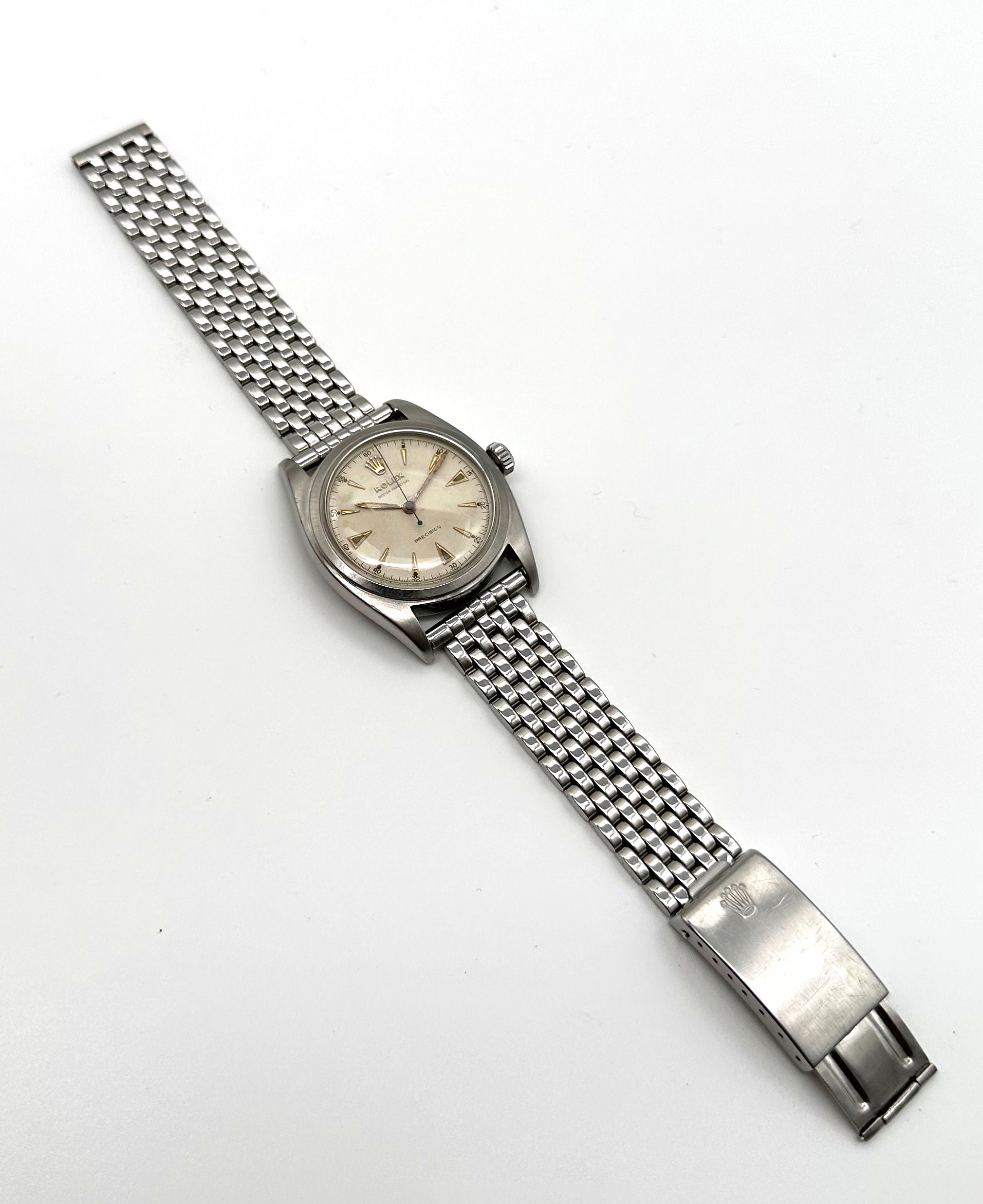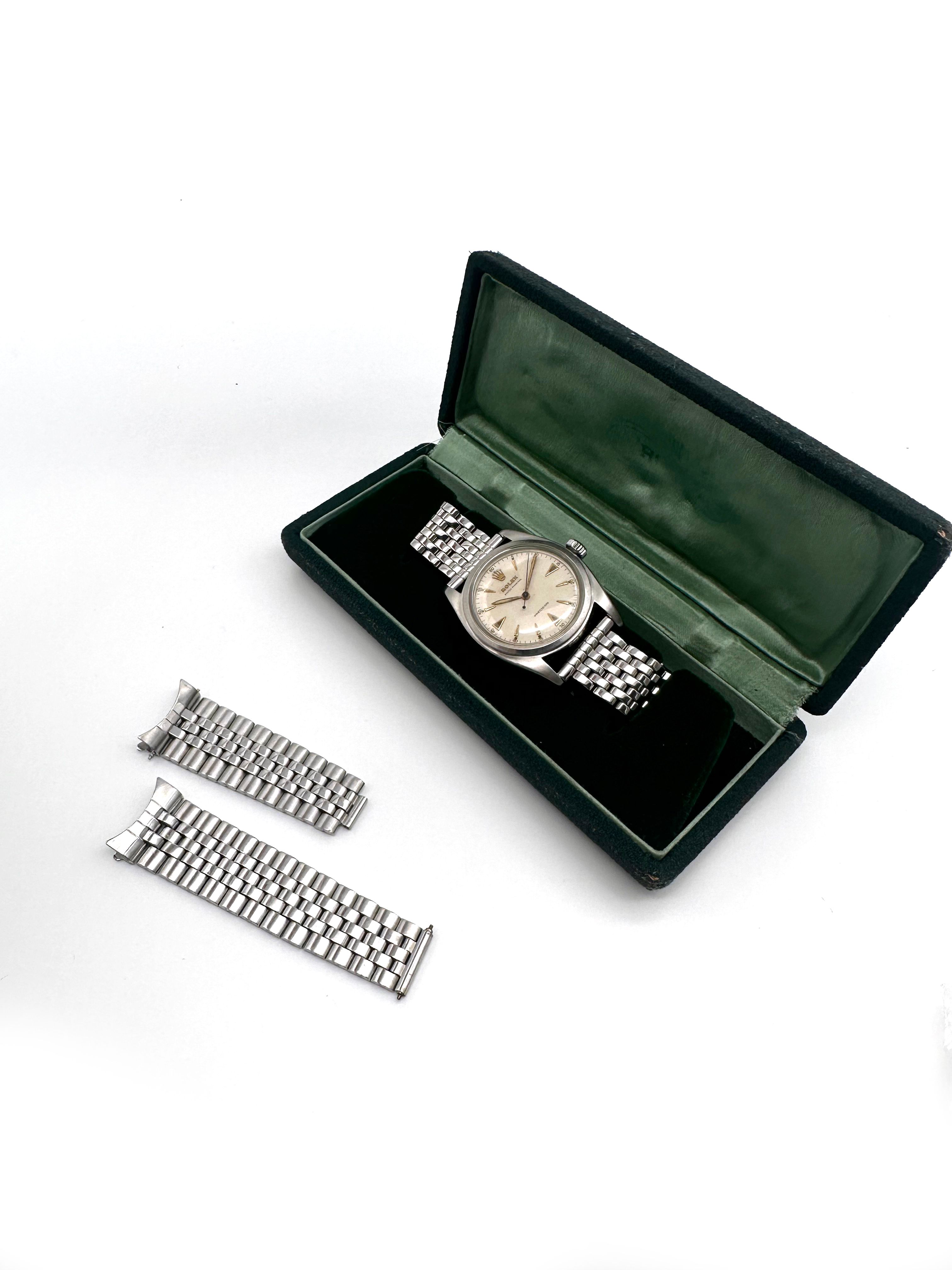 Het hier aangeboden model verkeert in nette staat voor de leeftijd. De wijzerplaat heeft wat patina. Het radium van de uurmarkeringen is verdonkerd. Op de foto's is het horloge voorzien van een Forstner band waarop een Rolex sluiting is gemonteerd. Naast deze band komt het horloge ook met een nieuwe, passende Jubilee-band. Ook wordt het horloge geleverd met een period correct doosje.