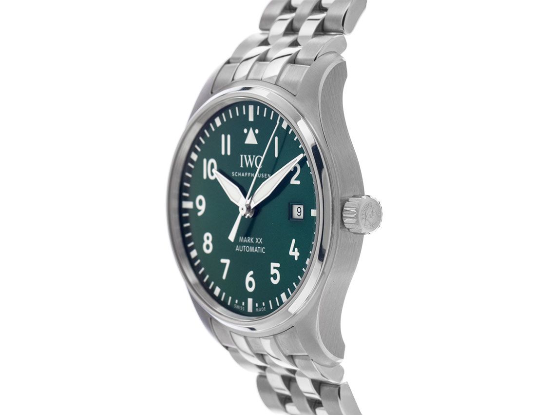 IWC Pilot’s Watch Mark XX Stahl Automatik Armband LederGehäuse Edelstahl poliert und satiniert, Gehäusedurchmesser ohne Krone 40mm, Gehäusehöhe 10,8mm. Lünette Edelstahl glatt und poliert. Armband Edelstahl poliert und satiniert, Faltschließe Edelstahl mit Hersteller-Logo. Zifferblatt grün mit weißen arabischen Leuchtziffern und Leuchtindexen sowie Leuchtzeigern. Uhrwerk Automatik, IWC Manufakturkaliber 32111 mit 21 Edelsteinen, Gangreserve ca. 120 Stunden. Anzeige von Stunde, Minute und Sekunde über Zeiger aus der Mitte mit Sekundenstopp zur sekundengenauen Einstellung der Uhrzeit, Datumsanzeige mit Schnellverstellung bei 3 Uhr. Saphirglas kratzfest. Krone mit Hersteller-Logo. Boden Edelstahl verschraubt und graviert. Gewicht der Uhr inkl. Armband 139g, Länge des Armbandes inklusive Gehäuse 180mm. Wasserdicht bis 10 ATM. Referenznummer: IW328206, ID: ST116098540725H-6700, Artikelnummer: 10000081461. Original IWC Box mit Umkarton und Garantie Papiere von Juli 2025 sowie Beschreibung, Full Set. Ungetragen. Lieferzeit sofort.