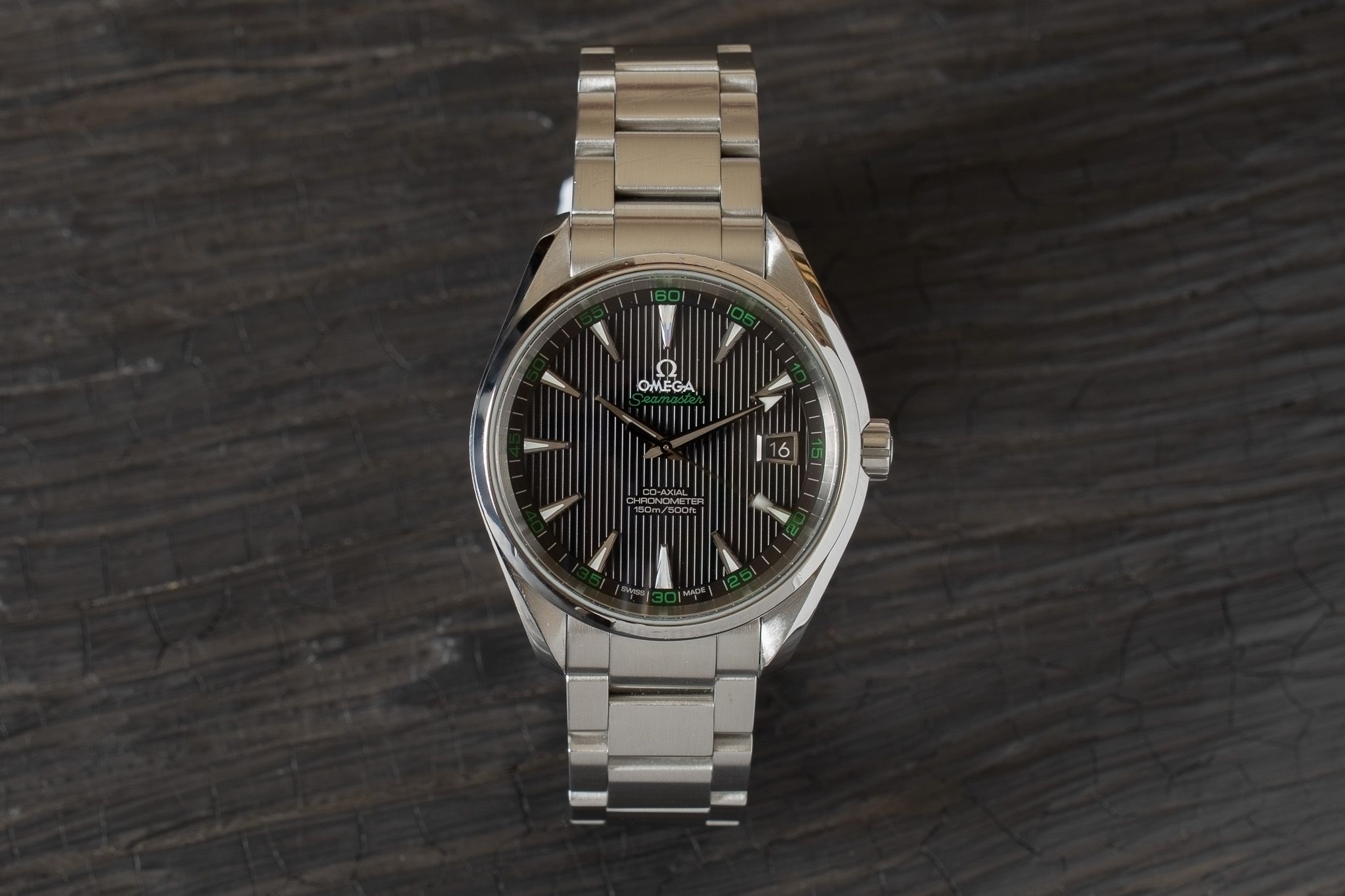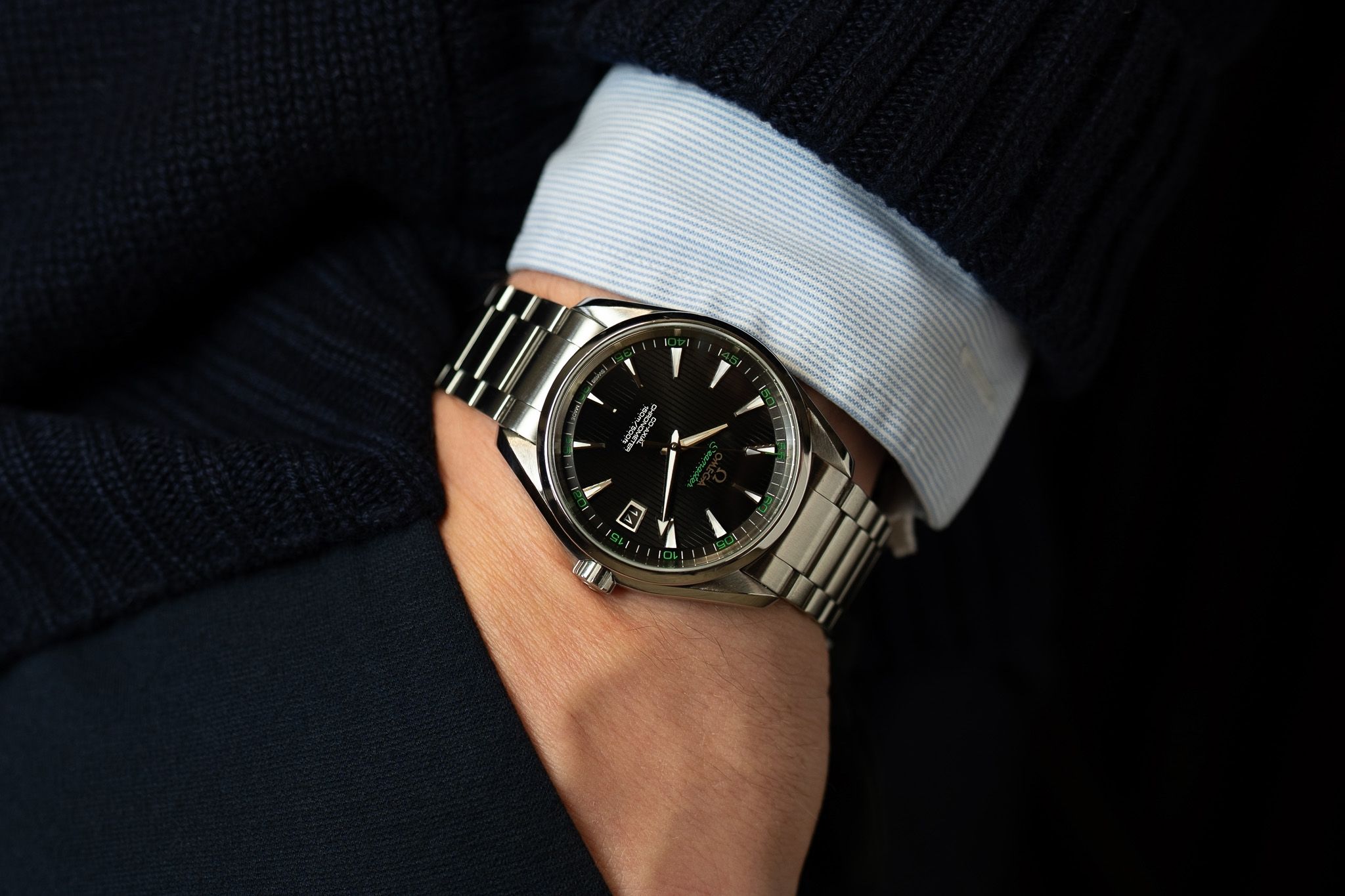 Linda Seamaster na versão “Golf” com detalhes verdes na mostrador e no ponteiro dos segundos.