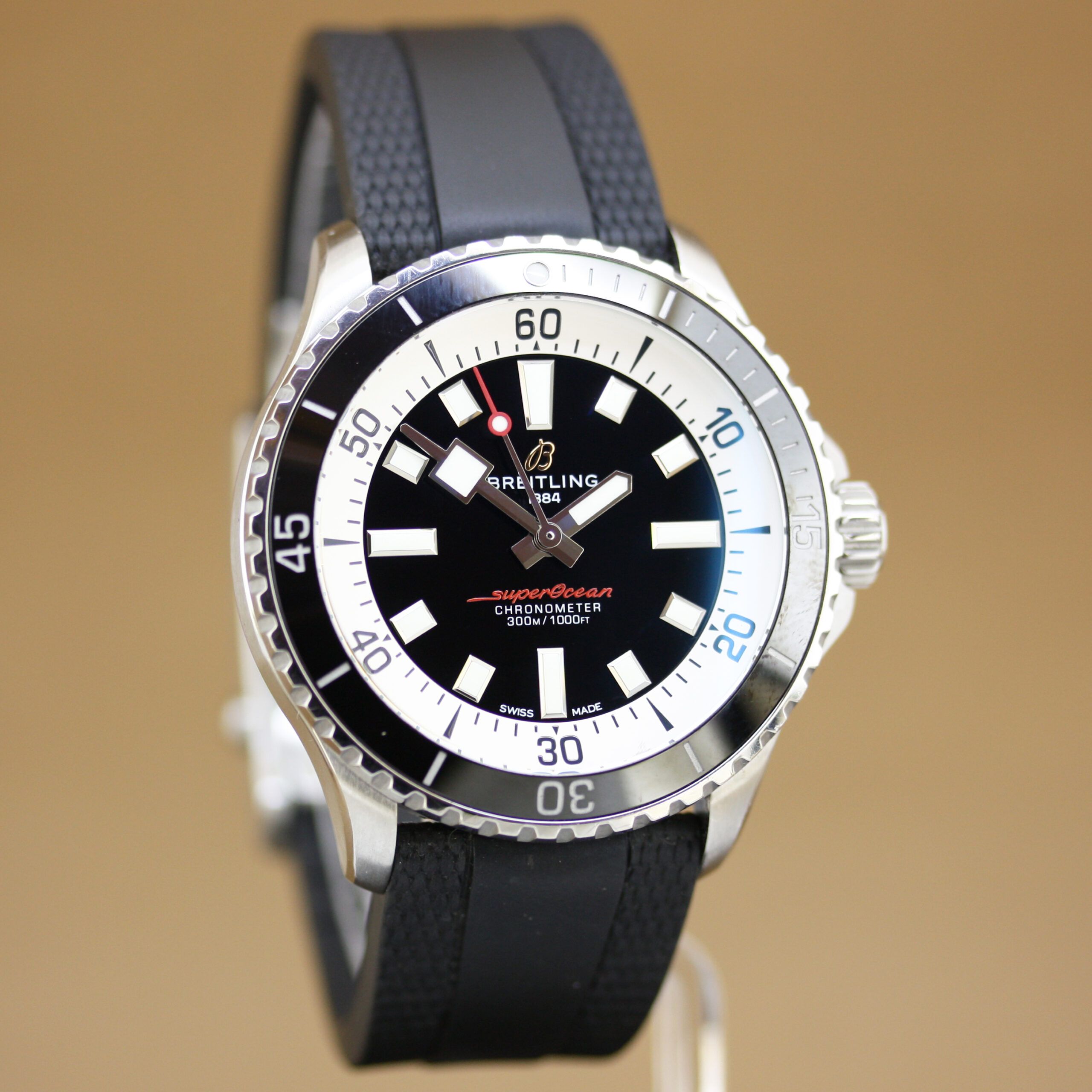 For sale: a Breitling Superocean 42 Automatic, reference A17375, in very good condition.This sporty diving watch features a stainless-steel case and a black dial, giving it a clean and powerful look.
